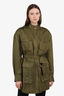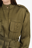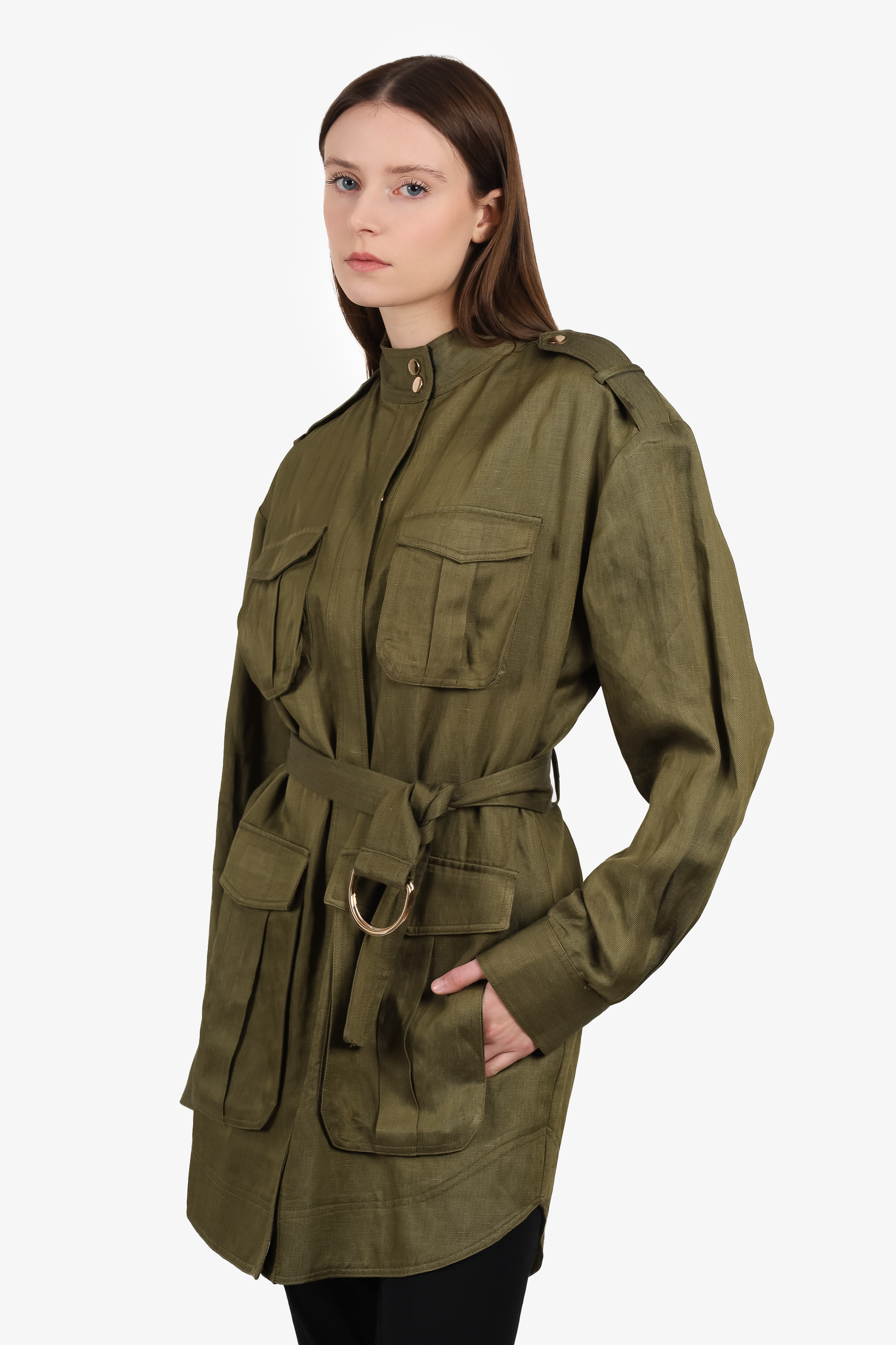 Refresh availabilityShona Joy Green Linen Utility Jacket. Front snap button-up closure. 4 front pockets with fold-over flap. Lined. Tonal stitching. Gold-tone hardware. Removable belt.