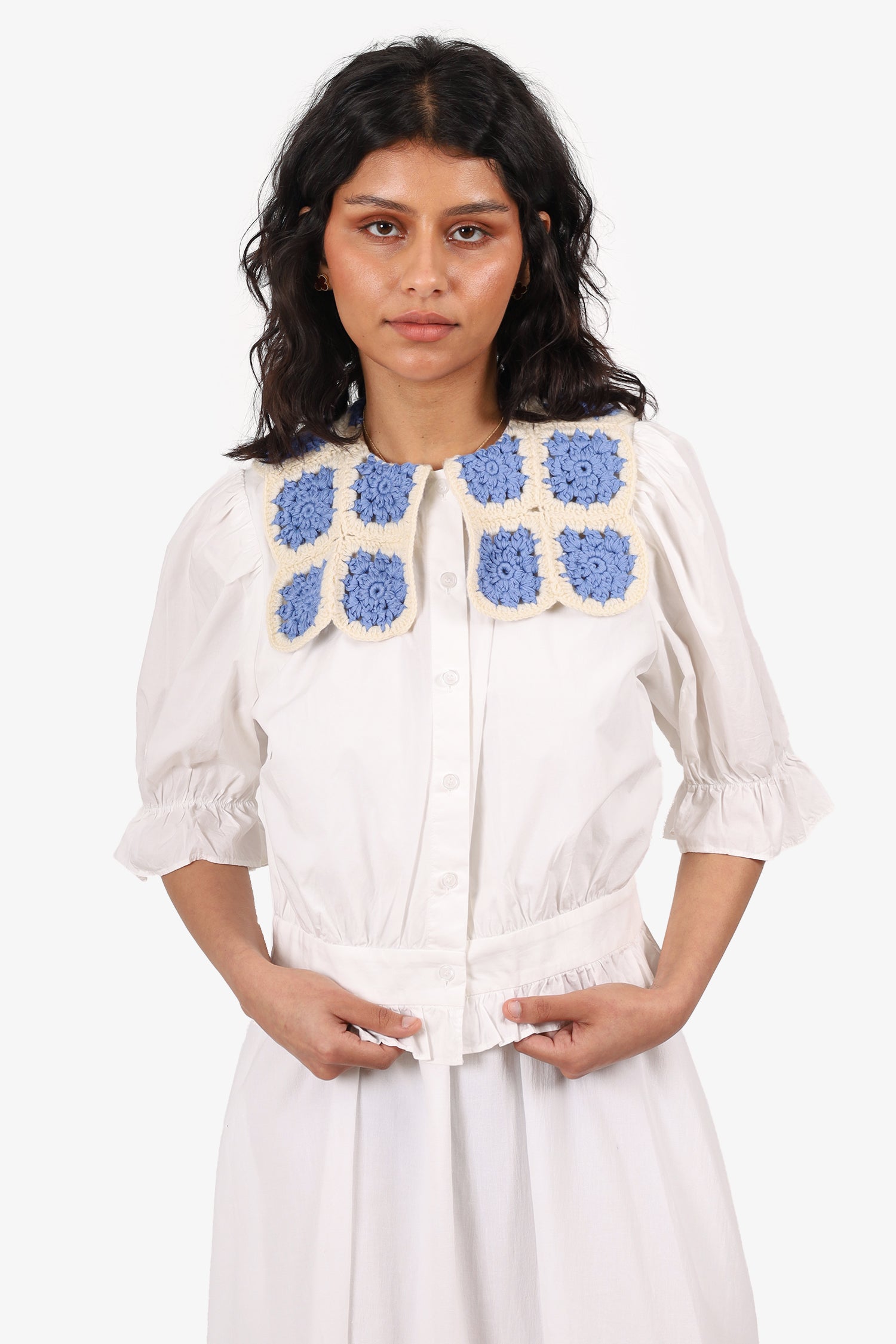 Refresh availabilityShrimps White/Blue Crochet Collar Puff Sleeve Top. Pull-on. Collared-neckline. Front button-up closure. Elasticated sleeve cuffs. Tonal stitching.