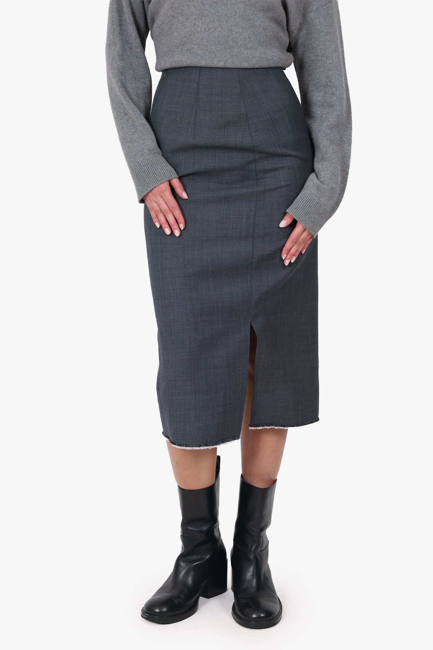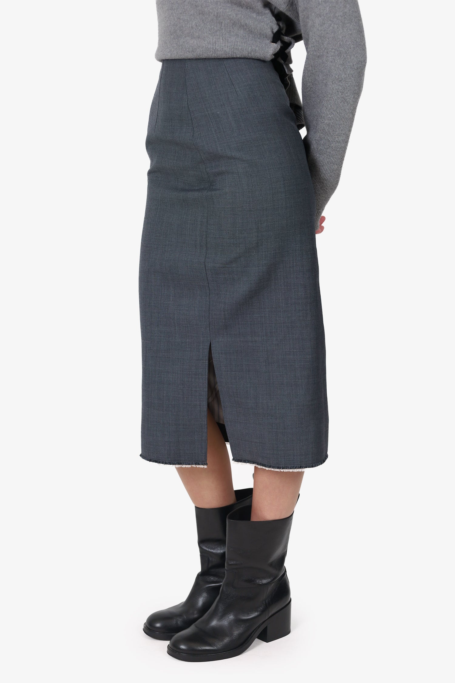 Refresh availabilityShuShu Tong Grey Pencil Skirt. Slip-on. Rear zip closure. Bottom slits. Frayed bottom hem. Tonal stitching.