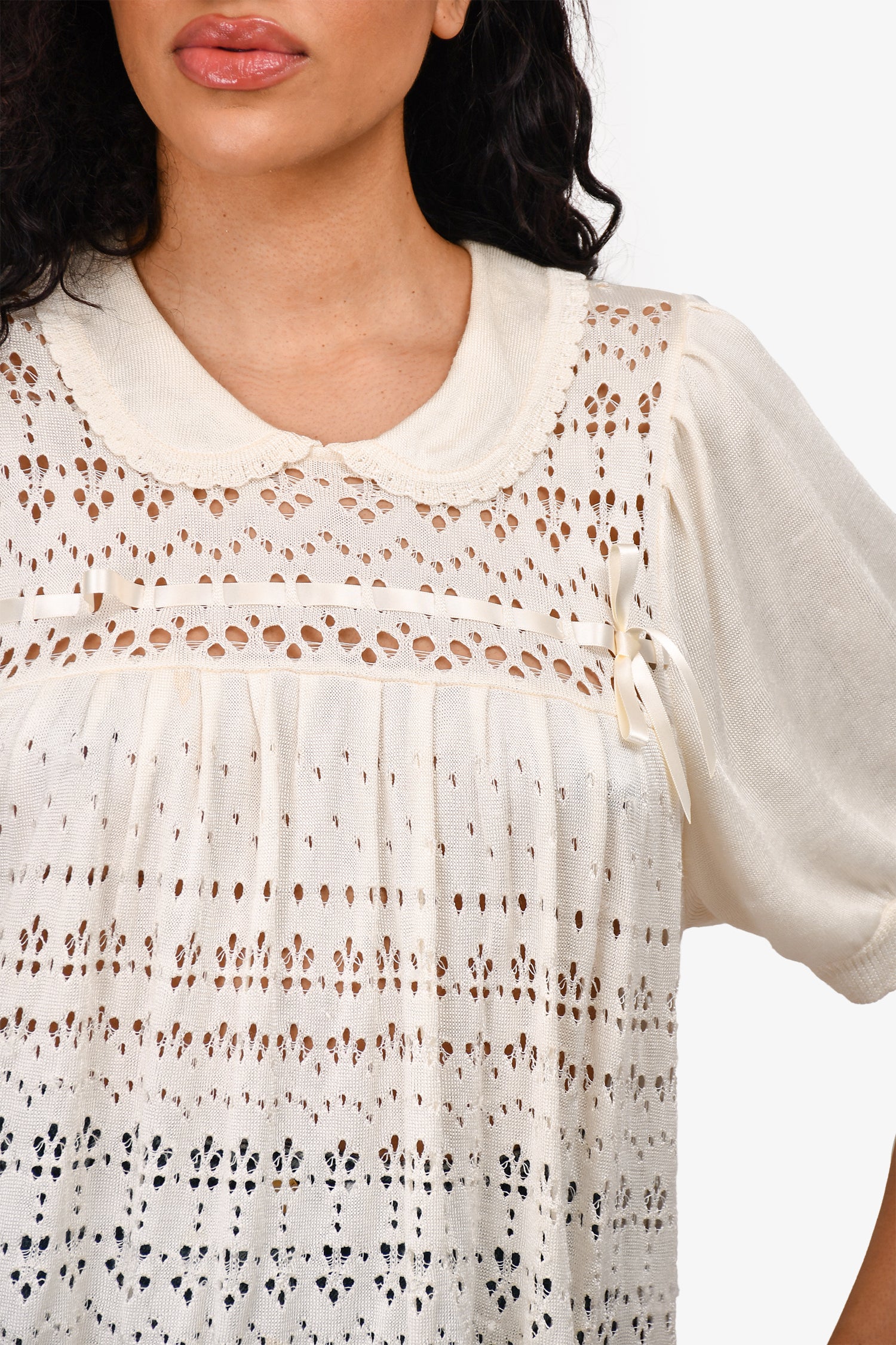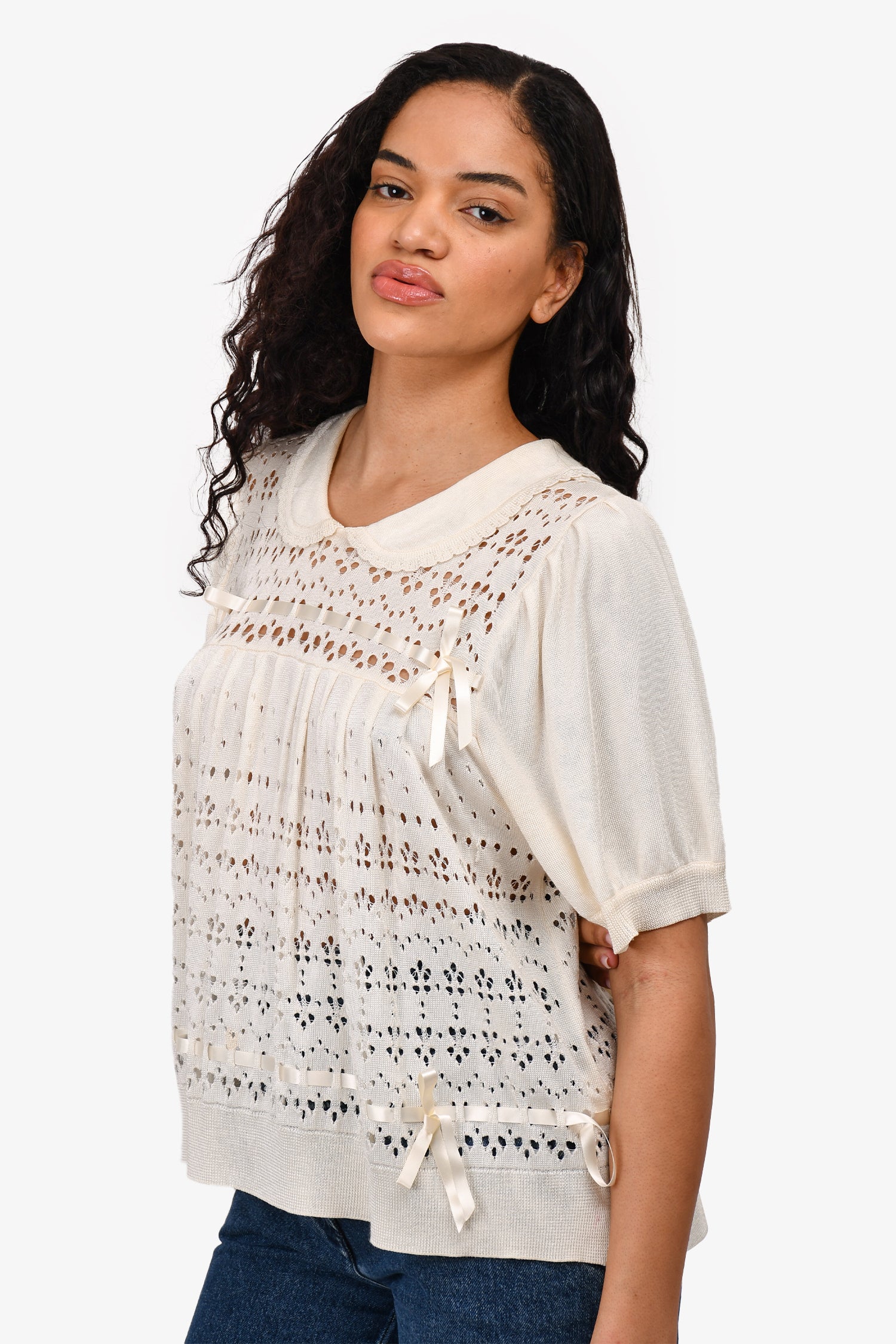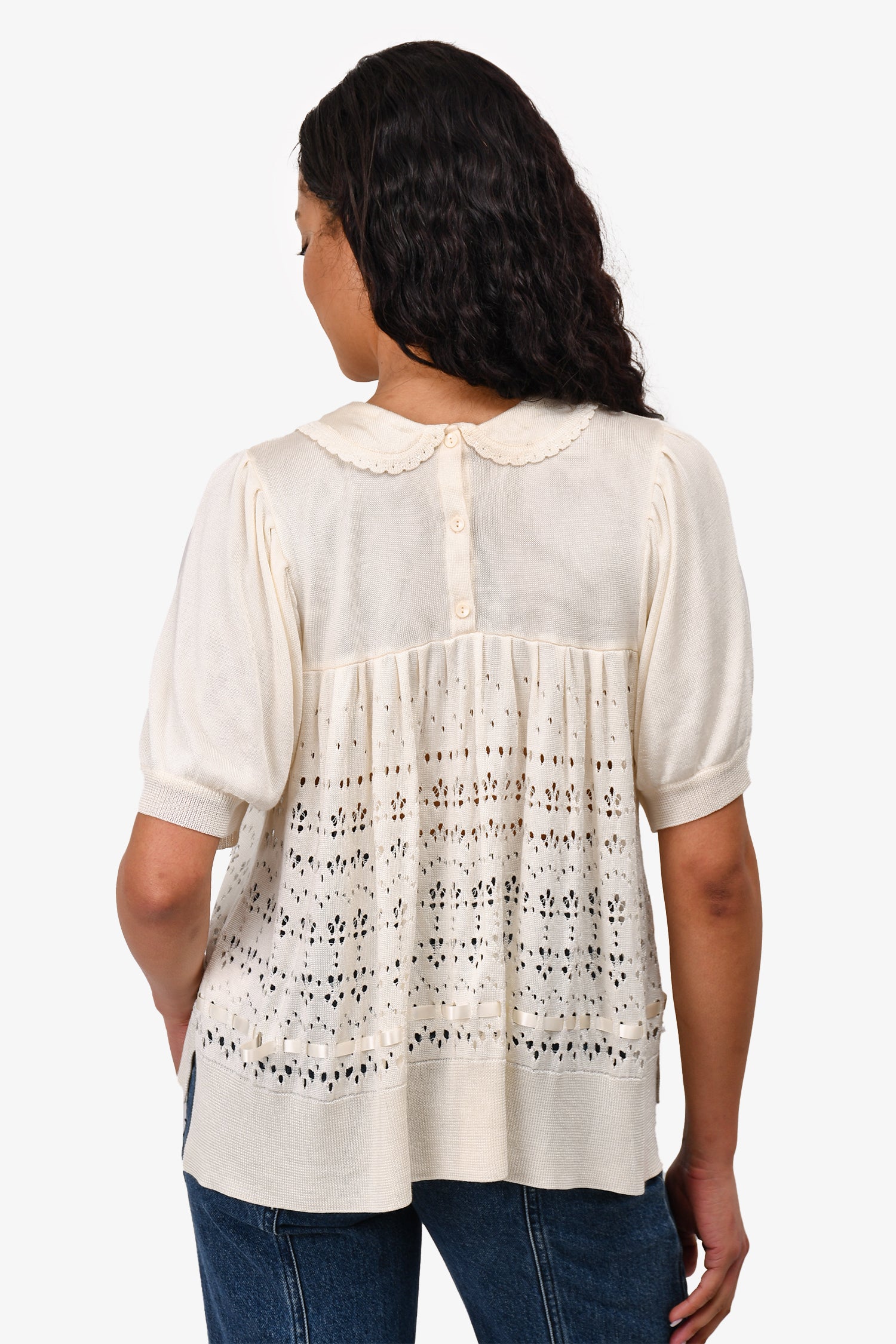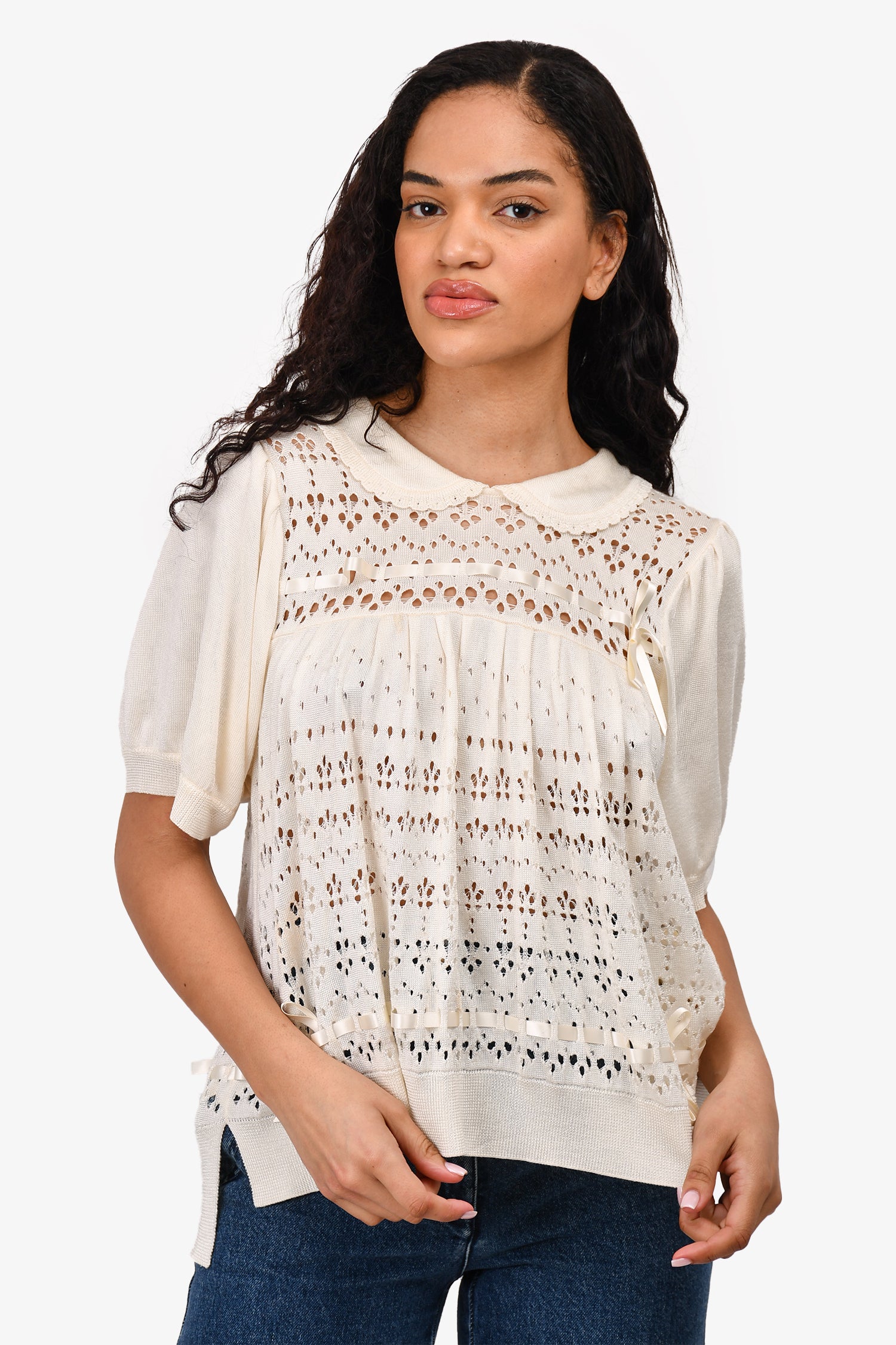 Refresh availabilitySimone Rocha Cream Crochet Knit Top. Back button closure. Tonal hardware. Ribbon detailing on top and bottom. Tonal stitching.
