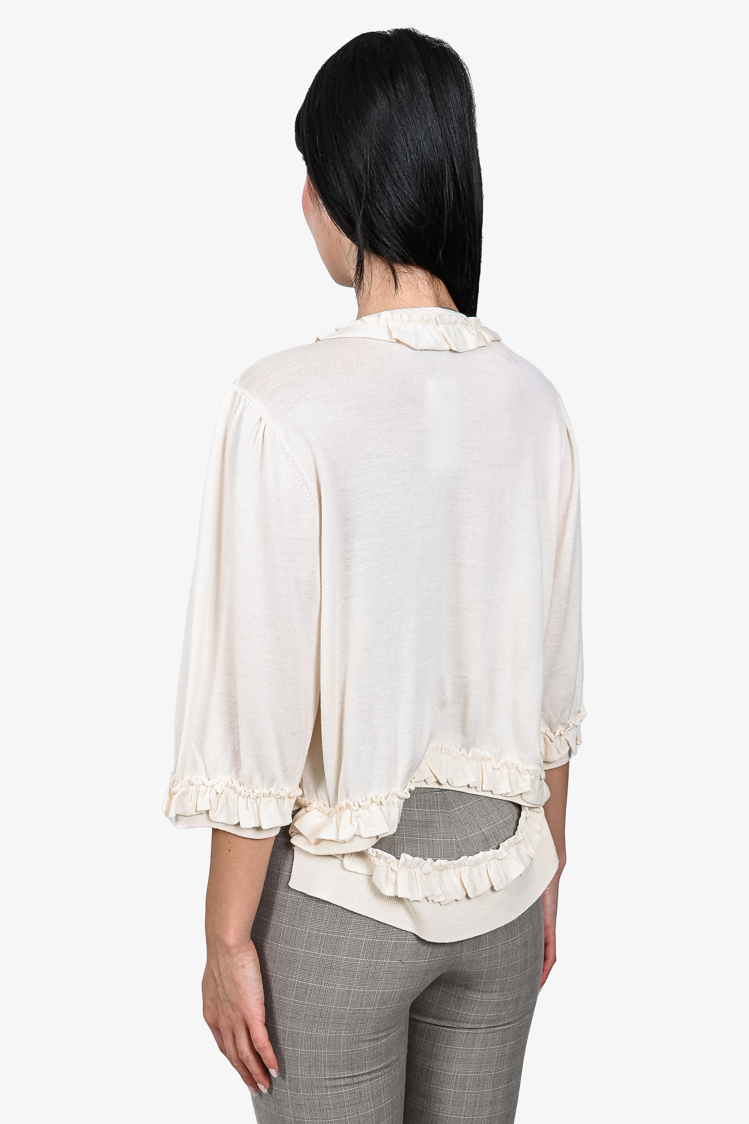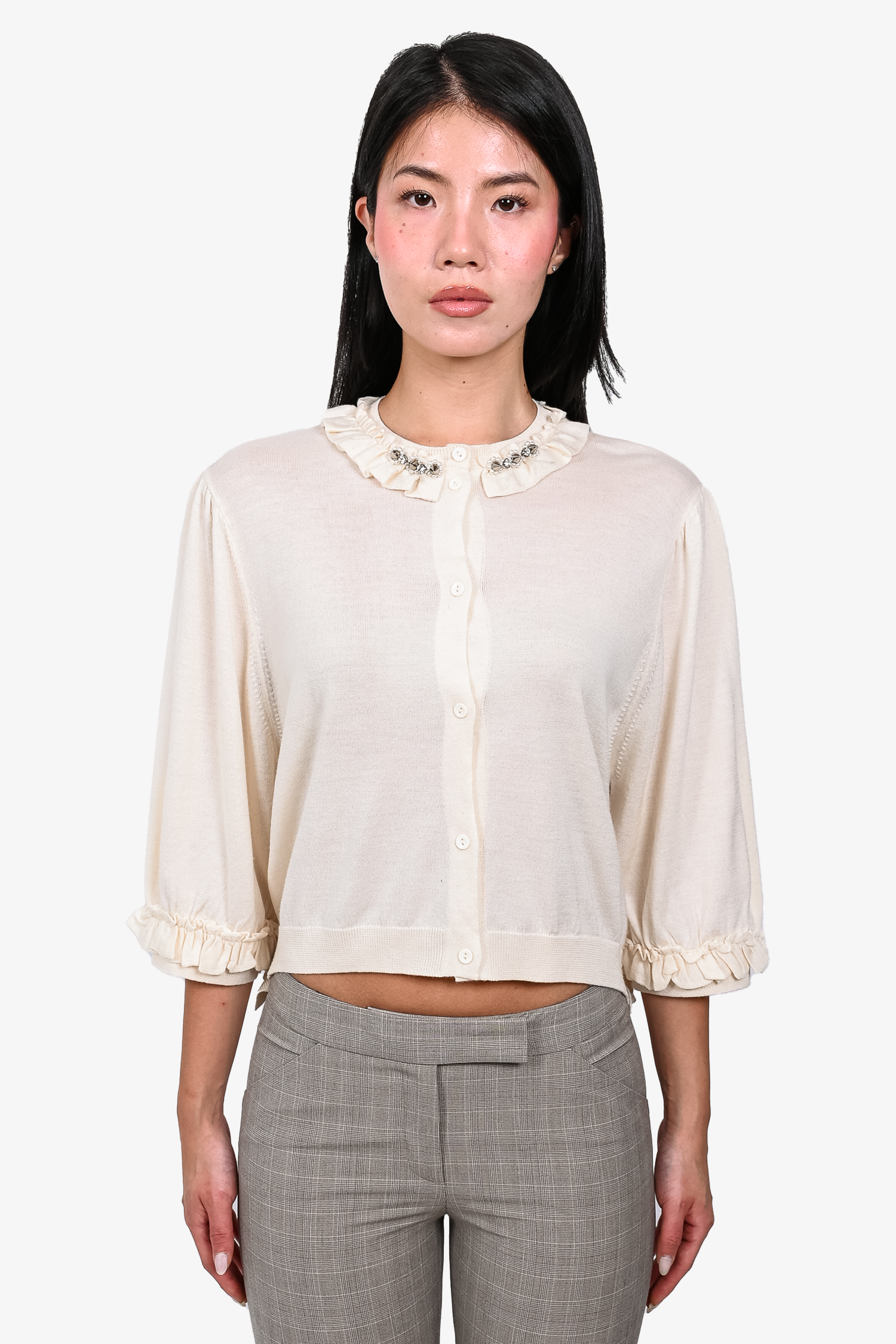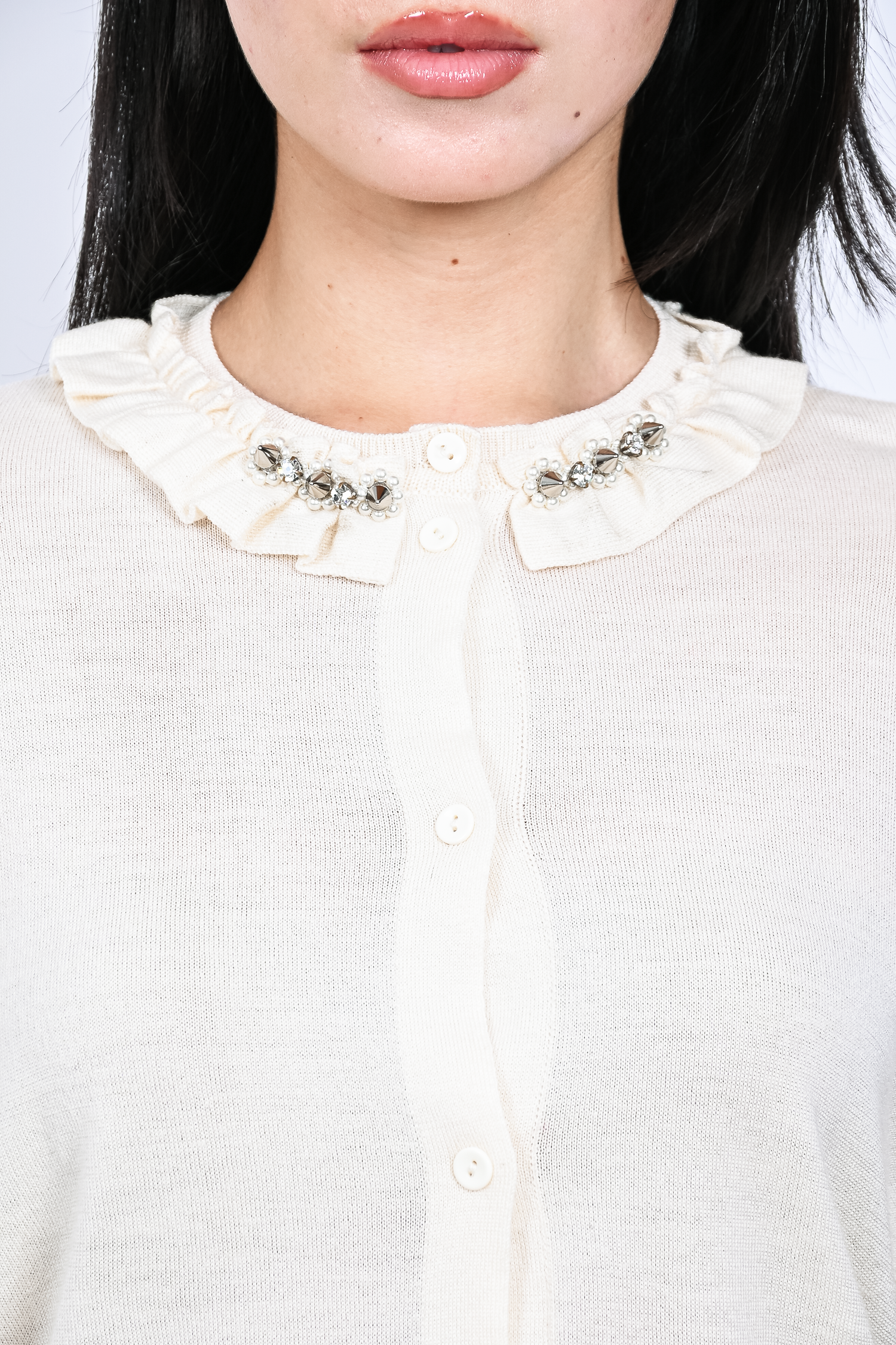 Refresh availabilitySimone Rocha Cream Wool/Silk Knit Cardigan with Stud/Pearl Collar. Front button-up closure. Ribbed cuffs and hem. Tonal stitching.
