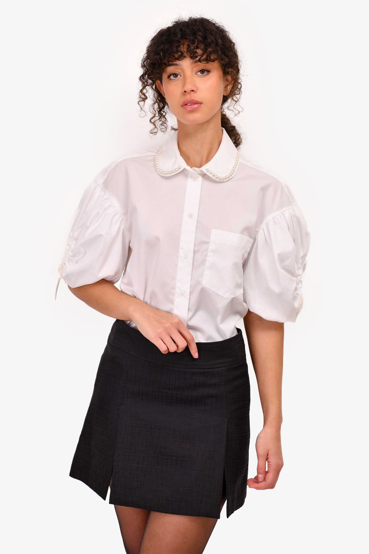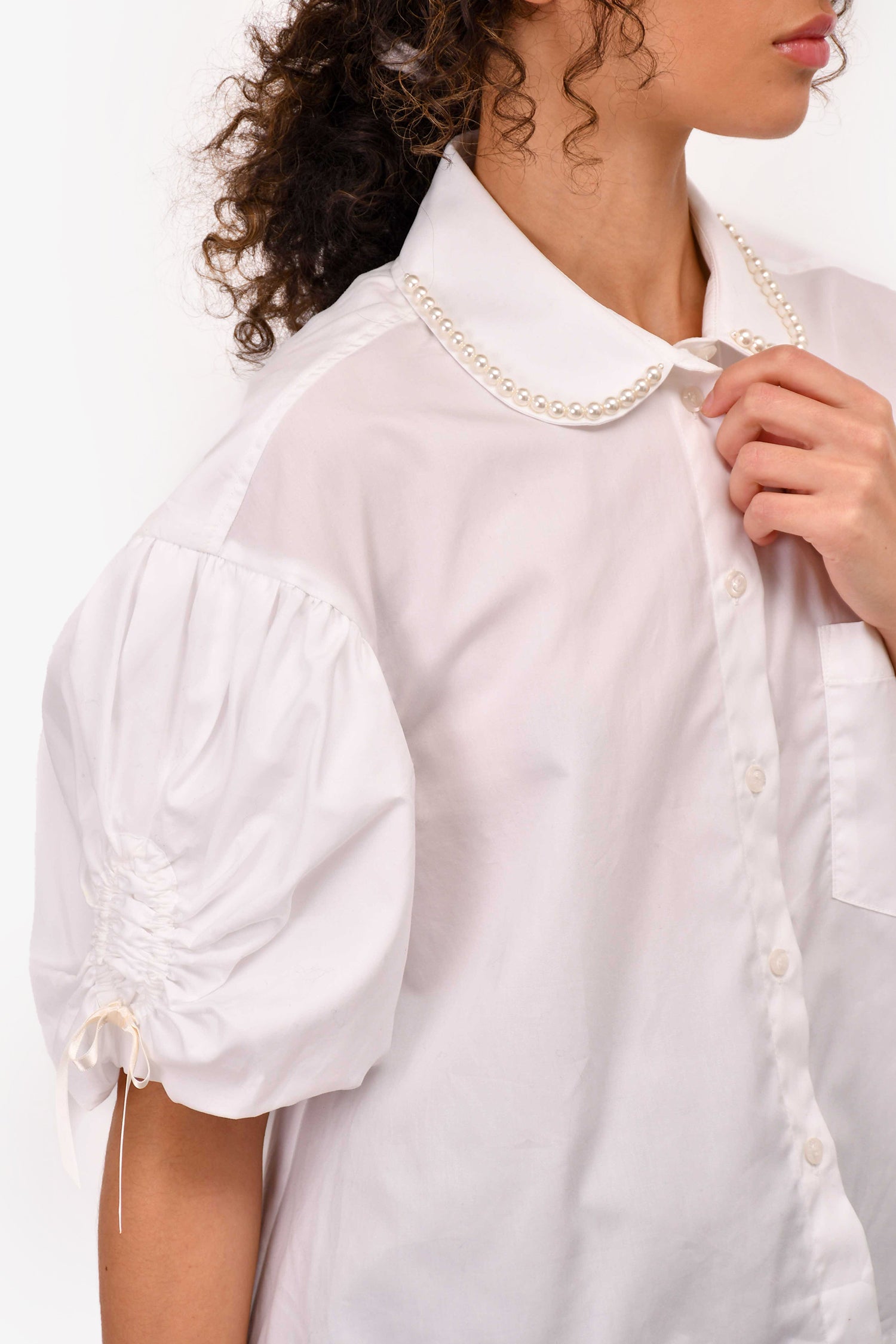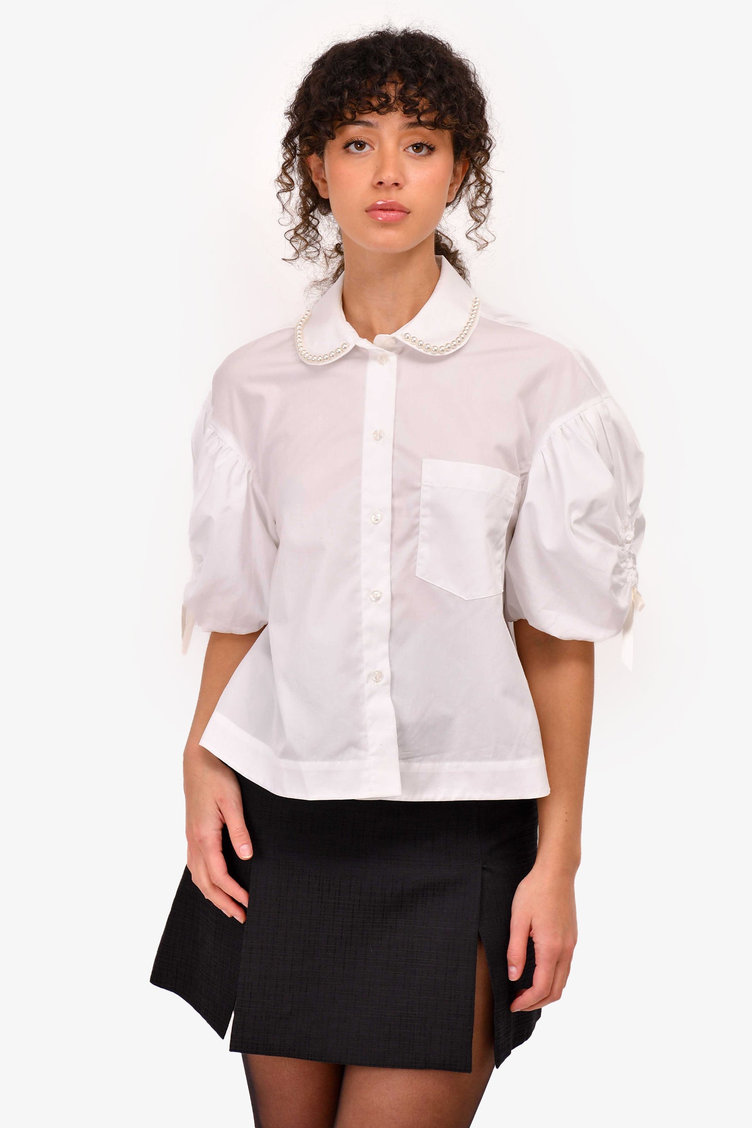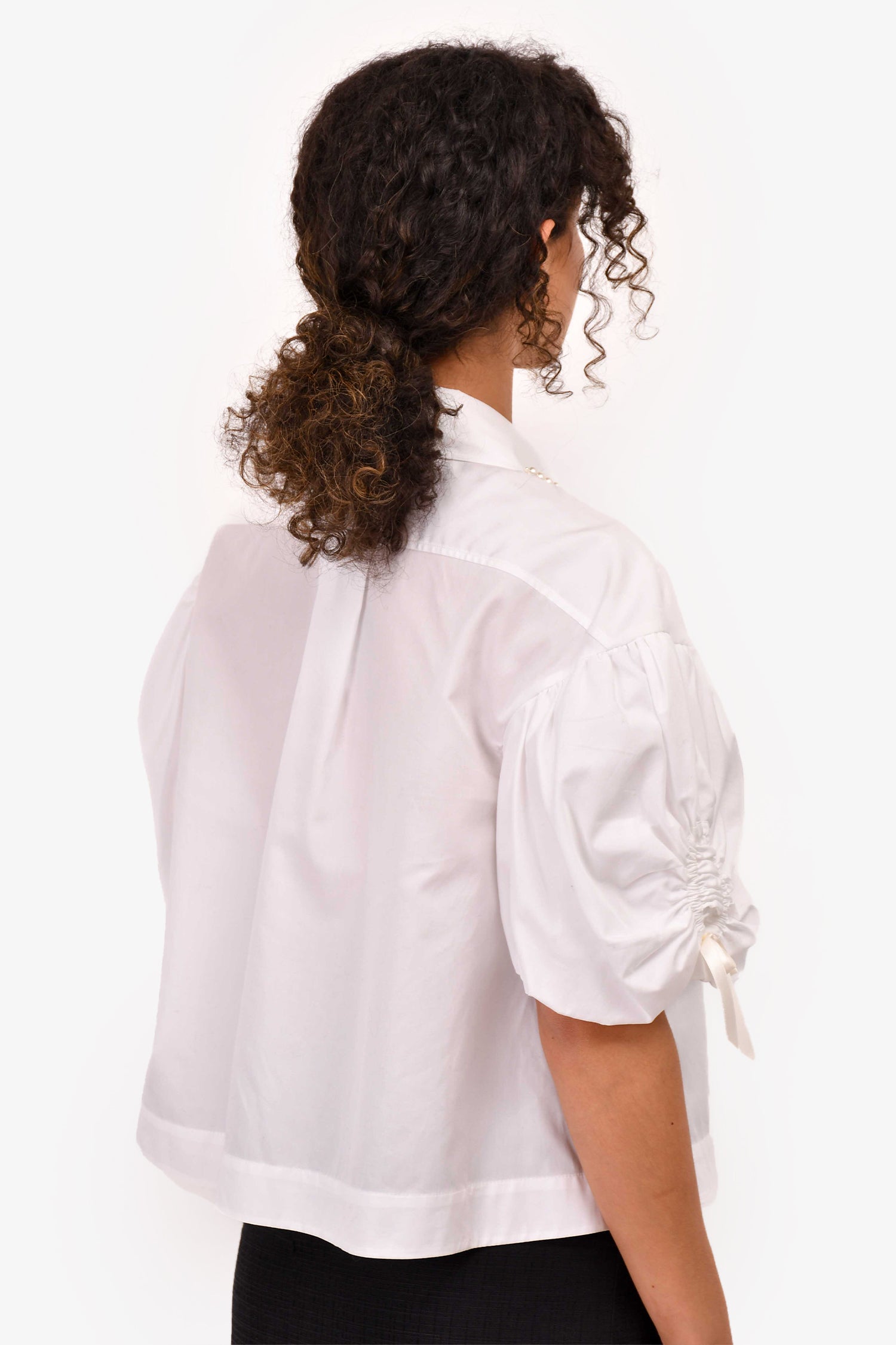 Refresh availabilitySimone Rocha White Cotton Poplin Button-Up Top With Pearl Collar. Front button-up closure. Tonal hardware. Ruched at the sleeves with bow tie closure. Cropped. Tonal stitching.