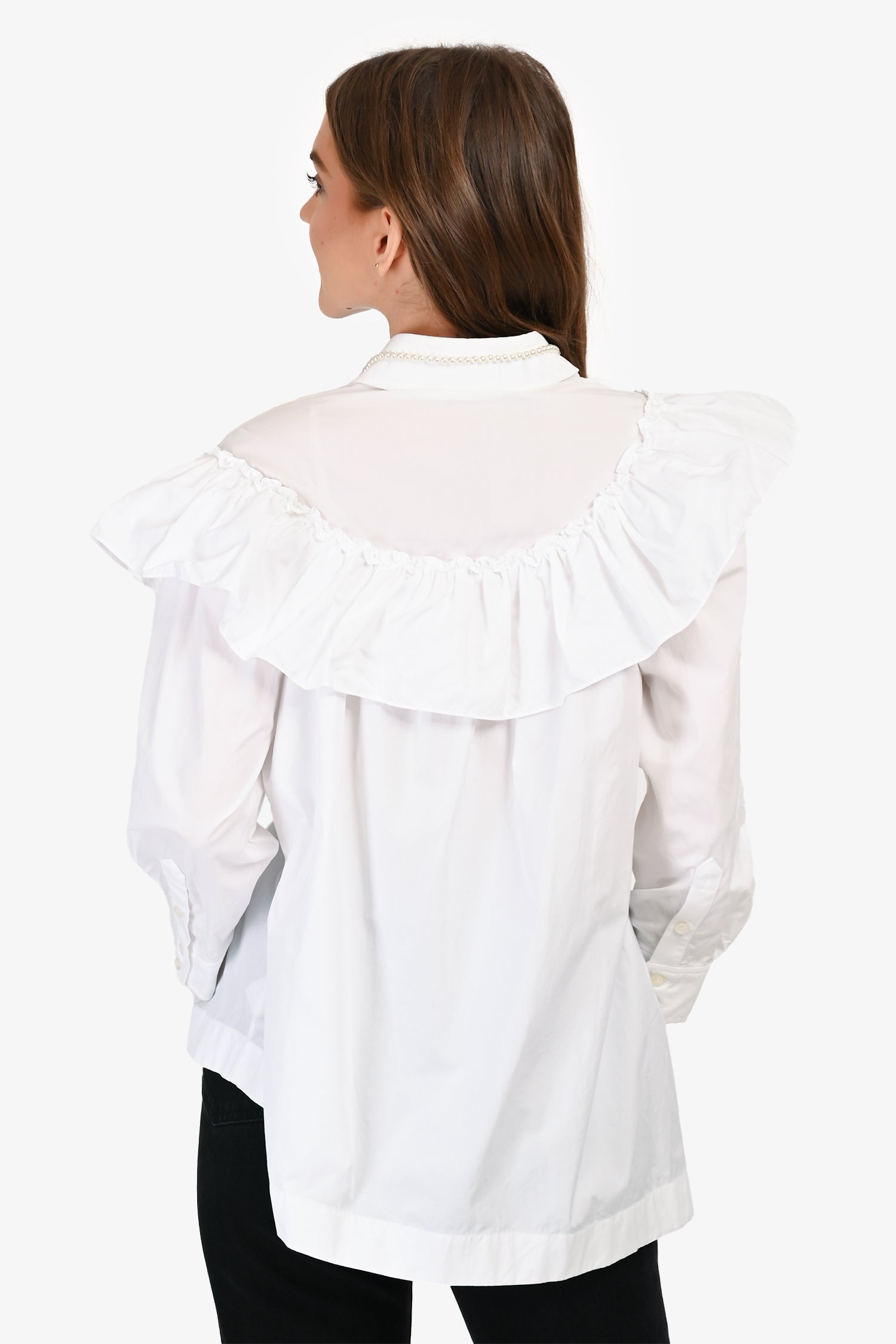 Refresh availabilitySimone Rocha White Cotton Poplin Button-Up Top with Pearl Collar. Slip-on. Front button-up closure. Point collar embellished with faux pearls. Removable waist tie. Cuffs with button-up closure. Tonal stitching.
