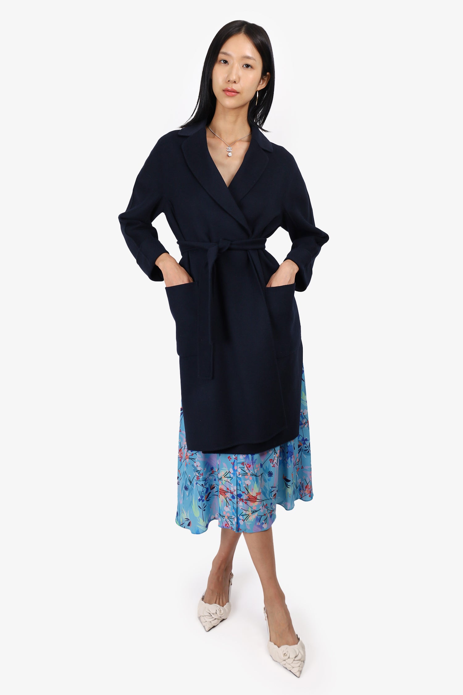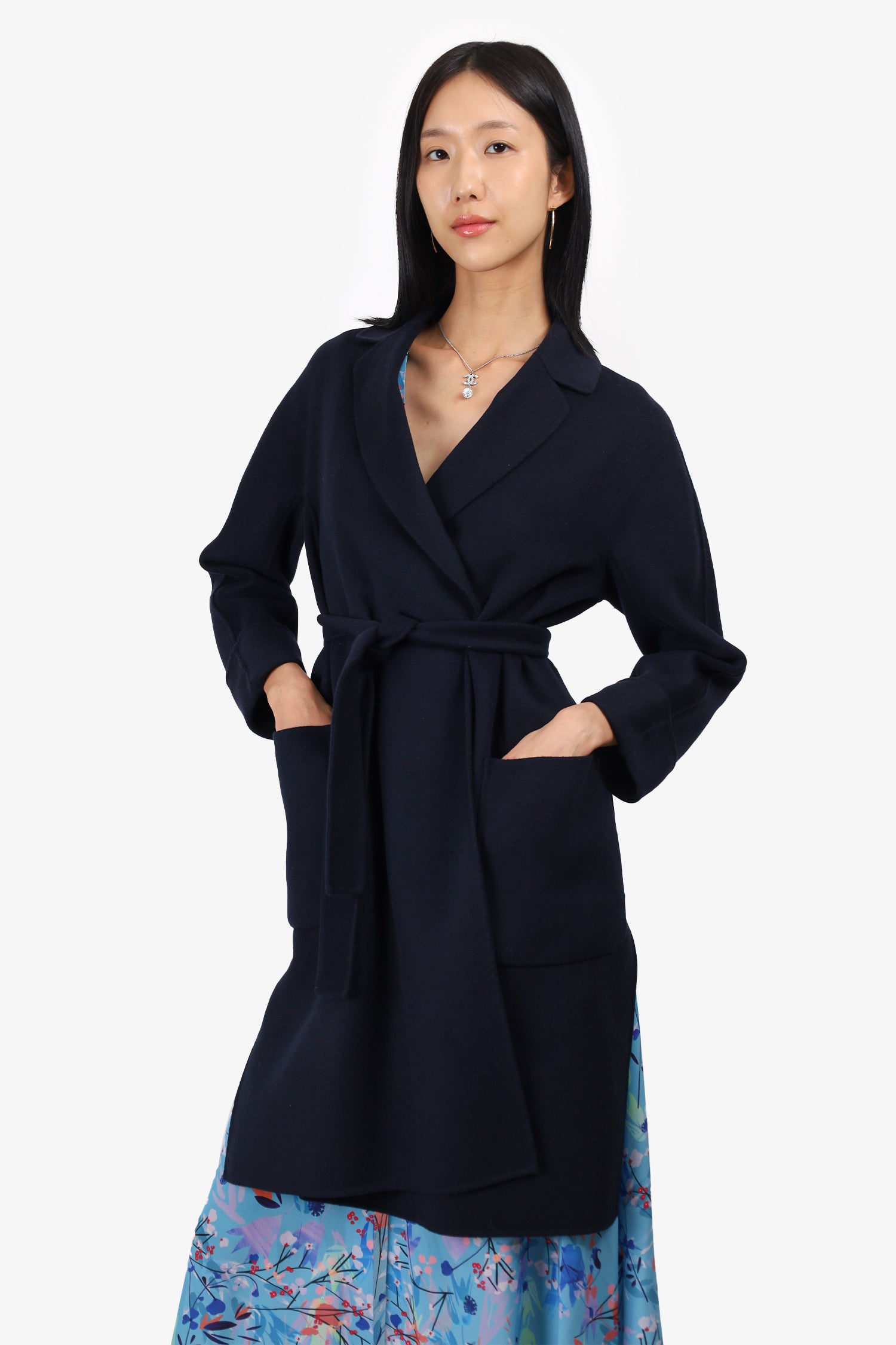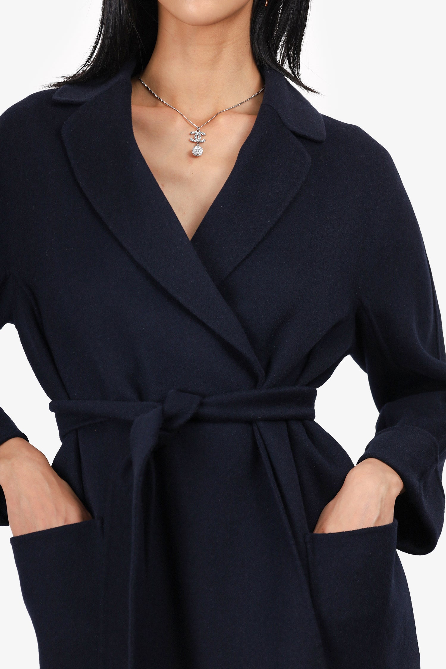 Refresh availabilityS'MaxMara Navy Wool/Angora Belted Coat. Collared neckline. Removable tie-up waist. Rolled sleeve cuffs. 2 front slip pockets. Unlined. Tonal stitching.