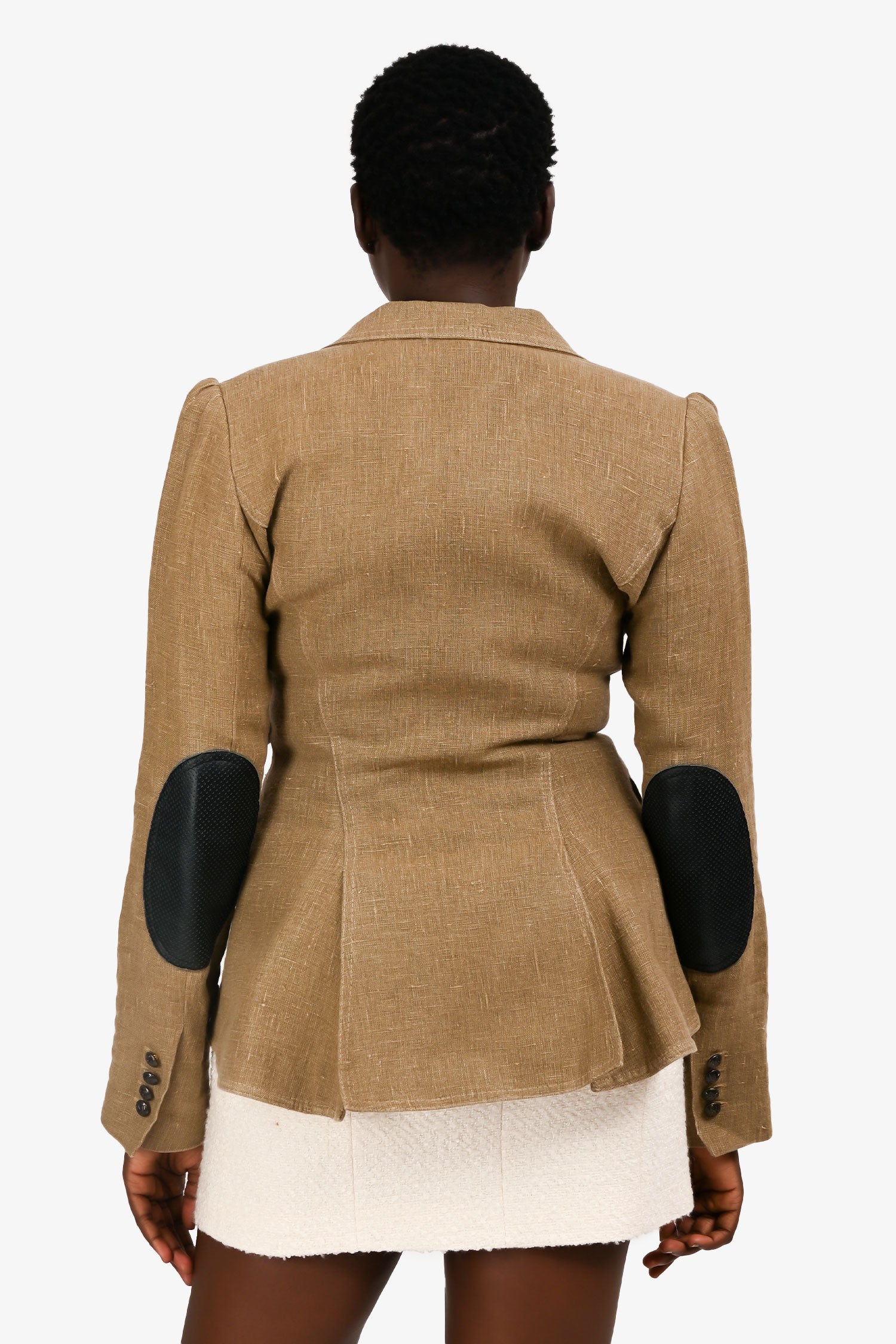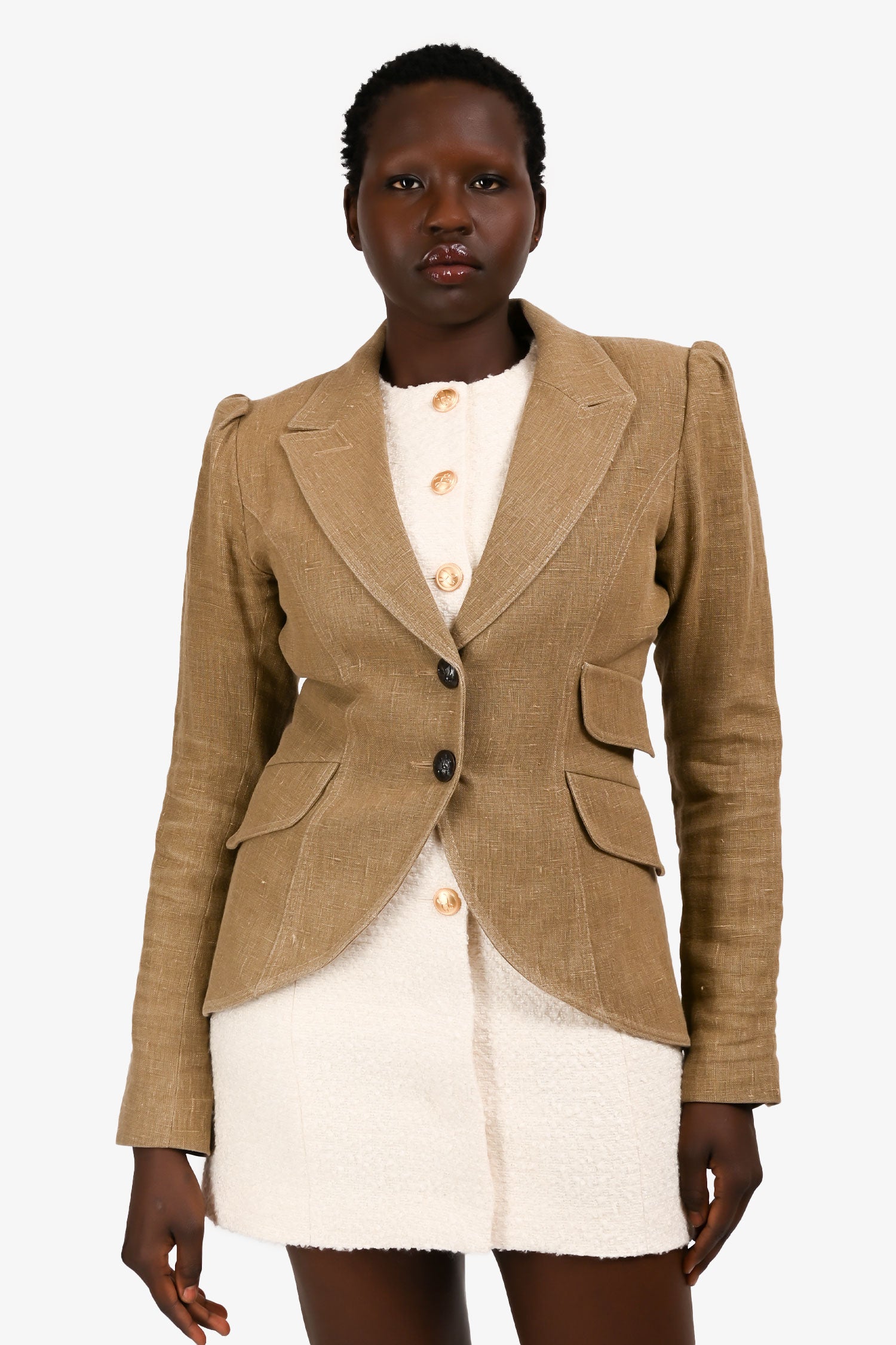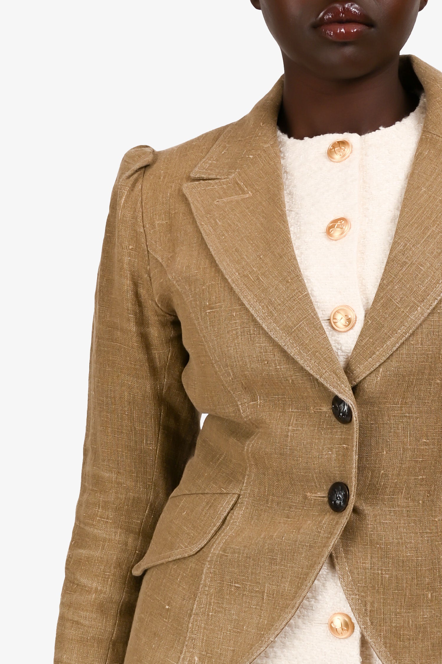 Refresh availabilitySmythe Beige Linen Blazer. Long sleeves with button cuffs. Front button closure. Front flap pockets. Fully lined. Tonal stitching.
