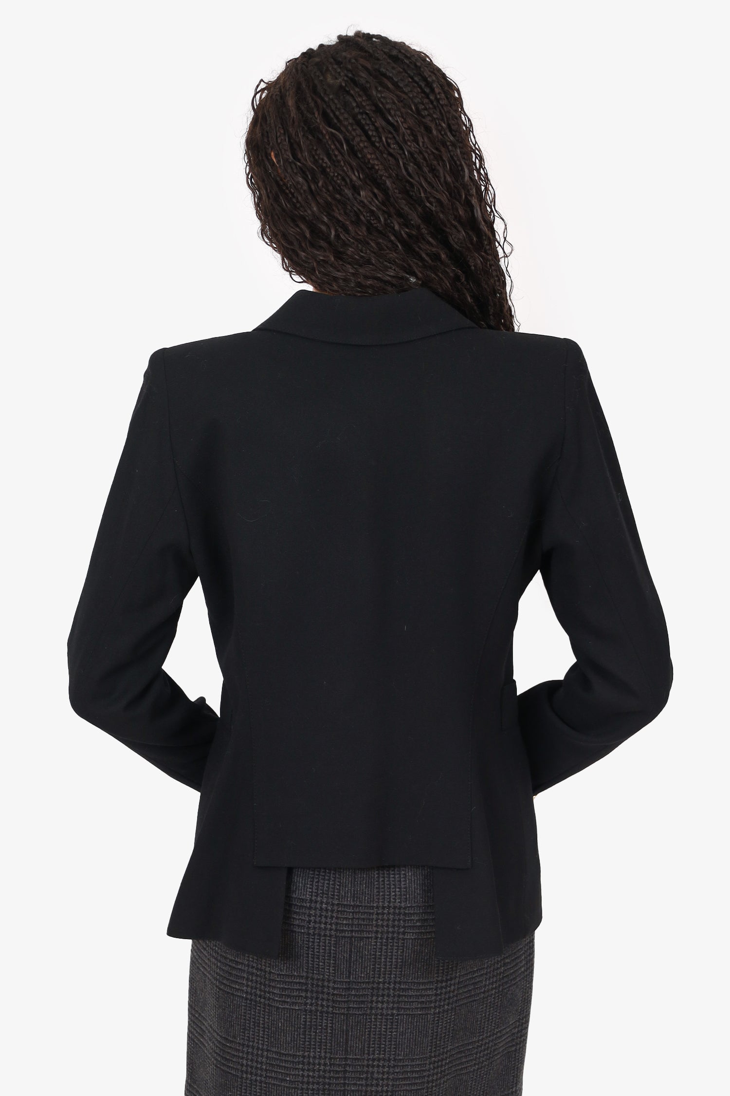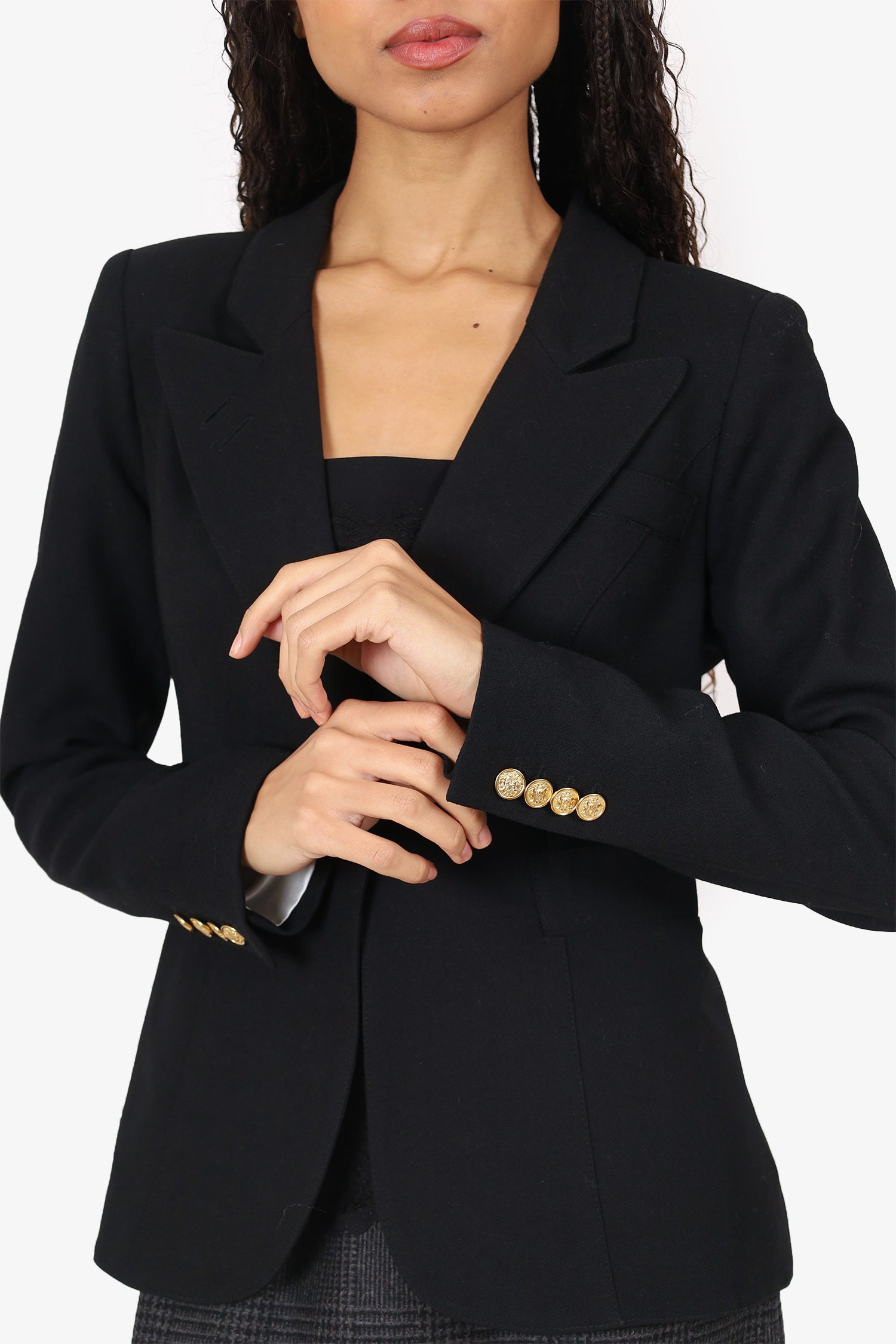 Refresh availabilitySmythe Black Shimmer Blazer. Pull-on. Peak lapel. Front button-up closure. 4 exterior pockets; 1 breast, 1 mini button-up, and 2 side slips. Sleeve cuffs with button-up closure. Lined interior. Gold-tone hardware. Tonal stitching.