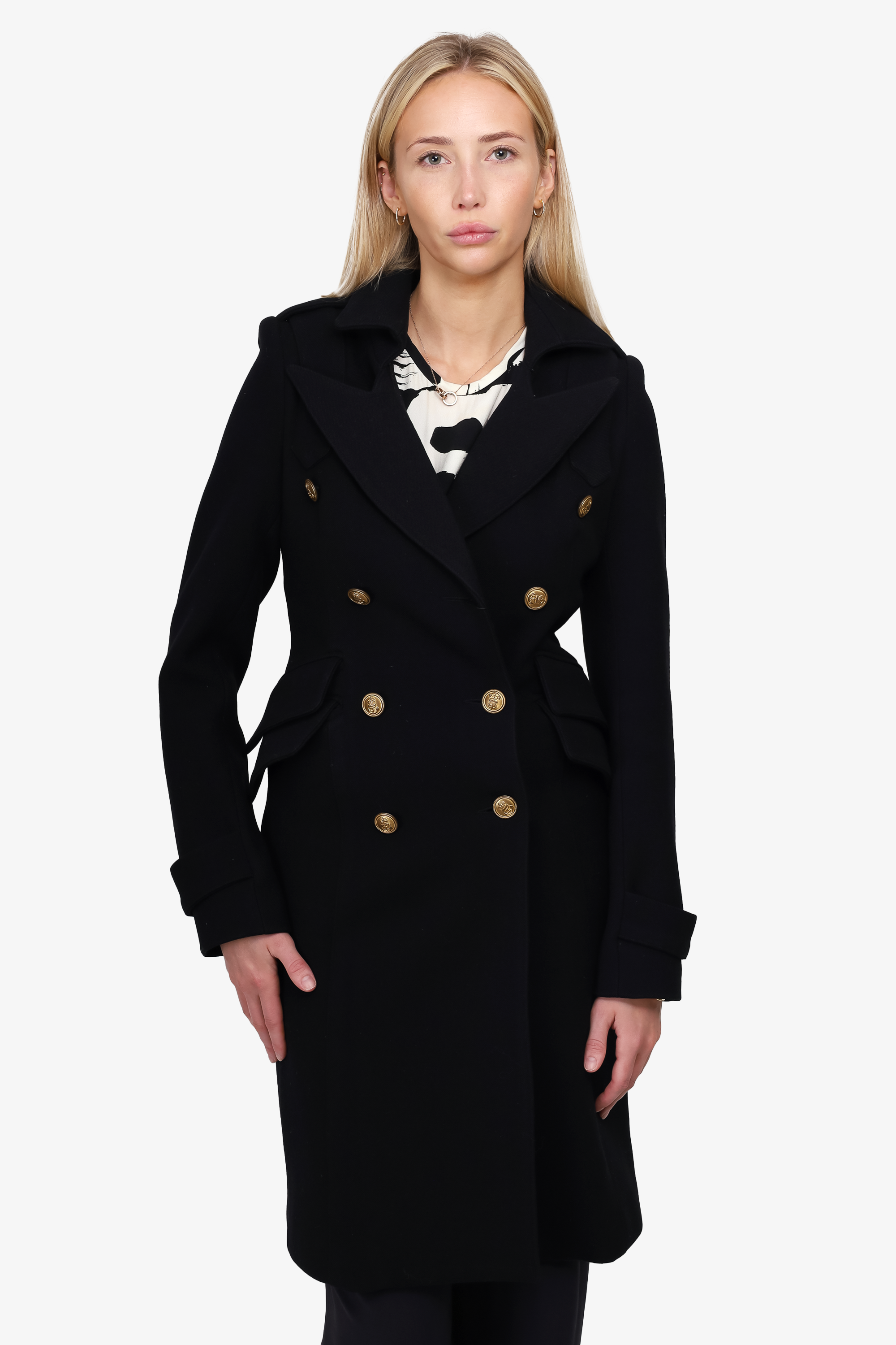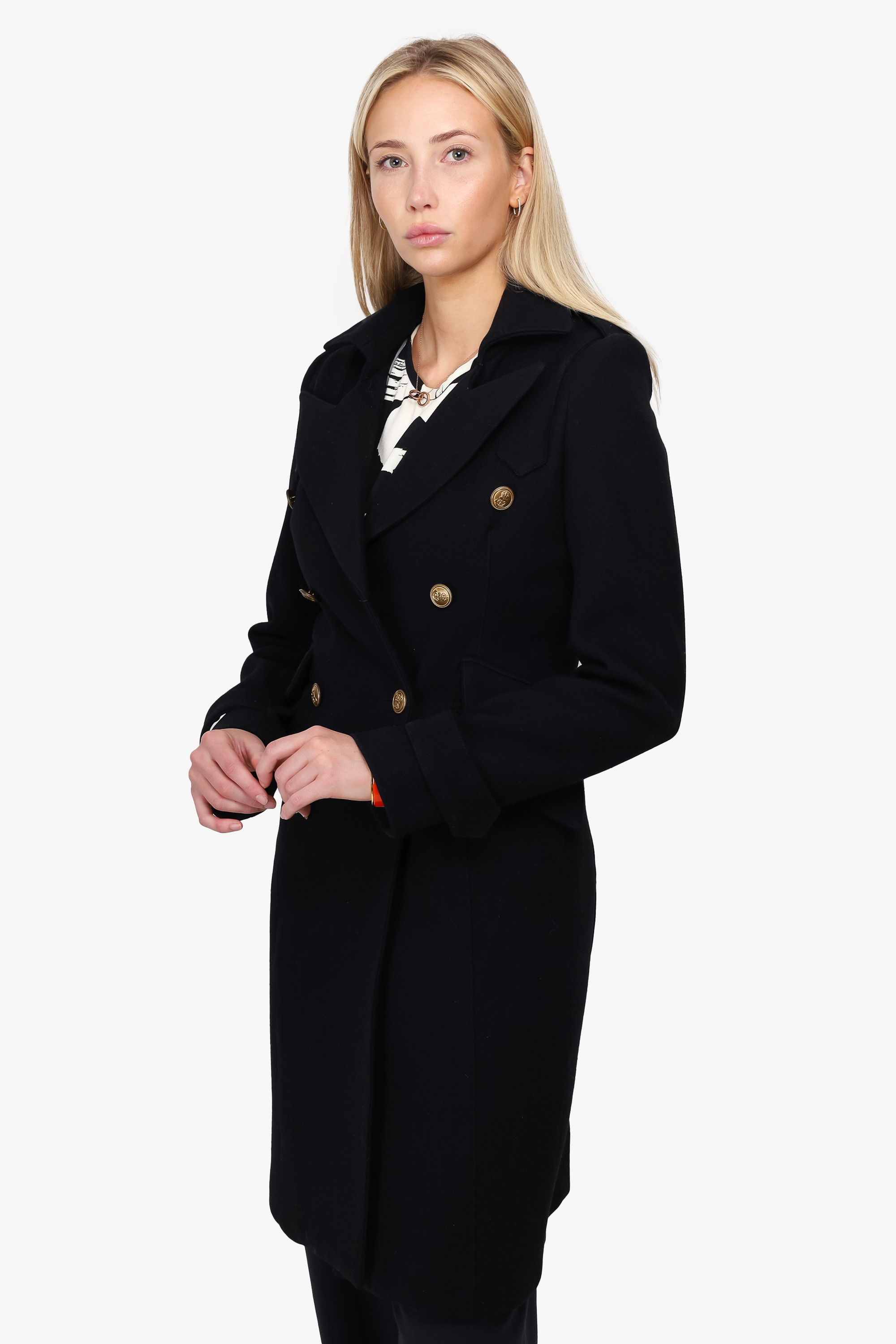 Refresh availabilitySmythe Black Wool Double Breasted Coat. Front button-up closure. 2 front slip pockets with double fold over flap. Lined. Tonal stitching.