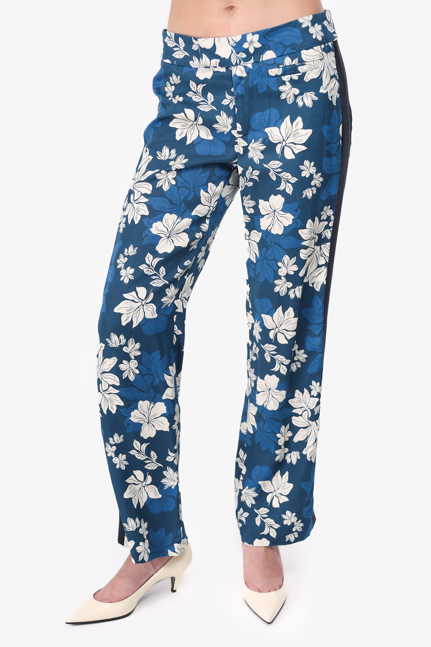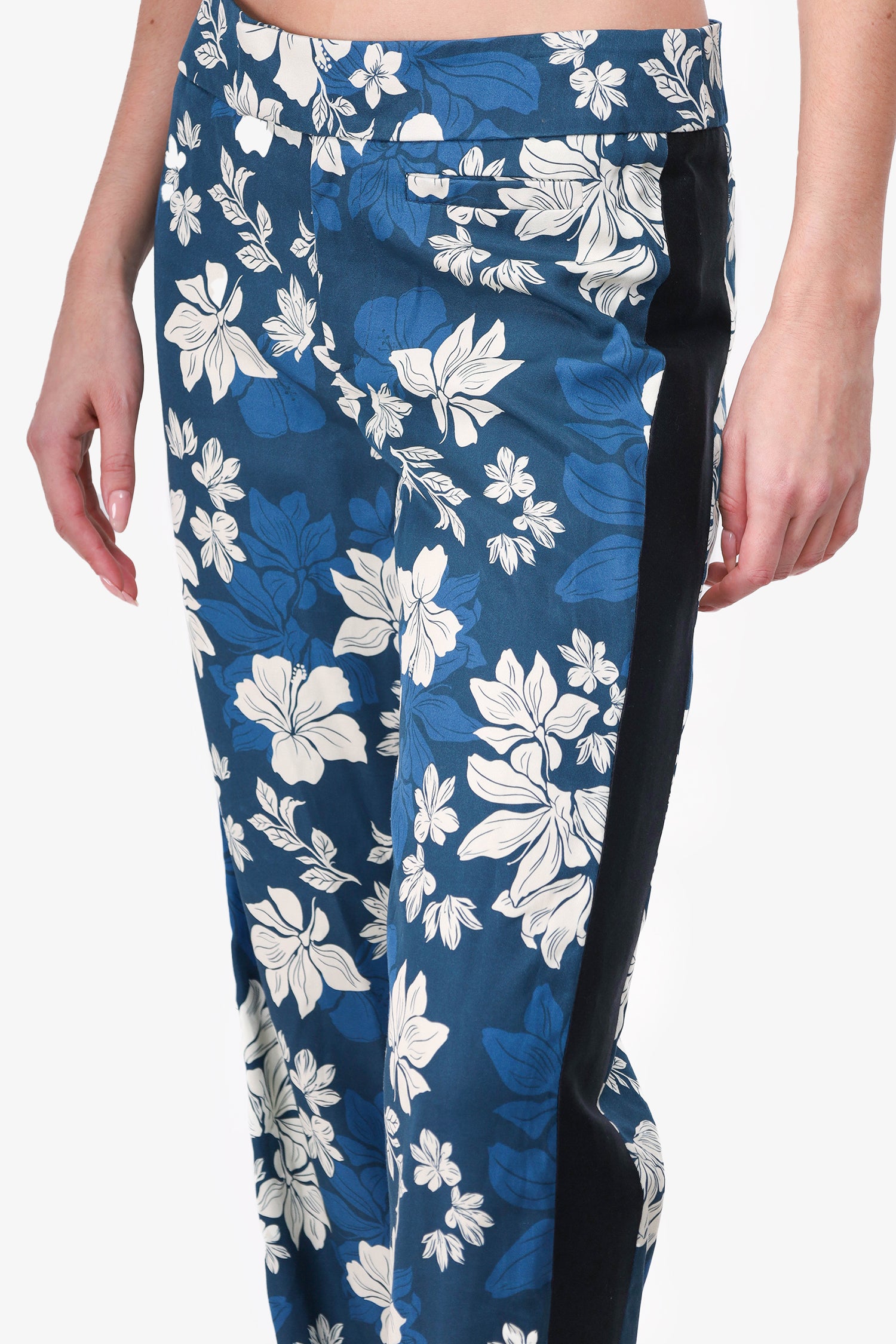 Refresh availabilitySmythe Blue Floral Tuxedo Pant. Front zip and button closure. Pull-on. Tonal stitching.