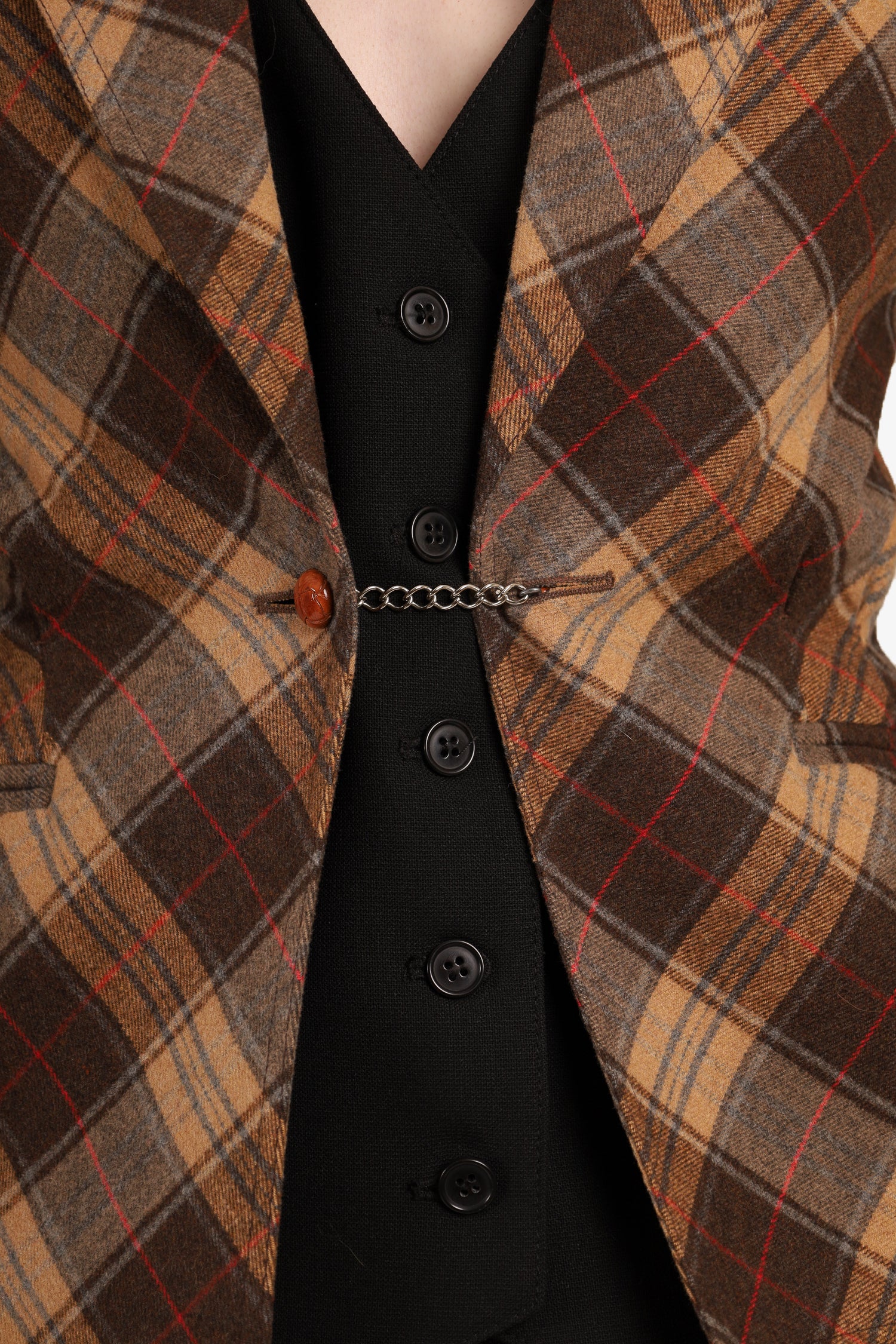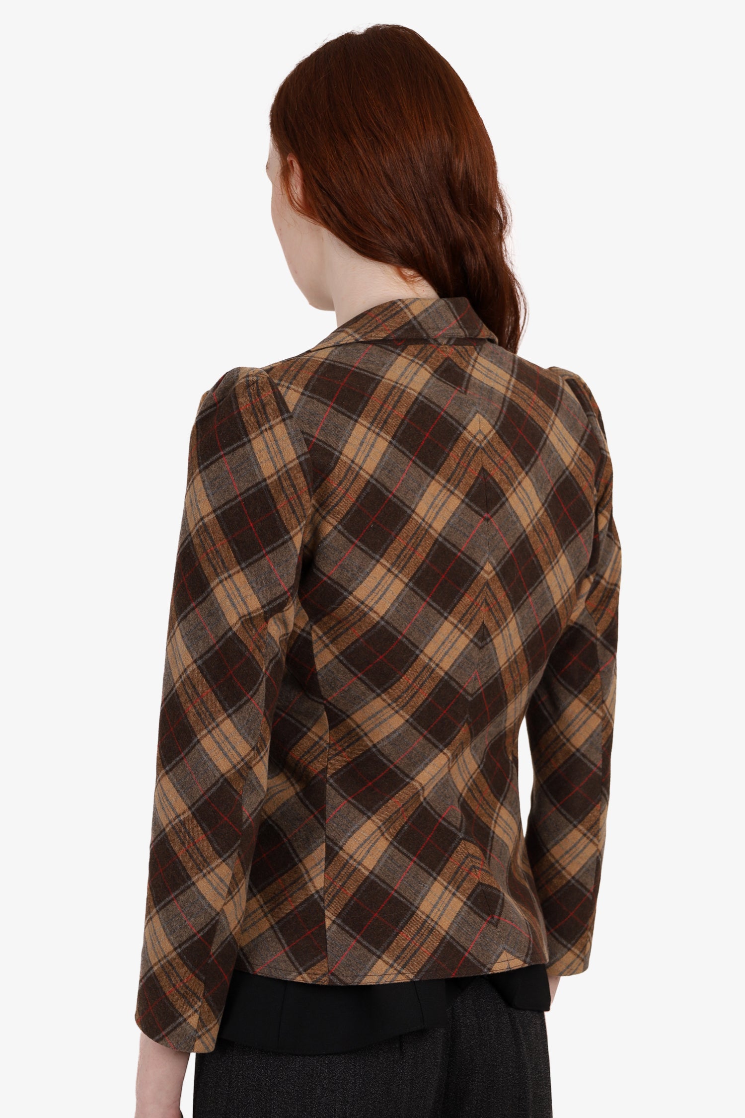 Refresh availabilitySmythe Brown Wool Plaid Print Jacket. Front button-up closure. Lined. Tonal stitching.