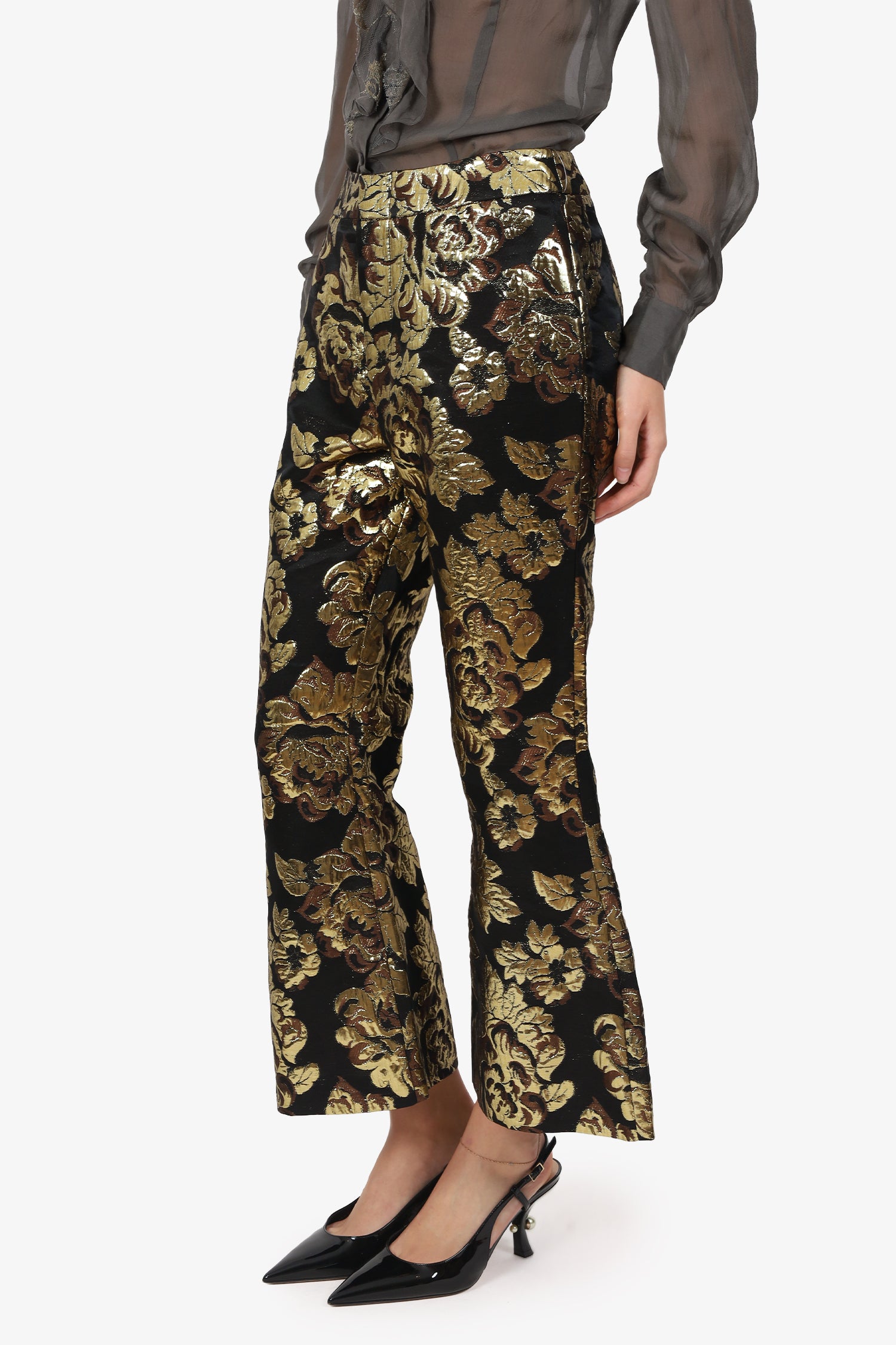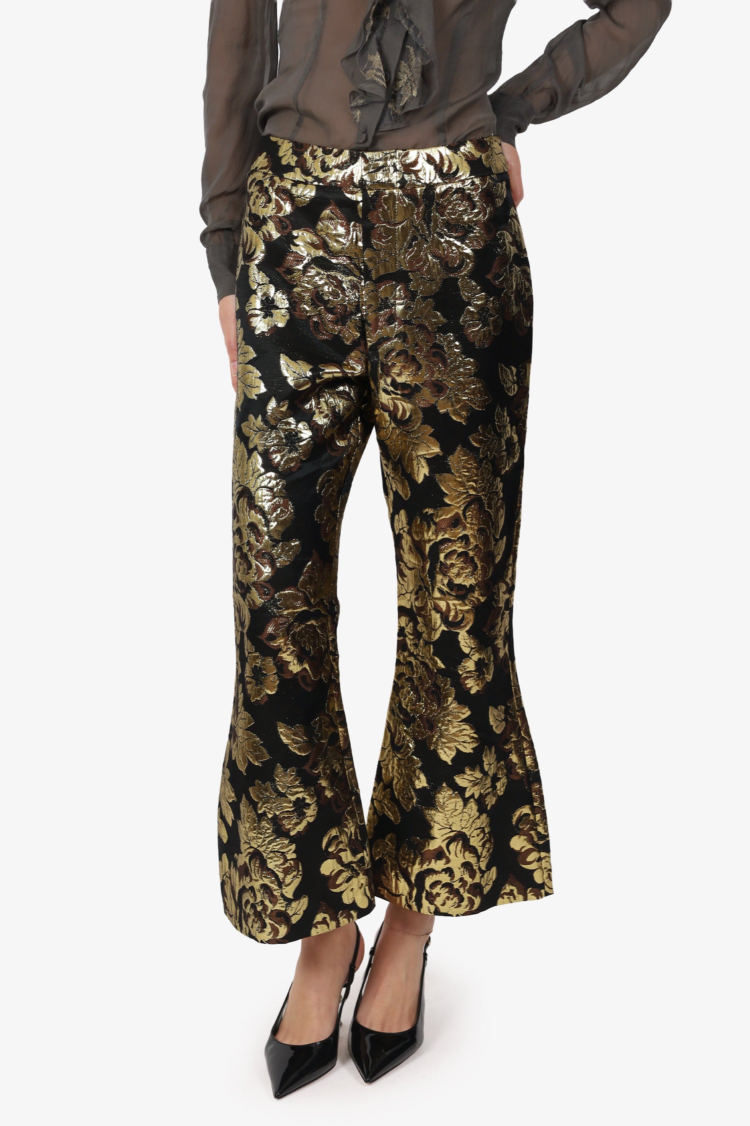 Refresh availabilitySmythe Gold/Black Jacquard Crossed Flare Pants. Slip-on. Front zip with button and hook-up closure. Silver-tone hardware. Tonal stitching.