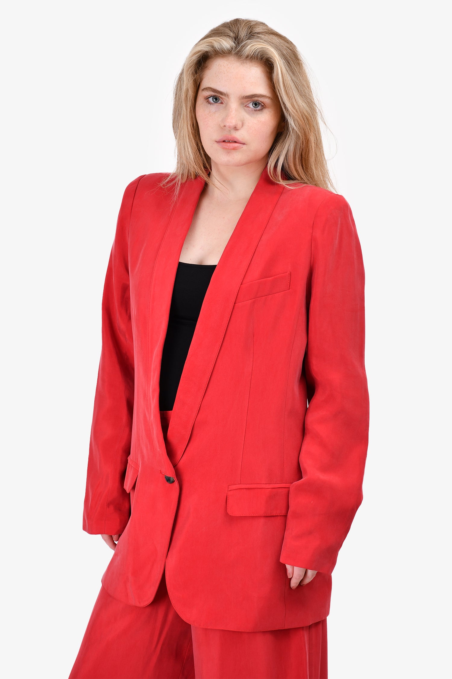 Refresh availabilitySmythe Red Blazer + Wide Leg Pant Set. Blazer: Single front button closure. V-neck. Padded shoulders. Lined. Front pockets. Pants: Elasticized waist. Front pockets.