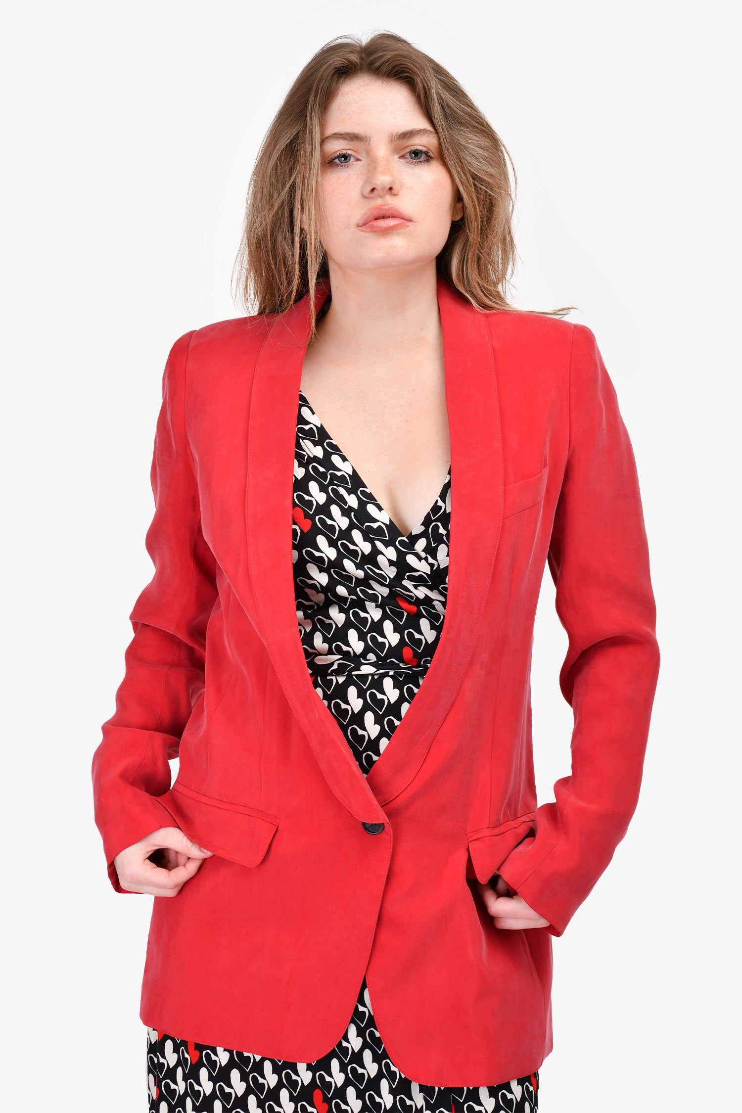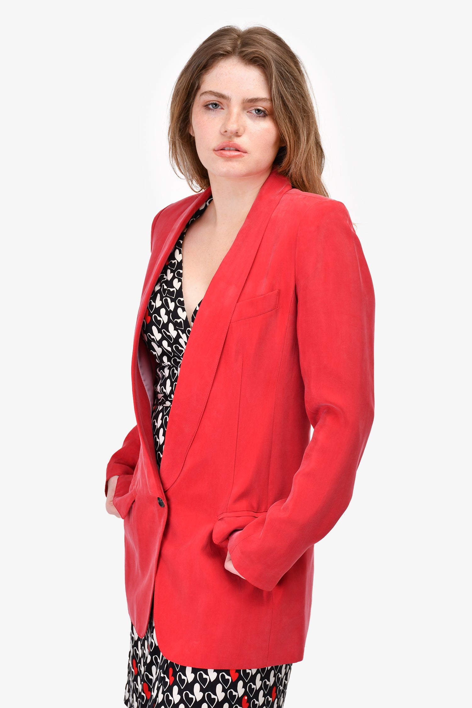 Refresh availabilitySmythe Red Longline Lapel Blazer. Front button closure. Front pockets. Padded shoulders. Lined. Tonal stitching.