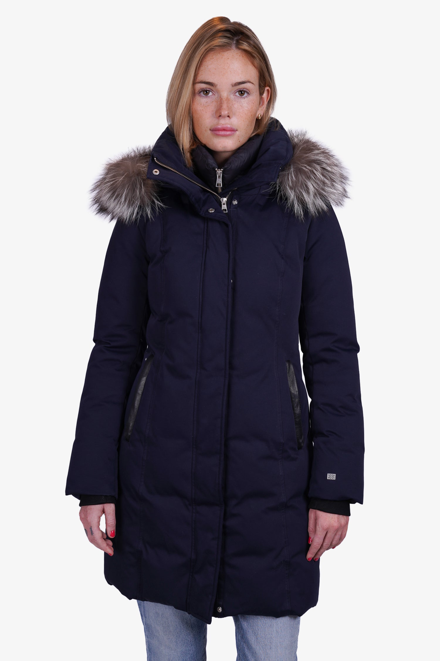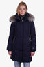 Soia & Kyo Navy Blue Double Zip Puffer Jacket with Fox Fur Trimmed Hood Size XS
