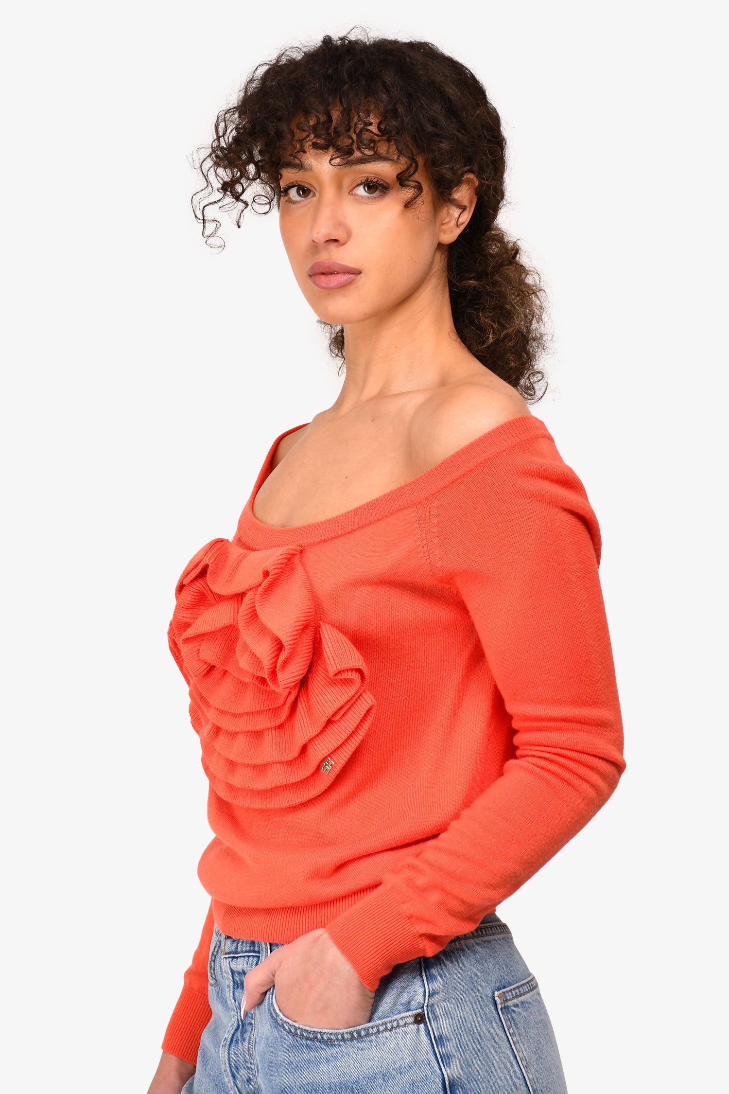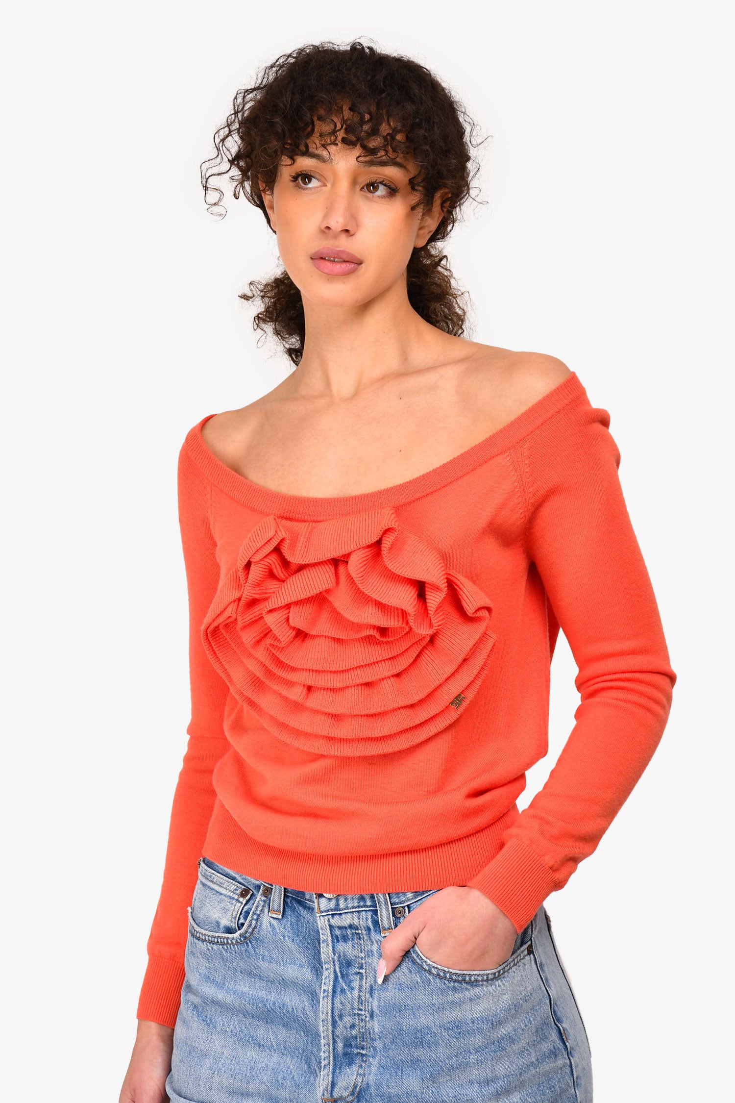 Refresh availabilitySonia Rykiel Orange Wool Flower Sweater. Pull-on. Ribbed collar, sleeves and hem. Silver-tone hardware. Unlied. Tonal stitching.