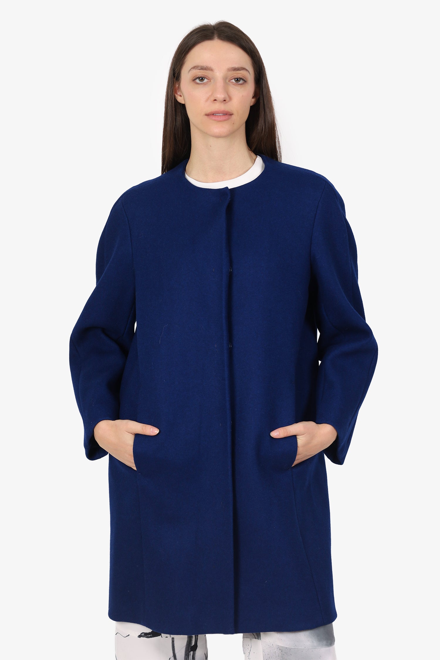 Refresh availabilitySportmax Blue Wool Coat. Pull-on. Round neckline. Front snap button-up closure. 2 exterior side slip pockets. Lined interior. Brass-tone hardware. Tonal stitching.