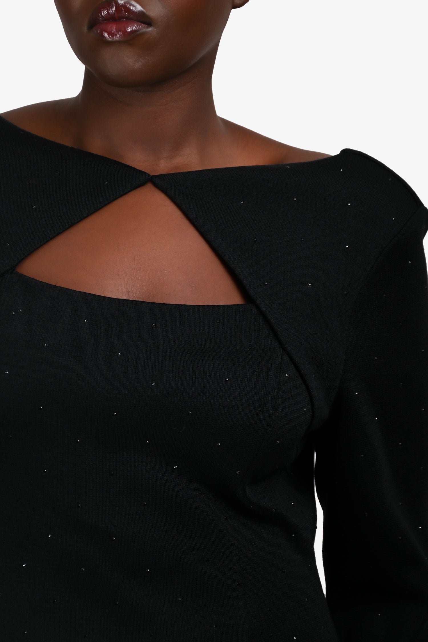 Refresh availabilitySt. John Black Beaded Cut Out Dress. Slip-on. Pull-on. Neckline with cut-out detailing. Padded shoulders. Rear zip closure. Rear slit. Tonal stitching.