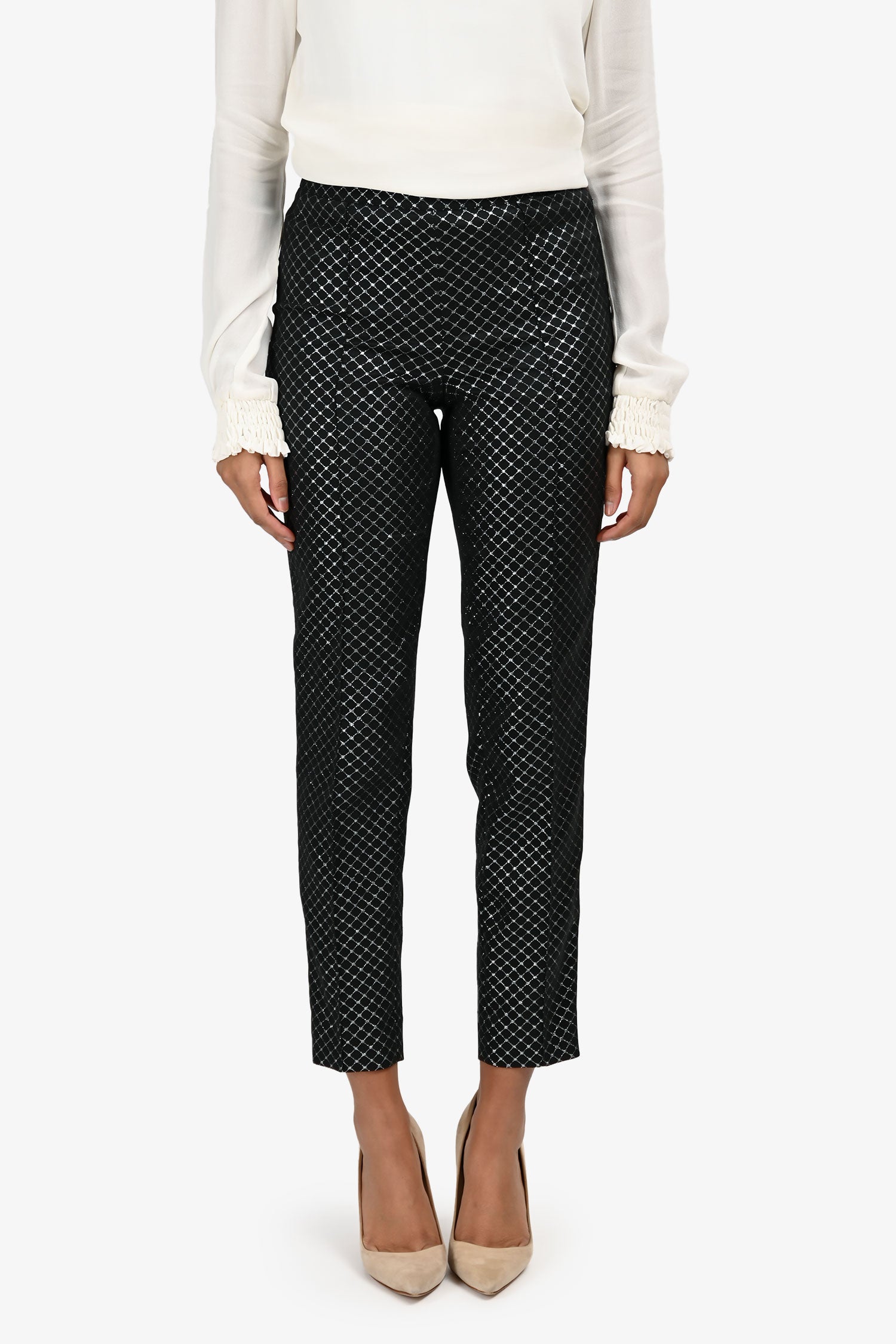Refresh availabilitySt. John Black Metallic Straight Leg Trousers. Pull-on. Hidden zipper on the side. 2 exterior slip pockets in the rear. Tonal hardware. Tonal stitching.