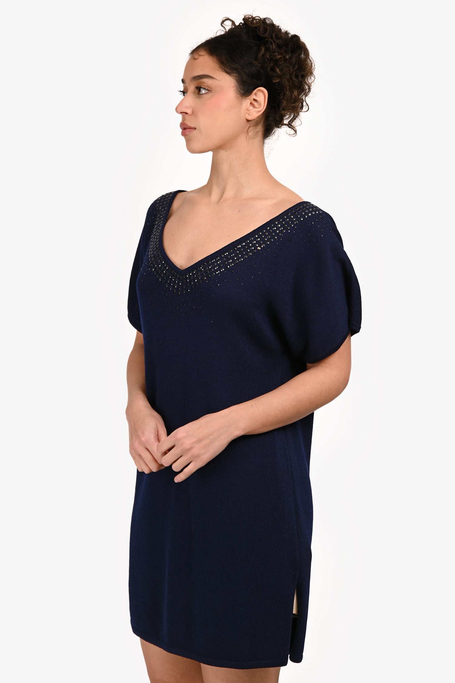 Refresh availabilitySt. John Blue Wool Crystal Embellished Sweater Dress. Slip-on. V-neckline. 2 short side slits. Tonal stitching.