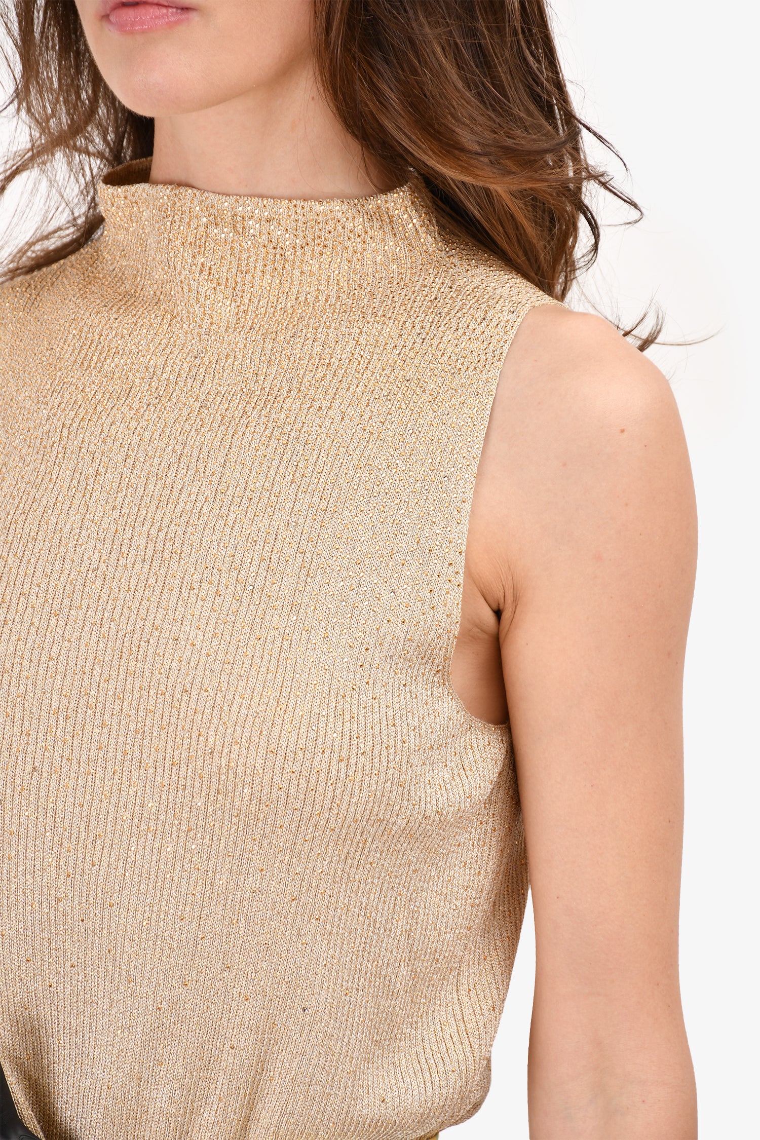 Refresh availabilitySt.John Gold Knit Metallic Sleeveless Top. Round neck. Rear zip closure. Unlined.