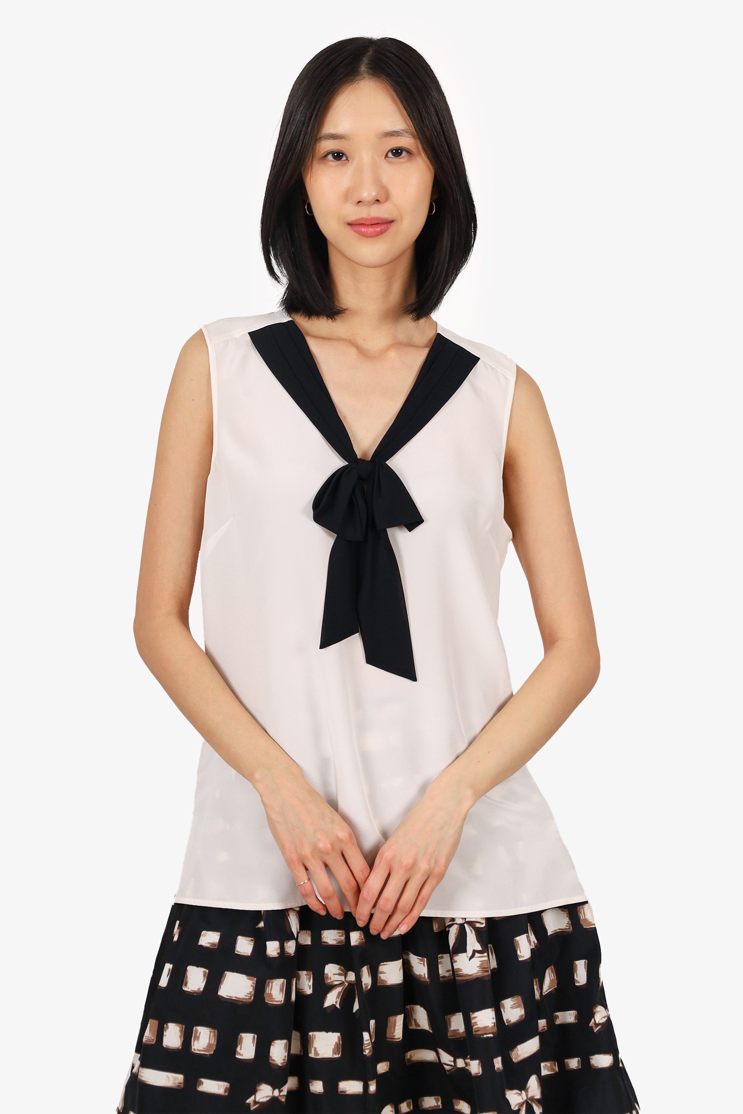 St. John White/Black Silk Bow Detail Sleeveless Top Size M
