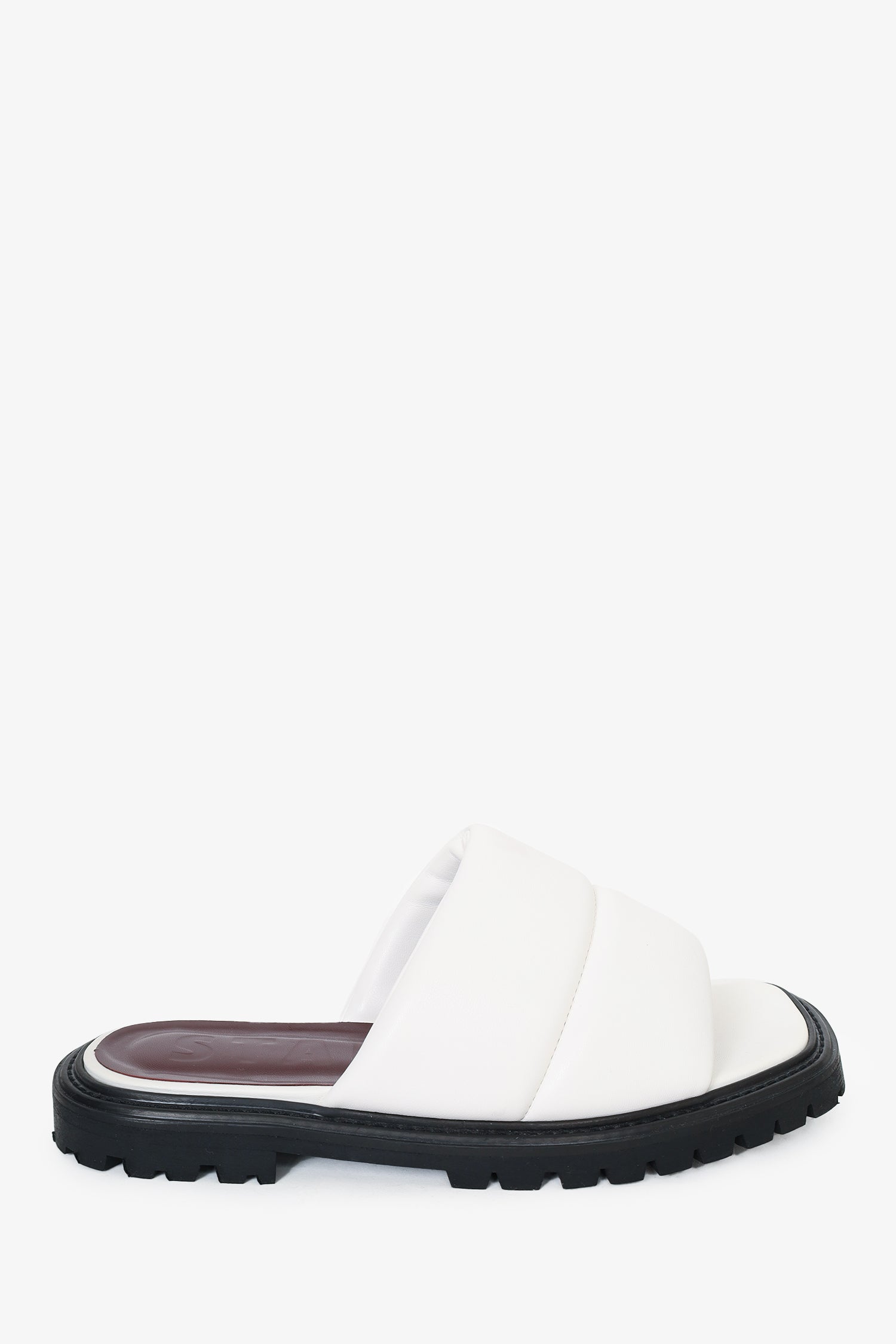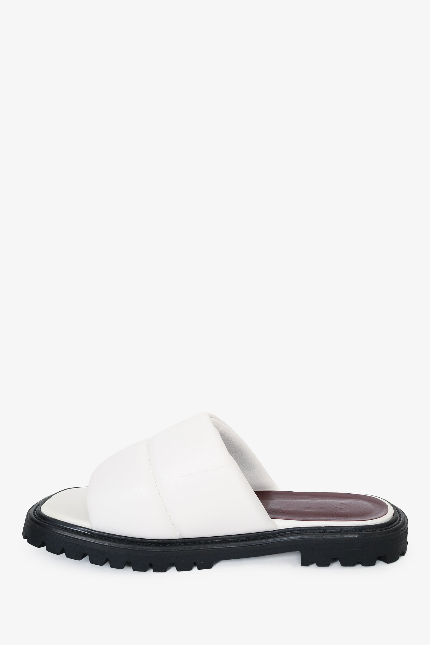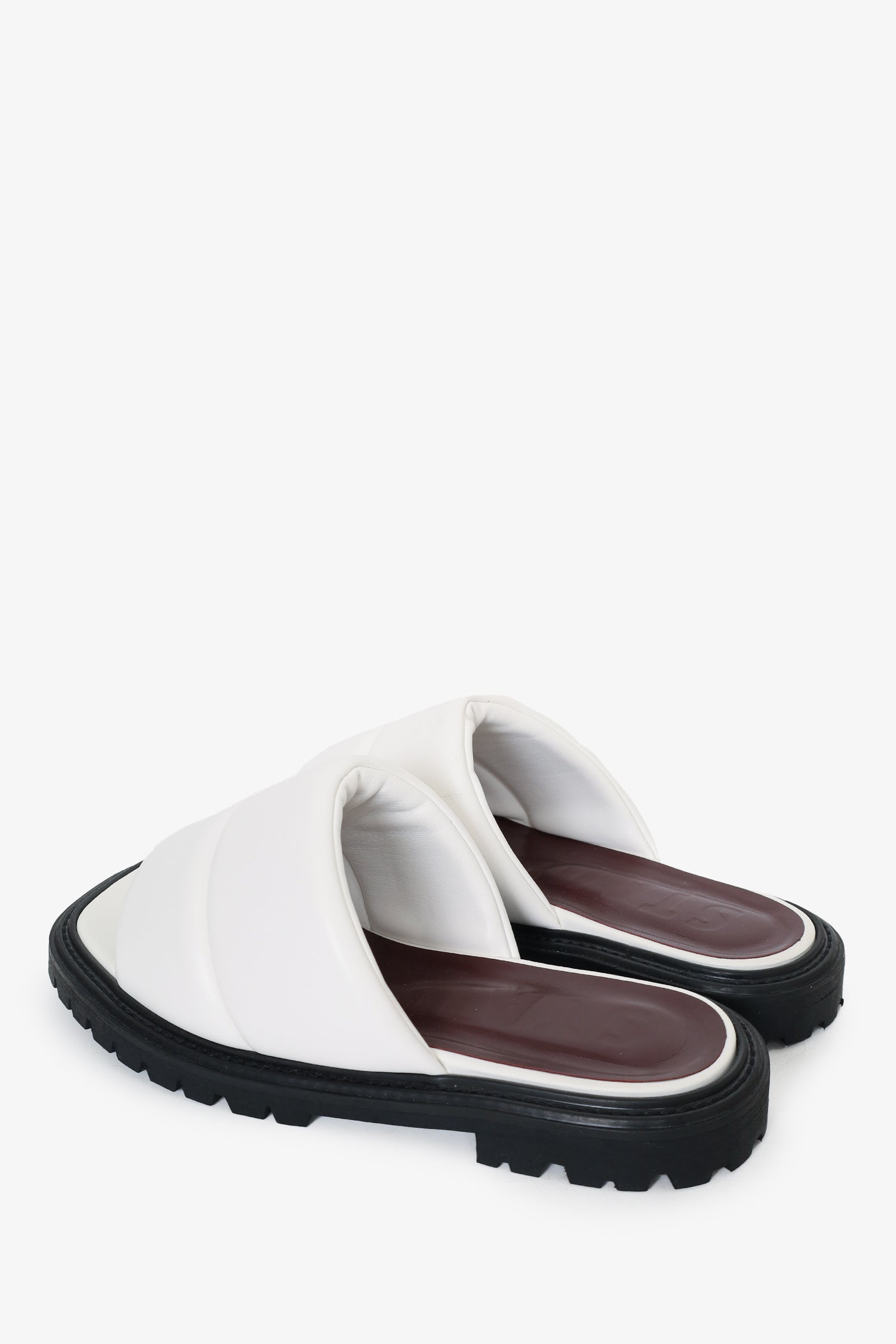 Refresh availabilityStaud White Puffer Vegan Leather Slide Sandals. Sqaure toe. Tonal stitching.