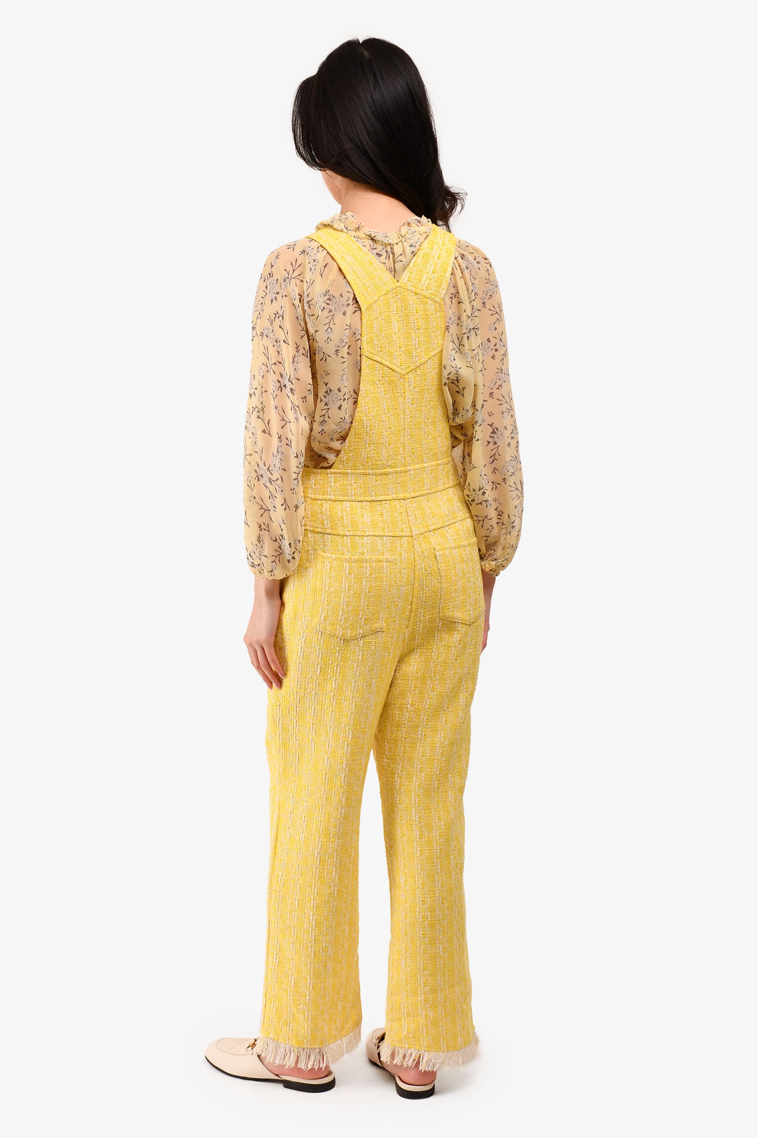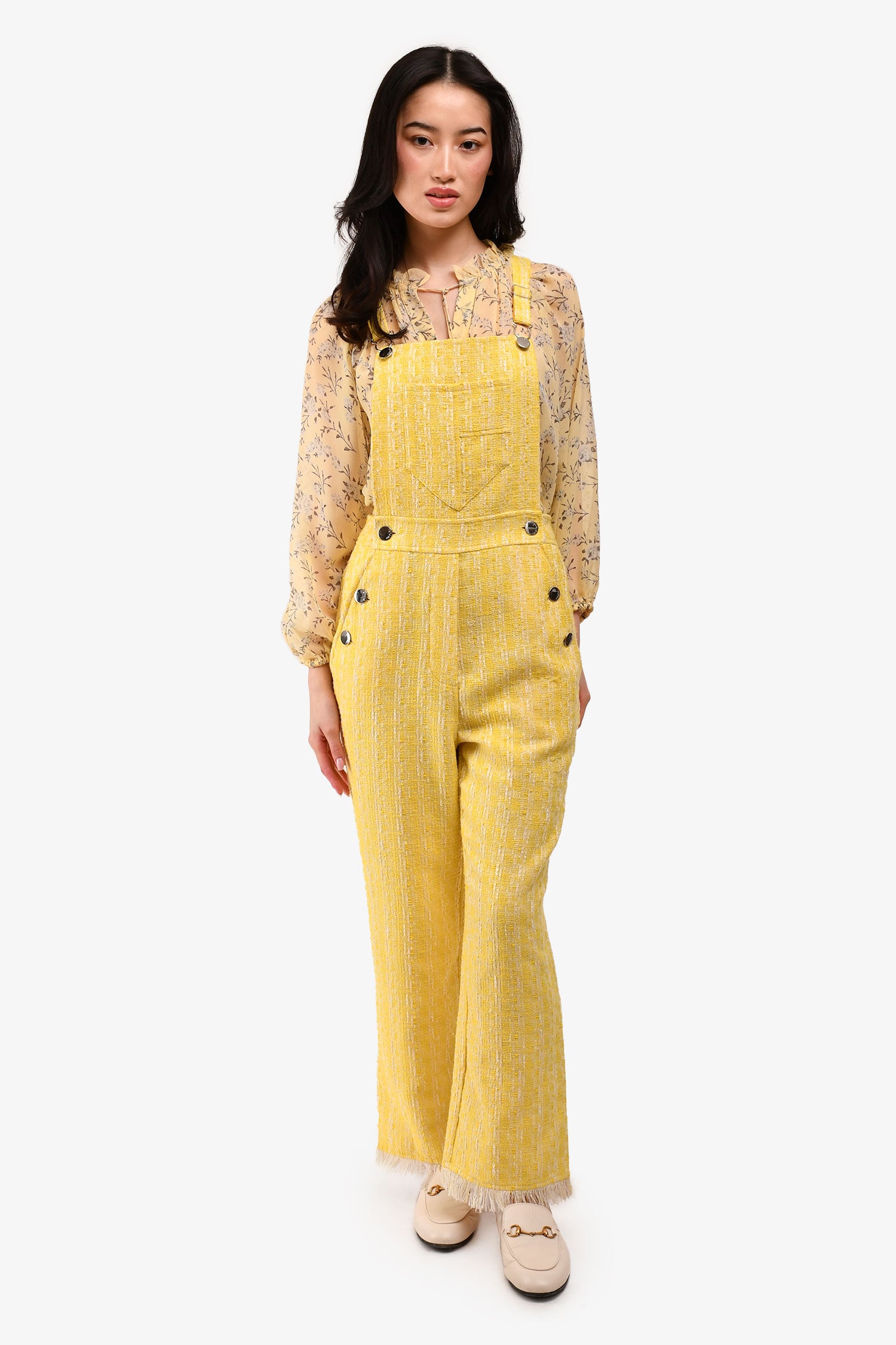 Refresh availabilityStaud Yellow/White Tweed Overalls. Silver-tone hardware. Side button closures. Adjustable straps. Single front pocket and 2 back pockets. Raw hem. Tonal stitching.