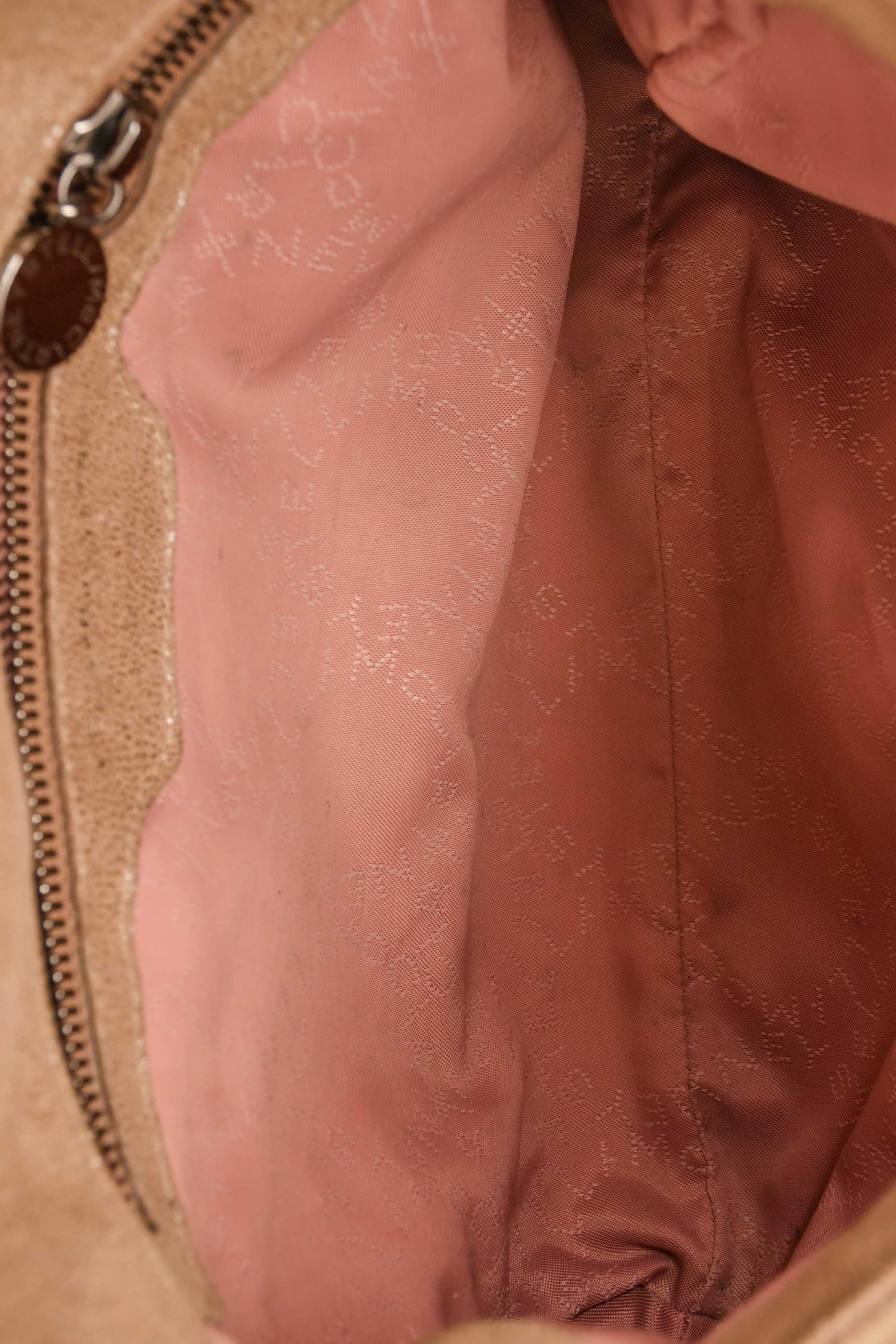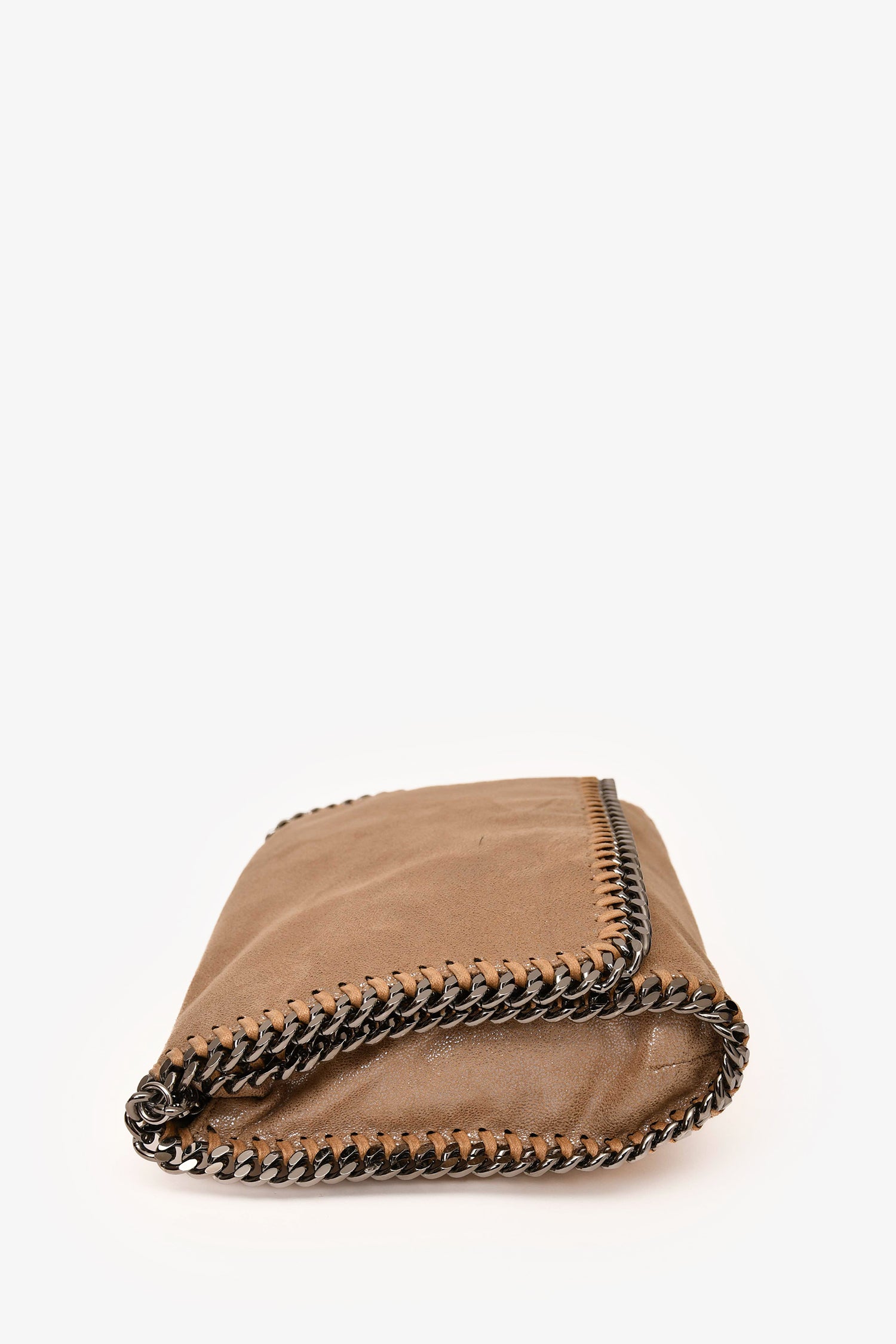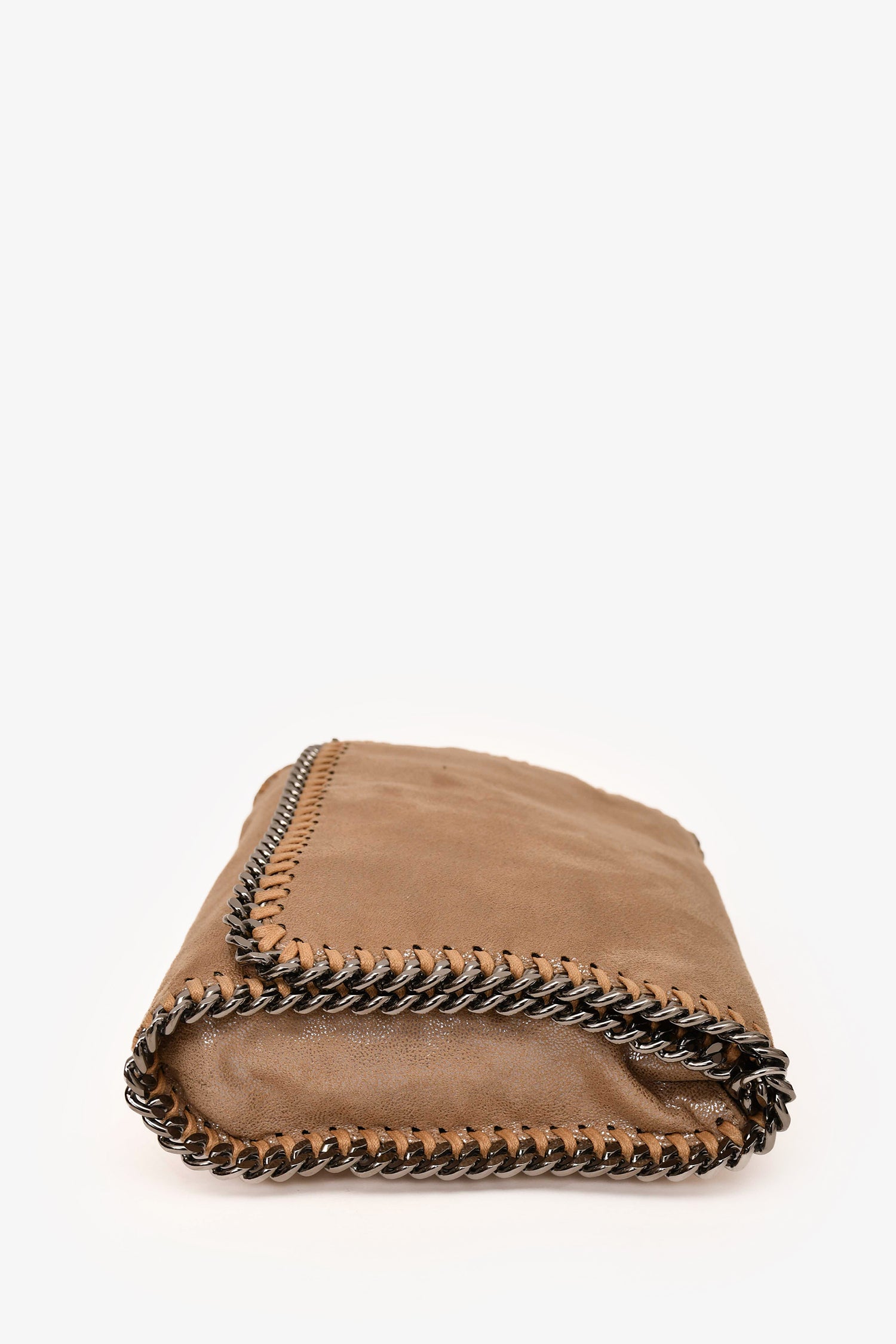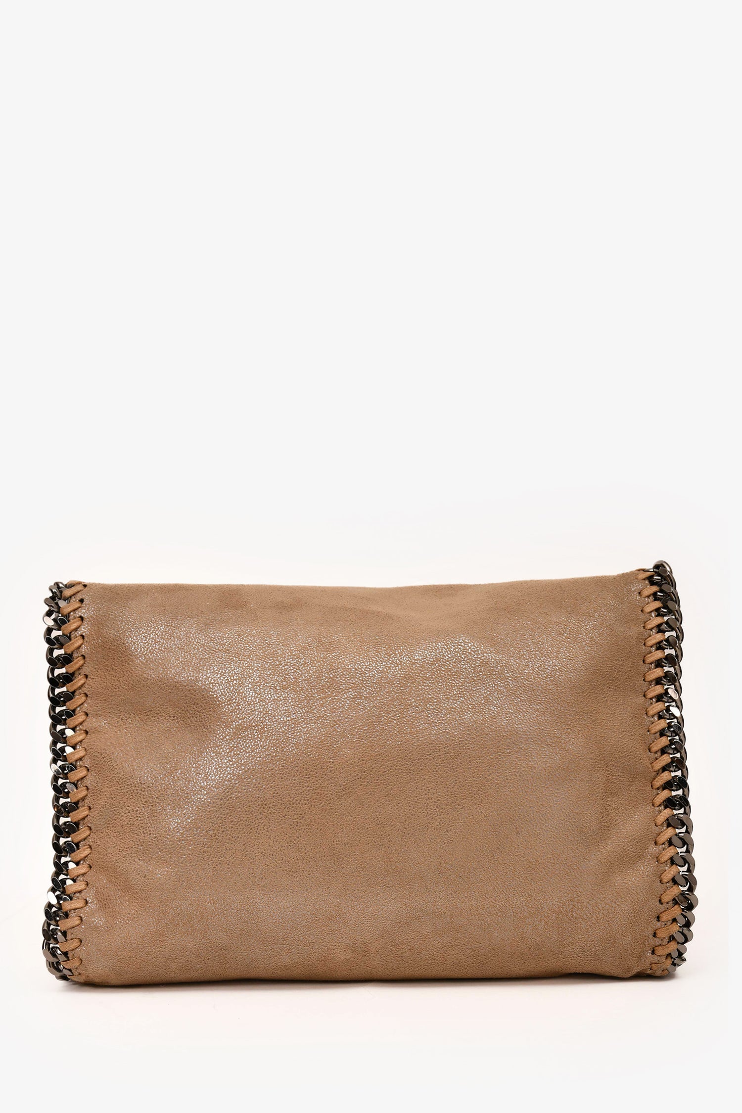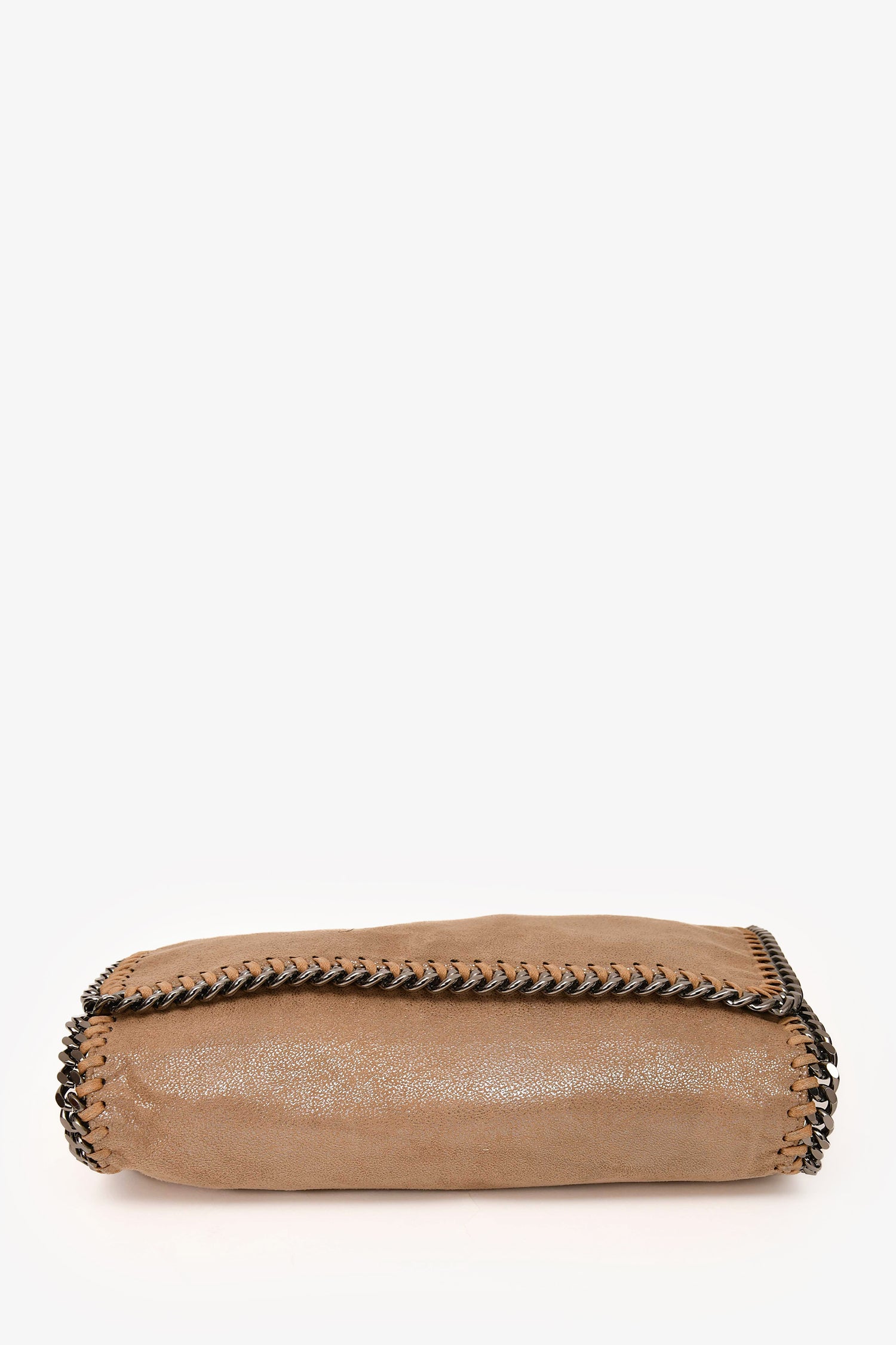 Refresh availabilityStella McCartney Beige Suede Small 'Falabella' Crossbody. Silver-tone chain link trimming. Fold-over flap with a snap closure. Chain link and leather crossbody strap.