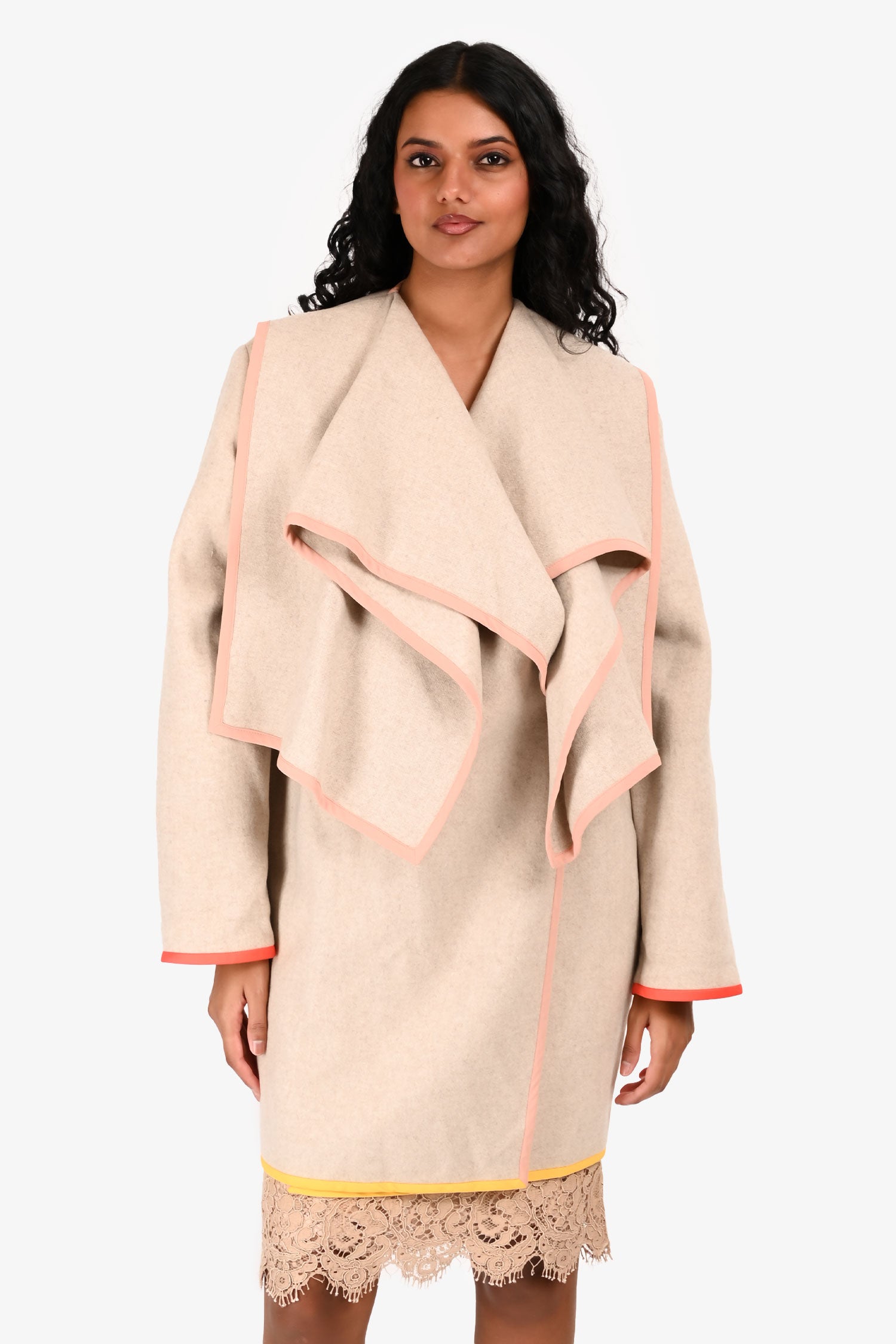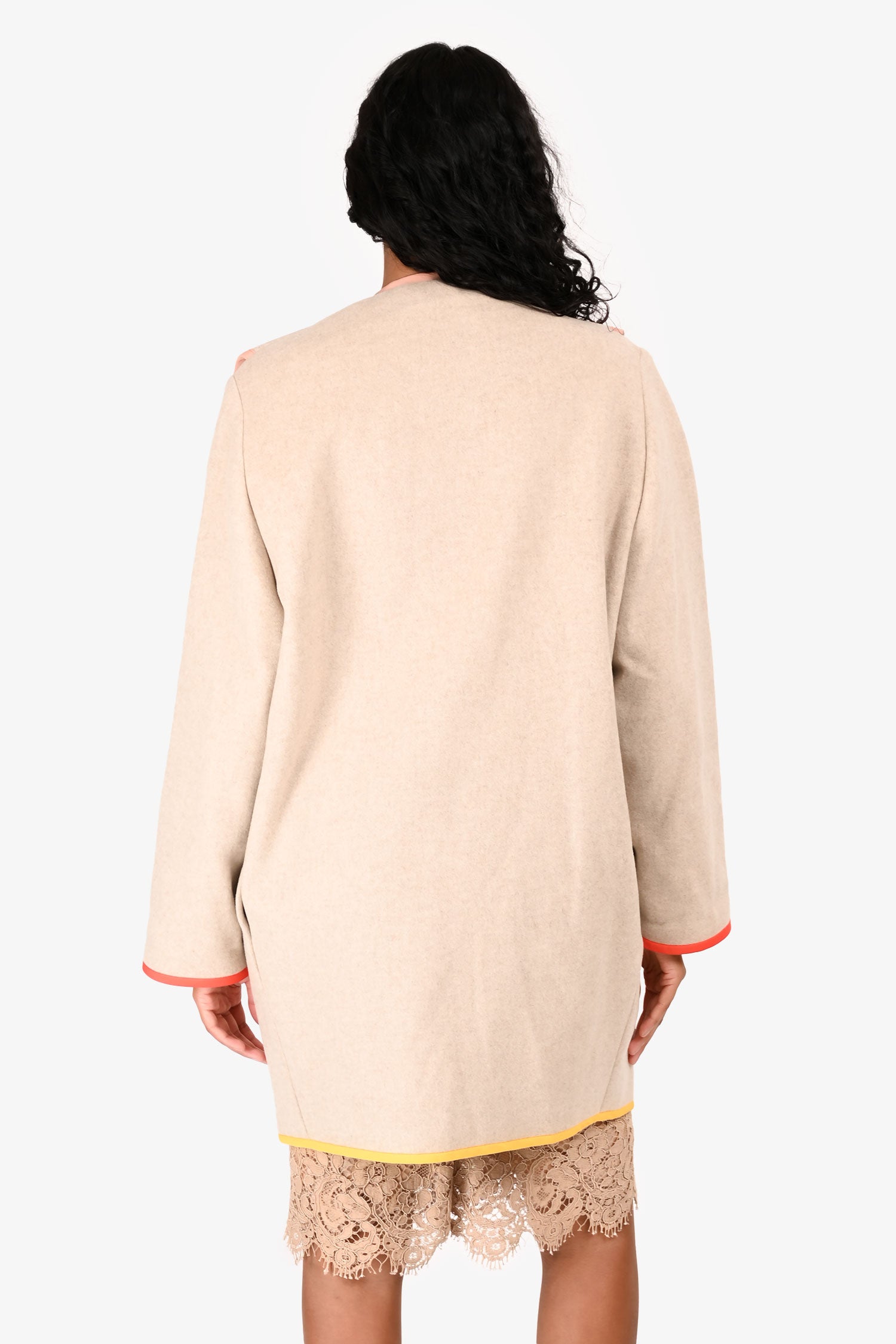 Refresh availabilityStella McCartney Beige Wool Coat. Contrast fabric trim. Single double-breasted snap button closure. Two side-seam pockets. Tonal stitching.