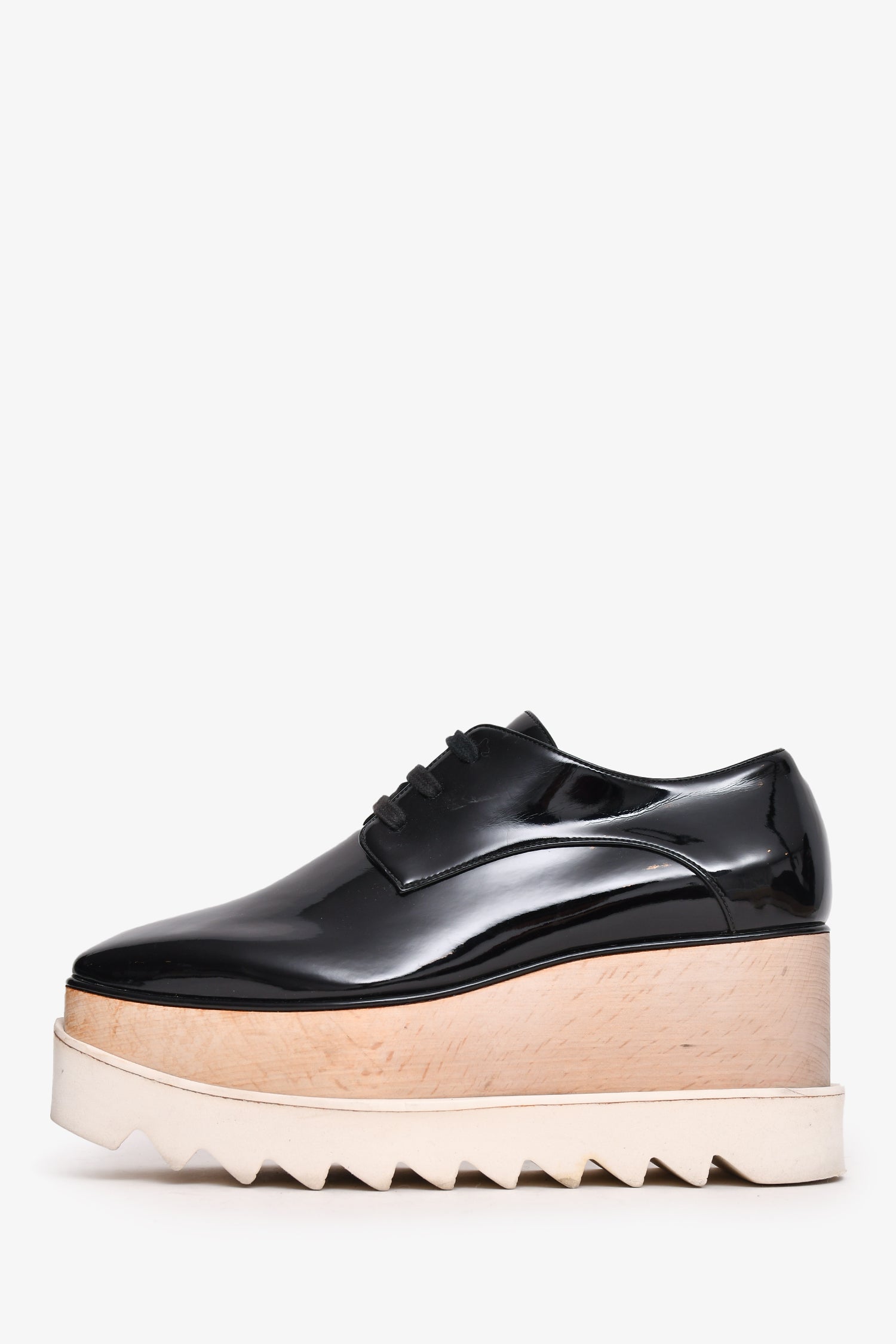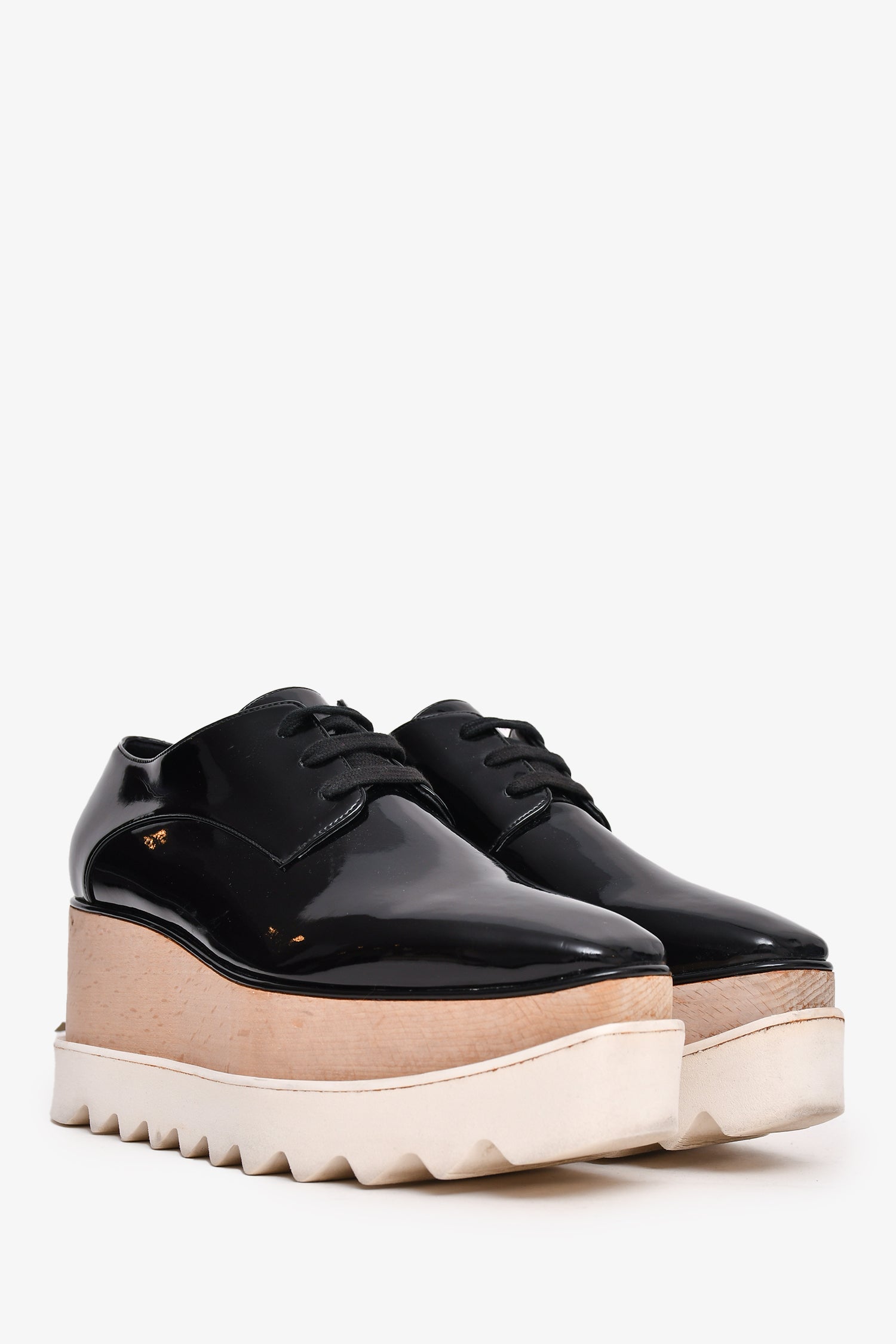 Refresh availabilityStella McCartney Black Patent Leather Platform Sneakers. Stacked platforms. Laced uppers. Tonal stitching.