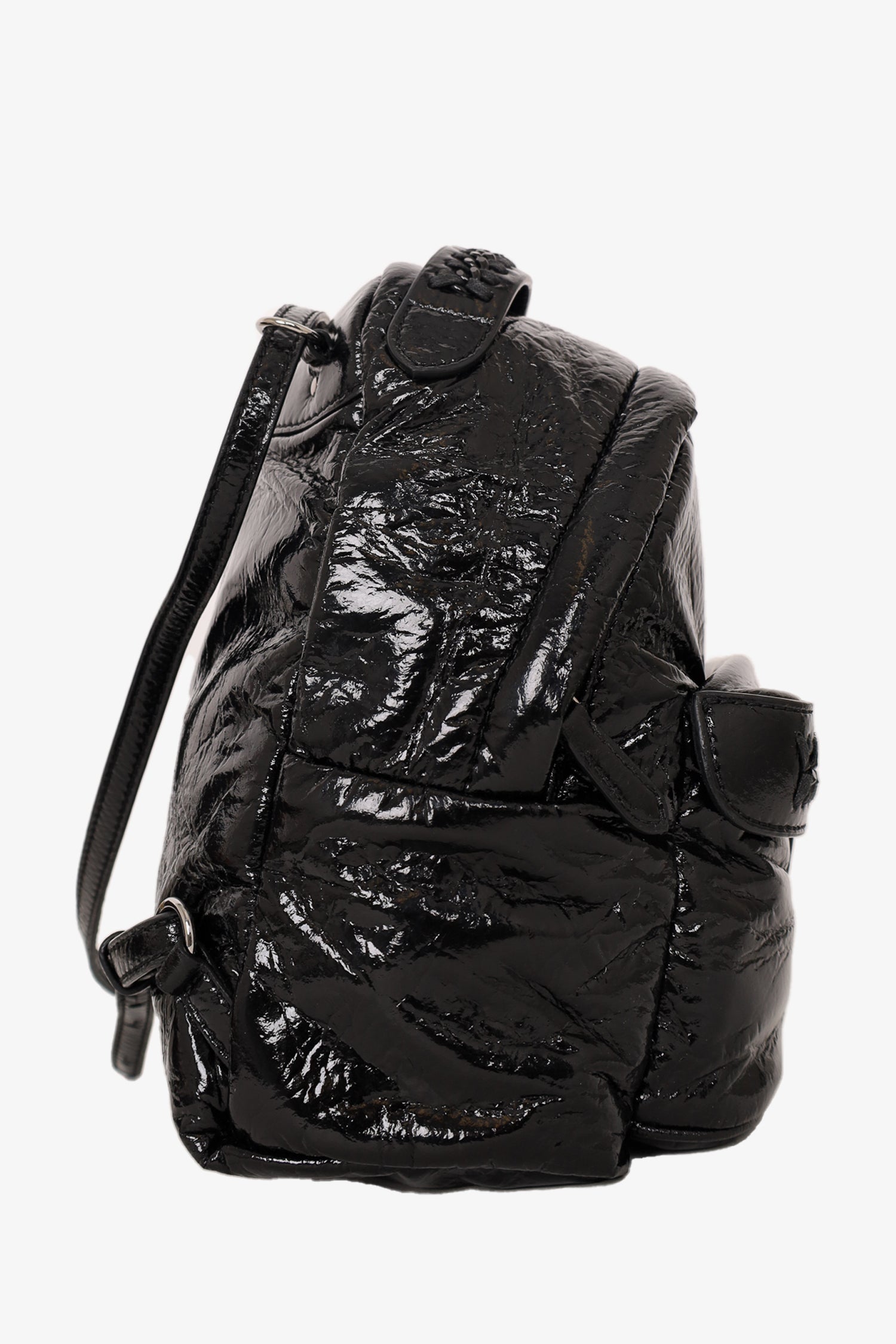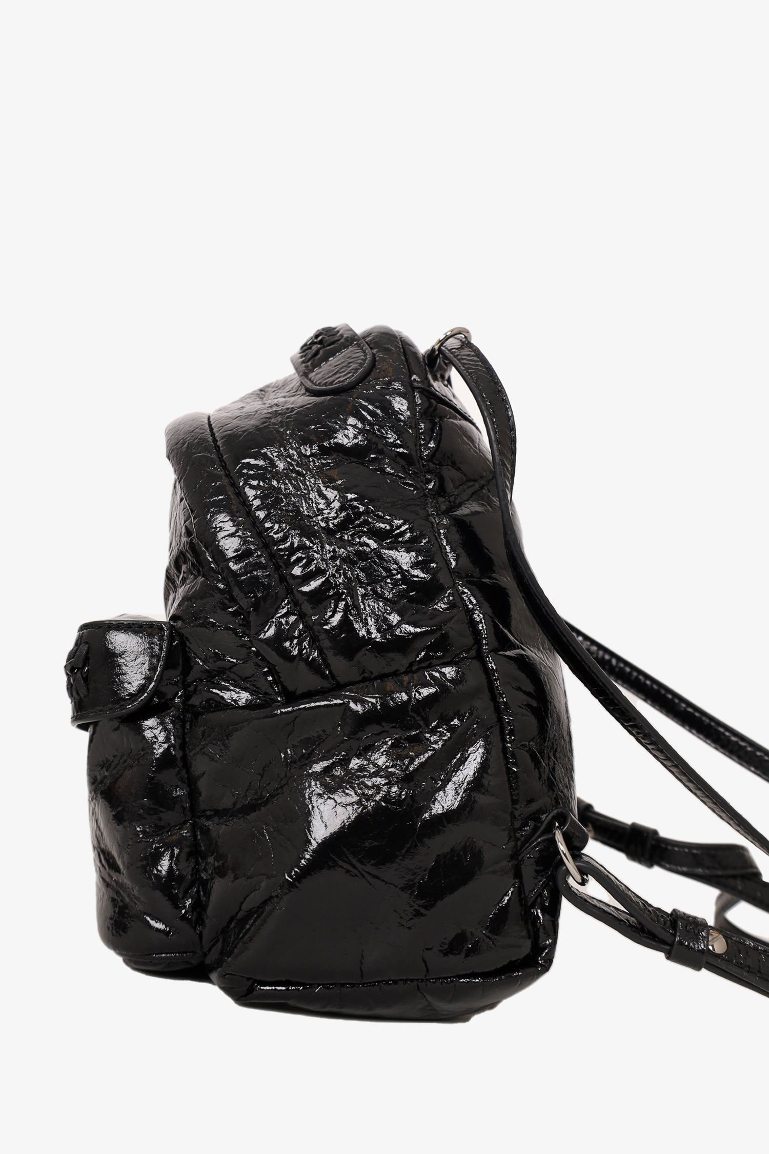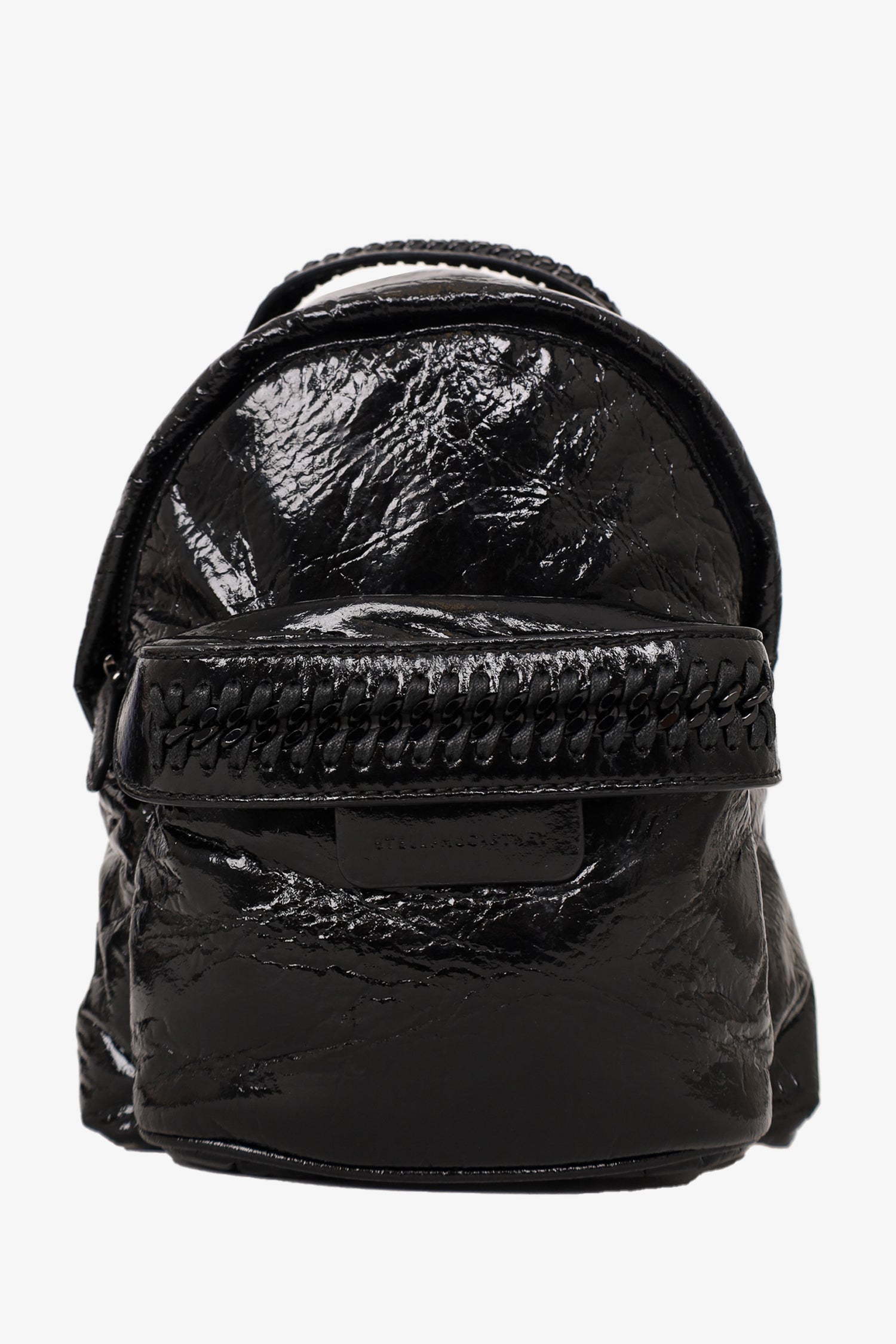 Refresh availabilityStella McCartney Black Patent Mini Backpack. Top zipper closure. Front flap pocket with magnetic closure. Single interior open pocket. Adjustable backpack straps. Silver-toned hardware. Tonal stitching.