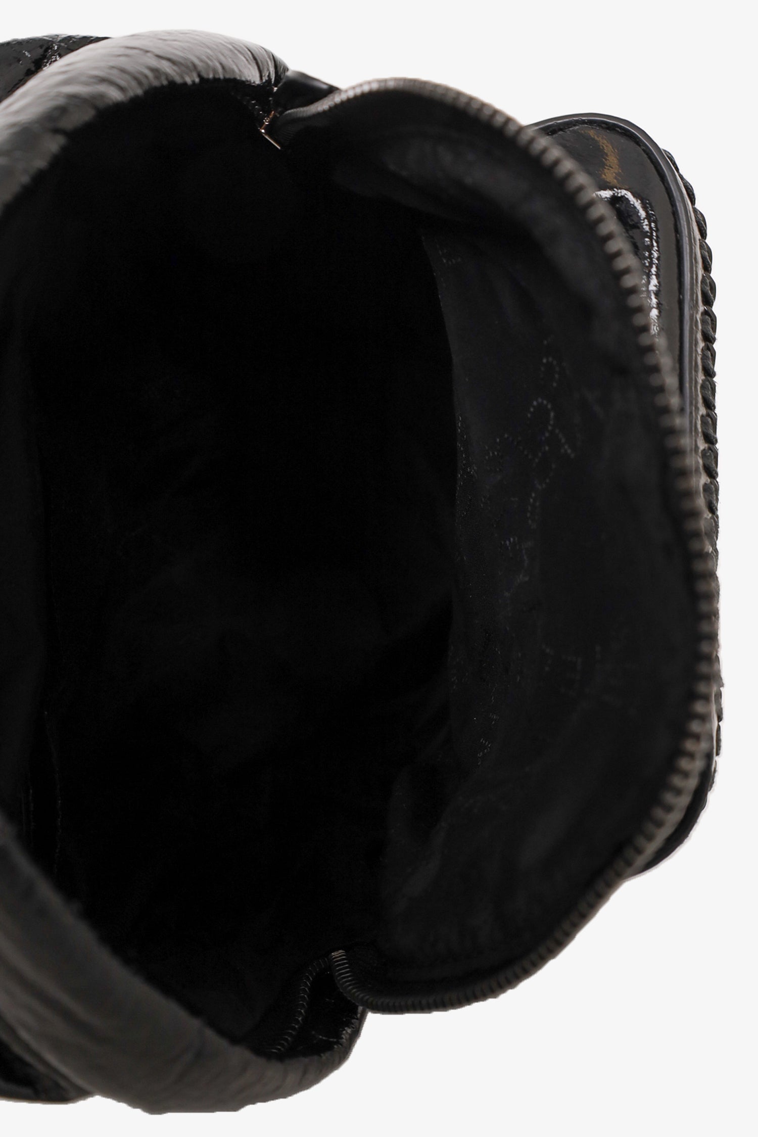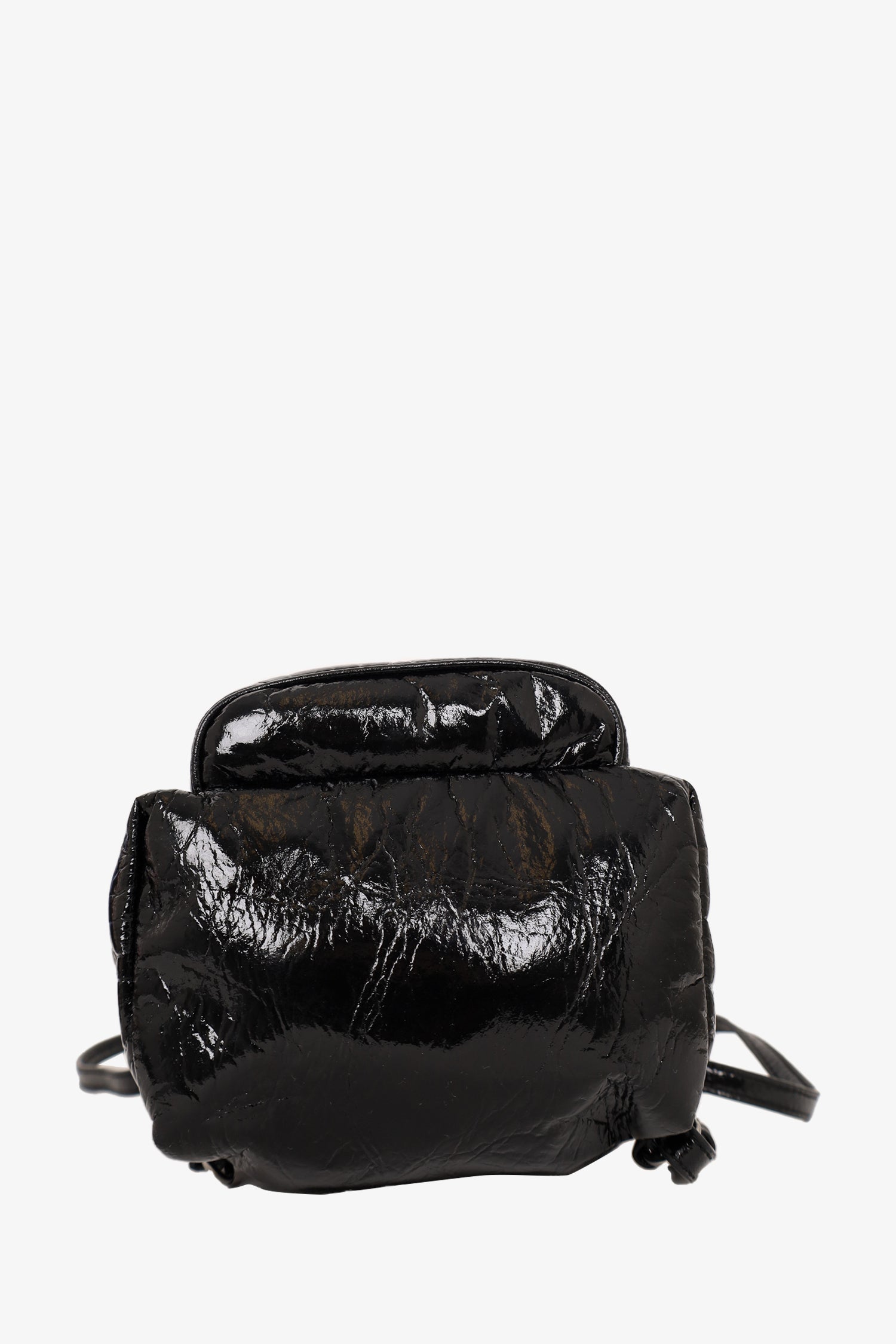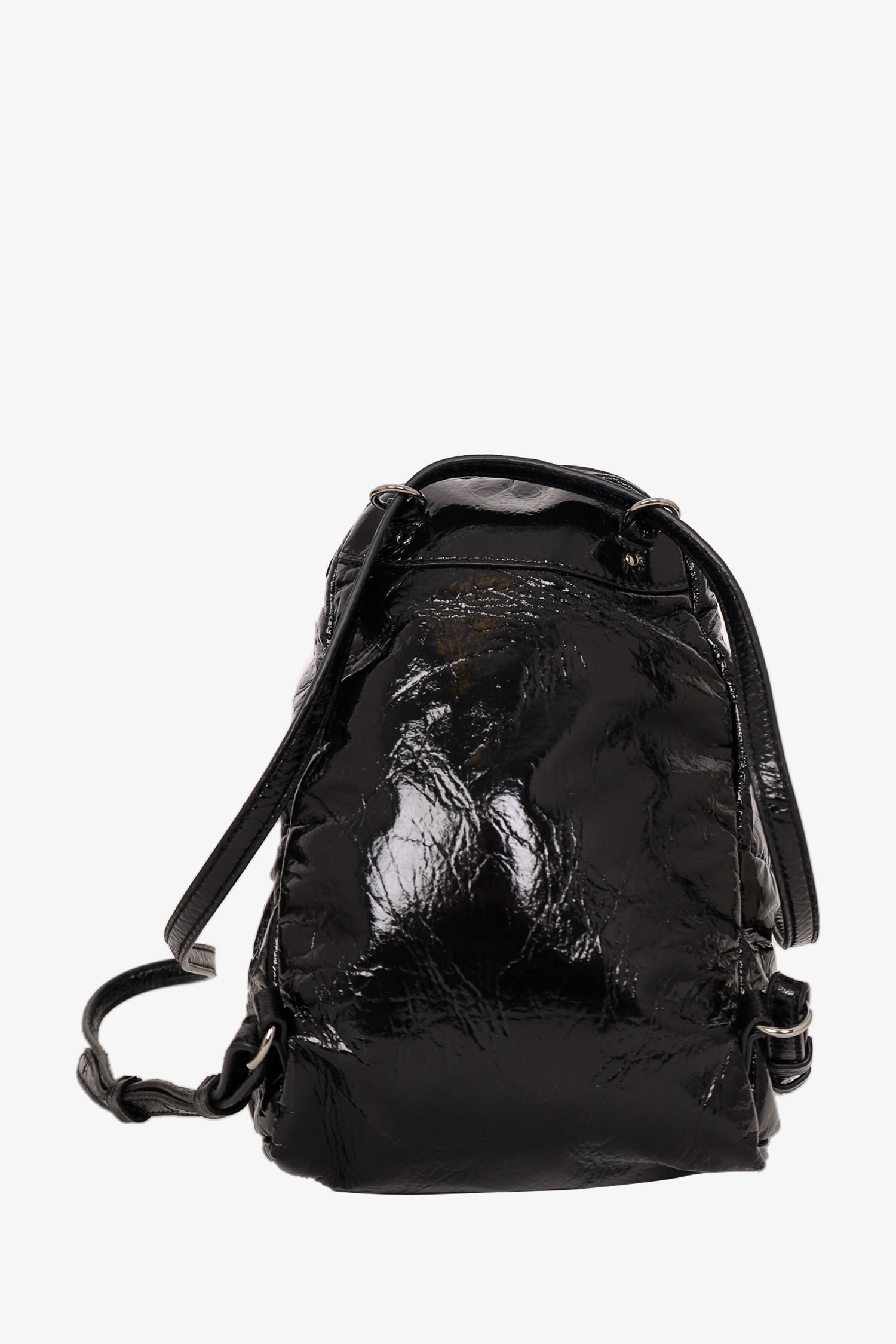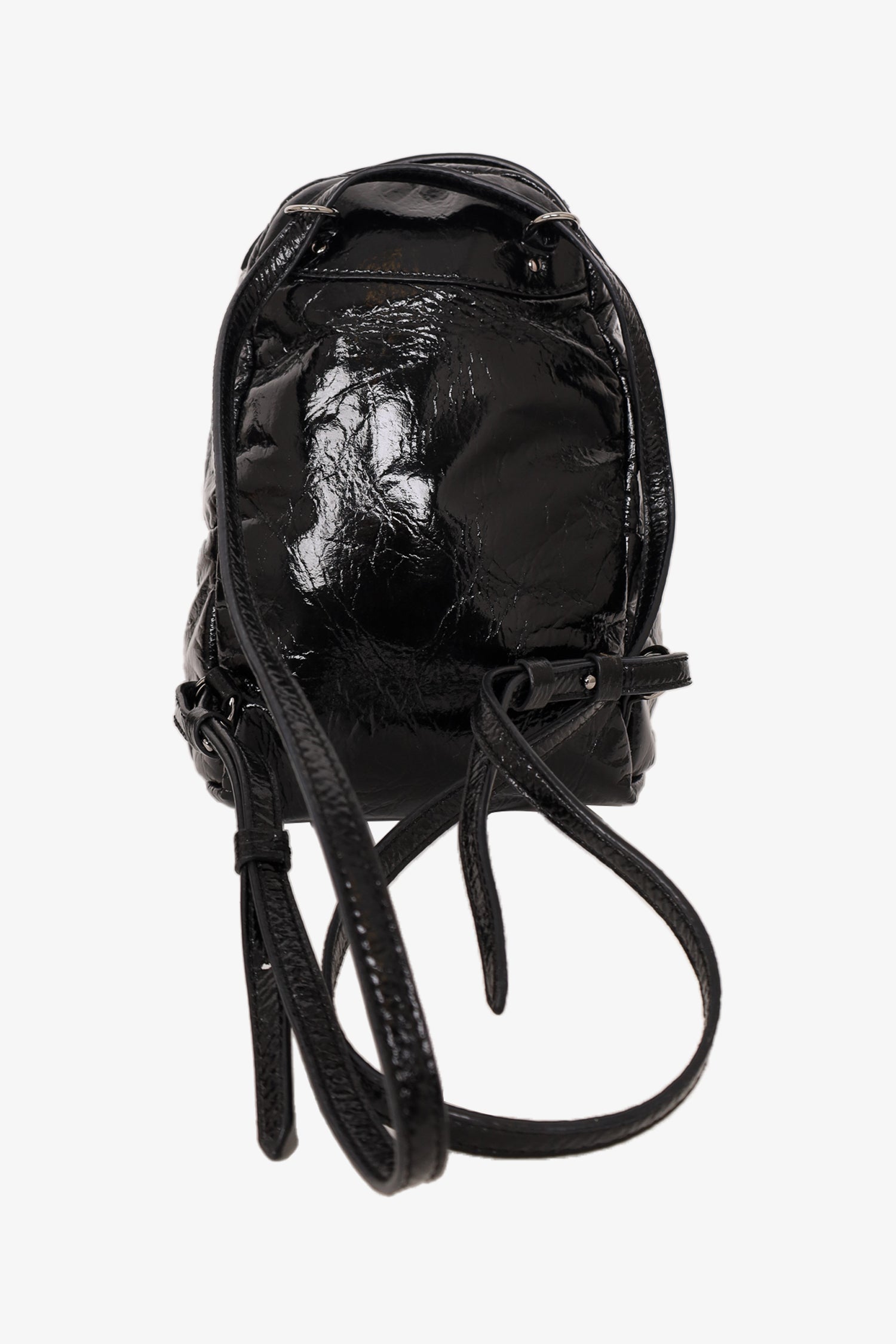 Refresh availabilityStella McCartney Black Patent Mini Backpack. Top zipper closure. Front flap pocket with magnetic closure. Single interior open pocket. Adjustable backpack straps. Silver-toned hardware. Tonal stitching.