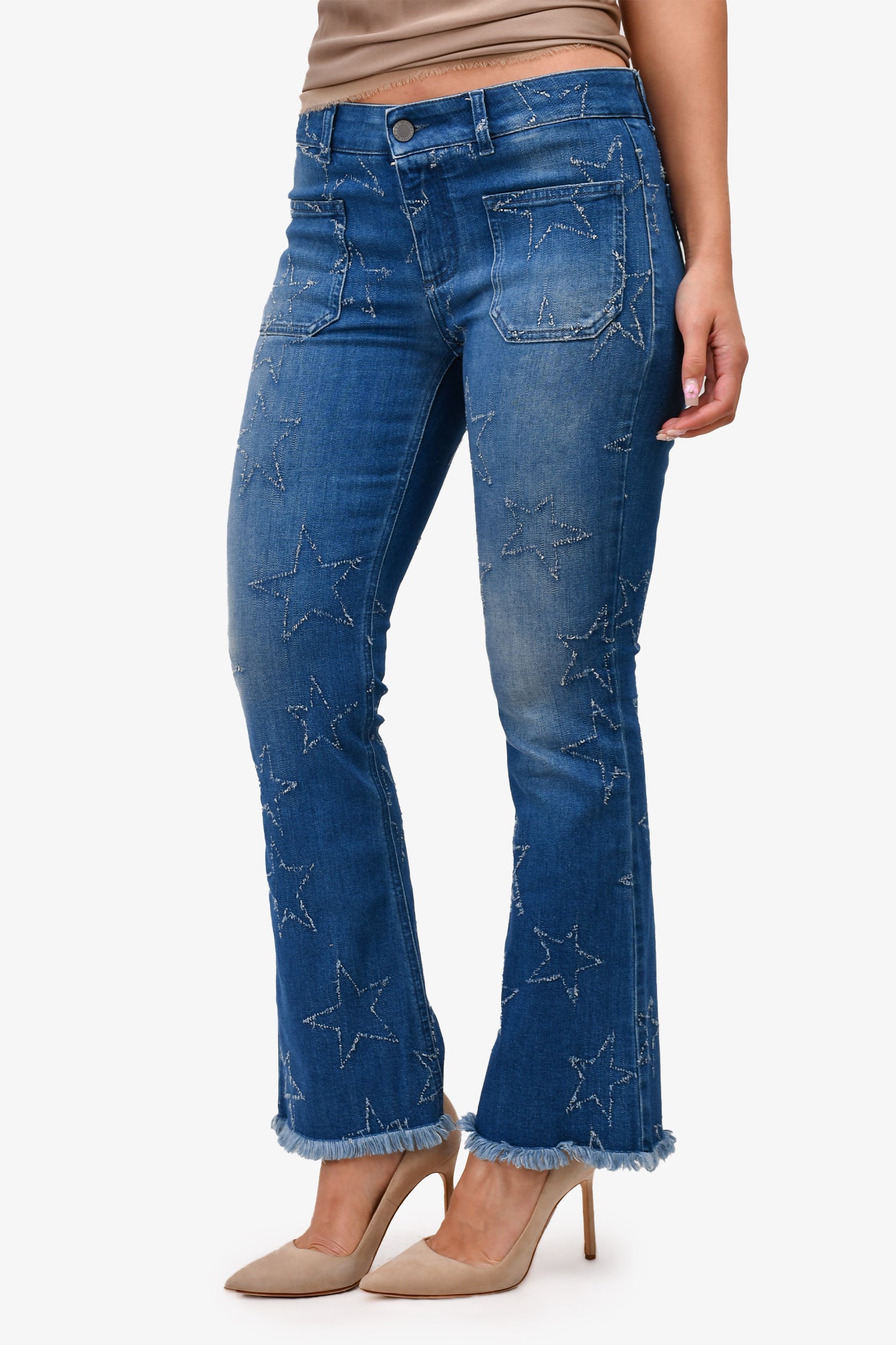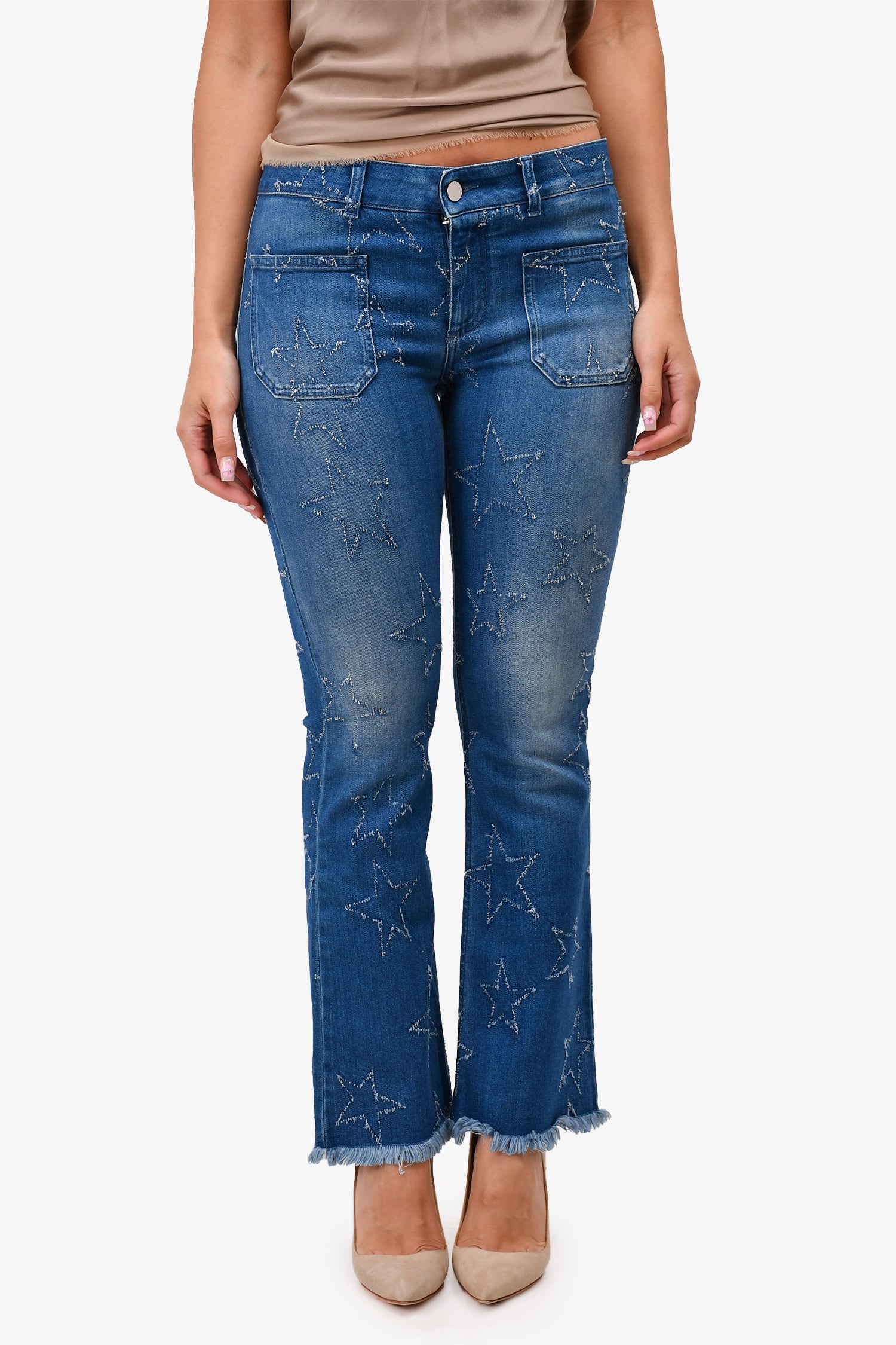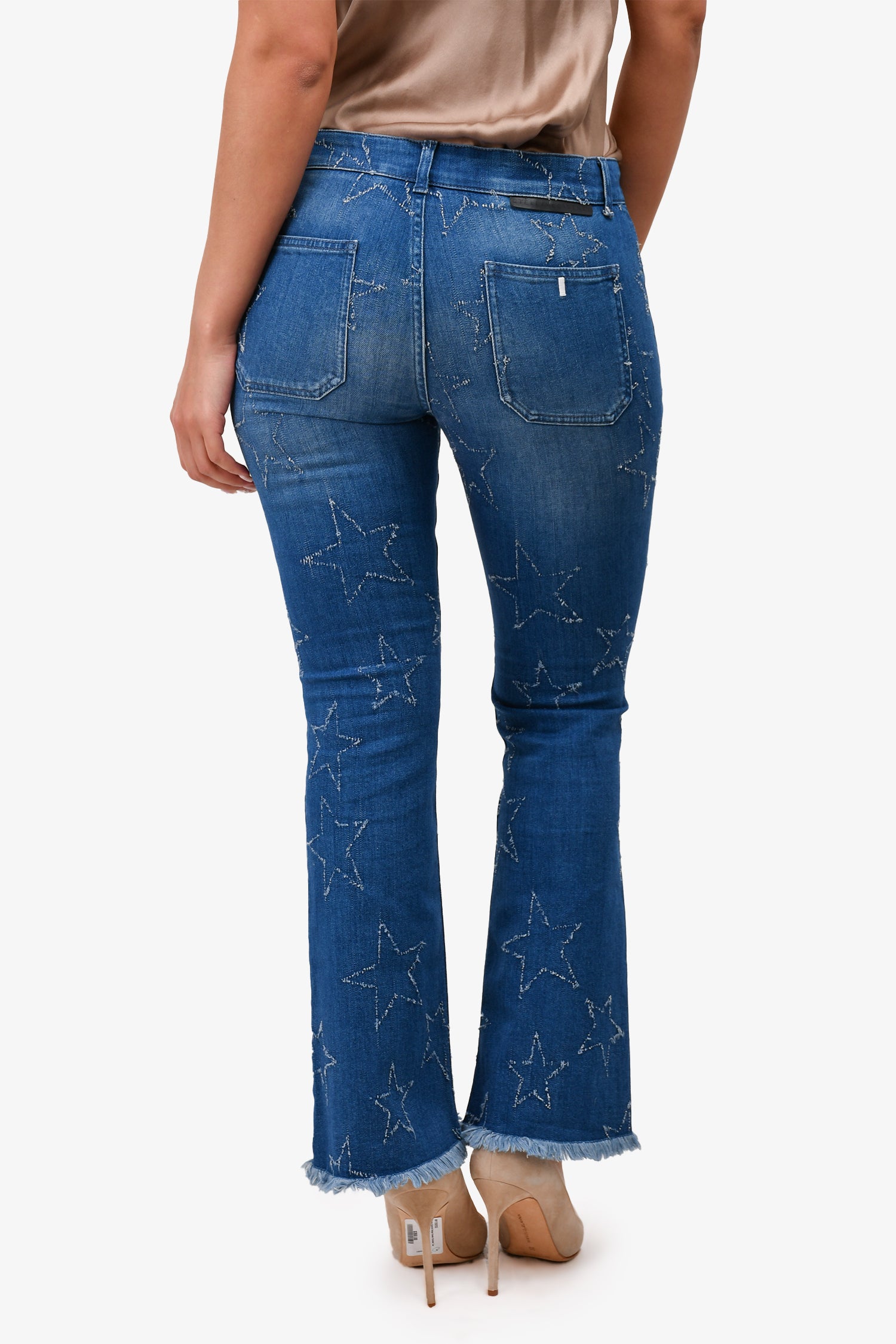 Refresh availabilityStella McCartney Blue Denim Star Patterned Flare Legged Jeans. Tonal and contrast stitching. Silver-tone hardware. Zipped and front button closure.