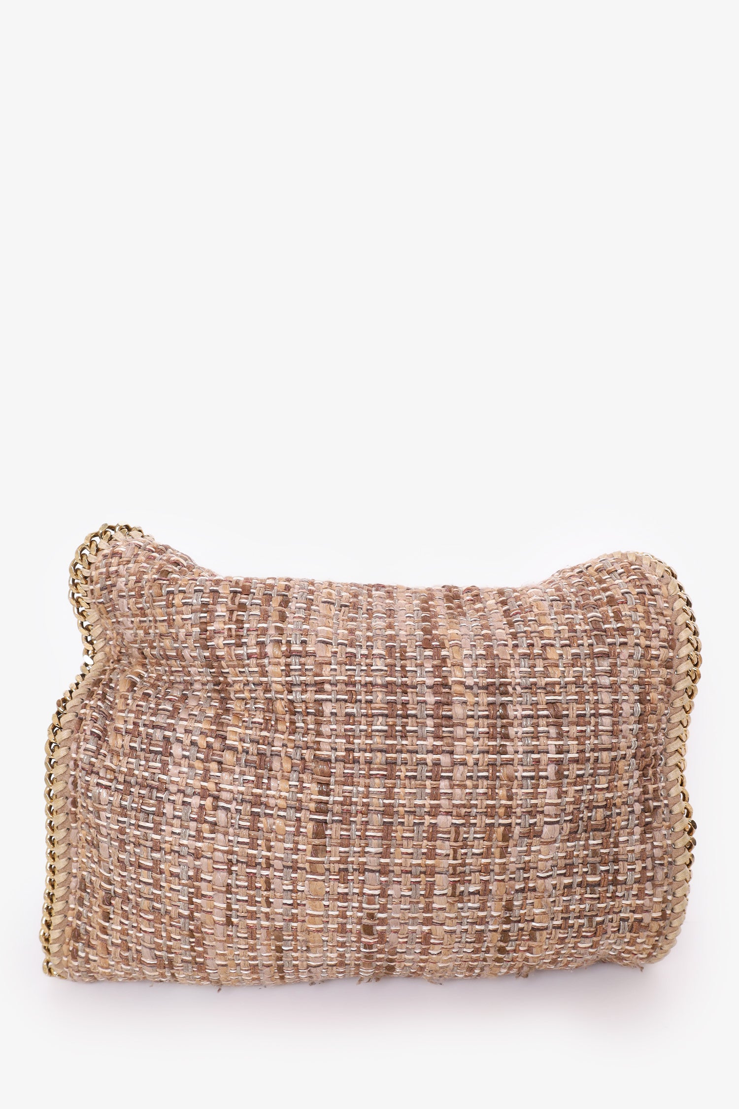 Refresh availabilityStella McCartney Brown Tweed Falabella Boucle Fold-over Tote Bag. Top magnetic button closure. Single interior wall pocket with zip closure. Silver and gold-tone chain handles and shoulder strap. Tonal stitching.