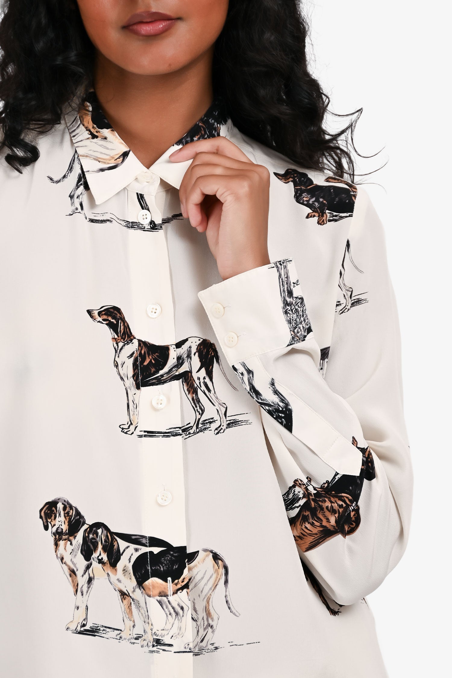 Refresh availabilityStella McCartney Cream Dog Printed Silk Blouse. Classic collar. Long sleeves with button cuffs. Front button closure. Tonal stitching.