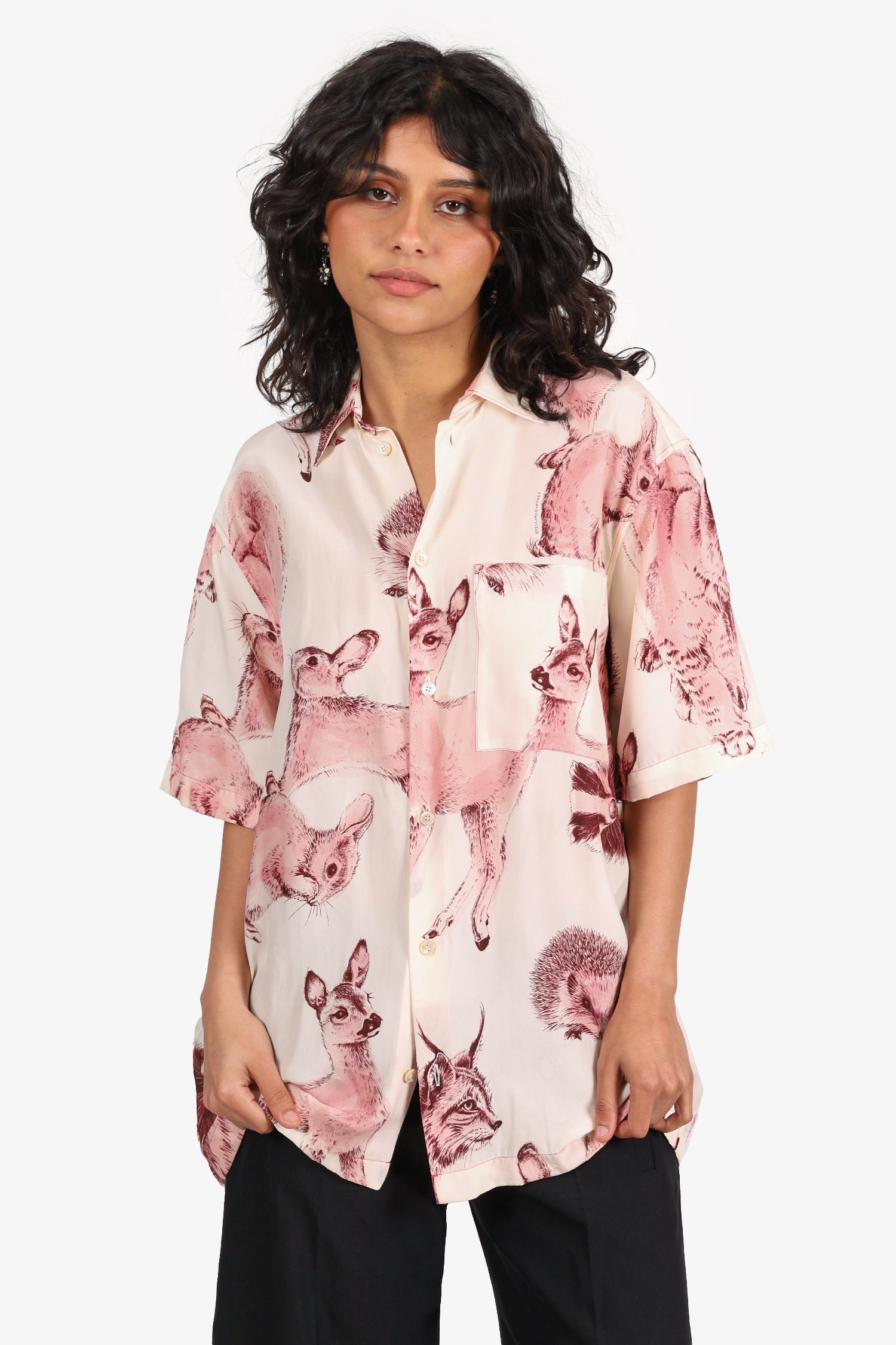 Refresh availabilityStella McCartney Cream/Red Silk Animal Print Button Up Blouse. Pull-on. Collared-neckline. Front button-up closure. Single exterior slip pocket. Tonal stitching.
