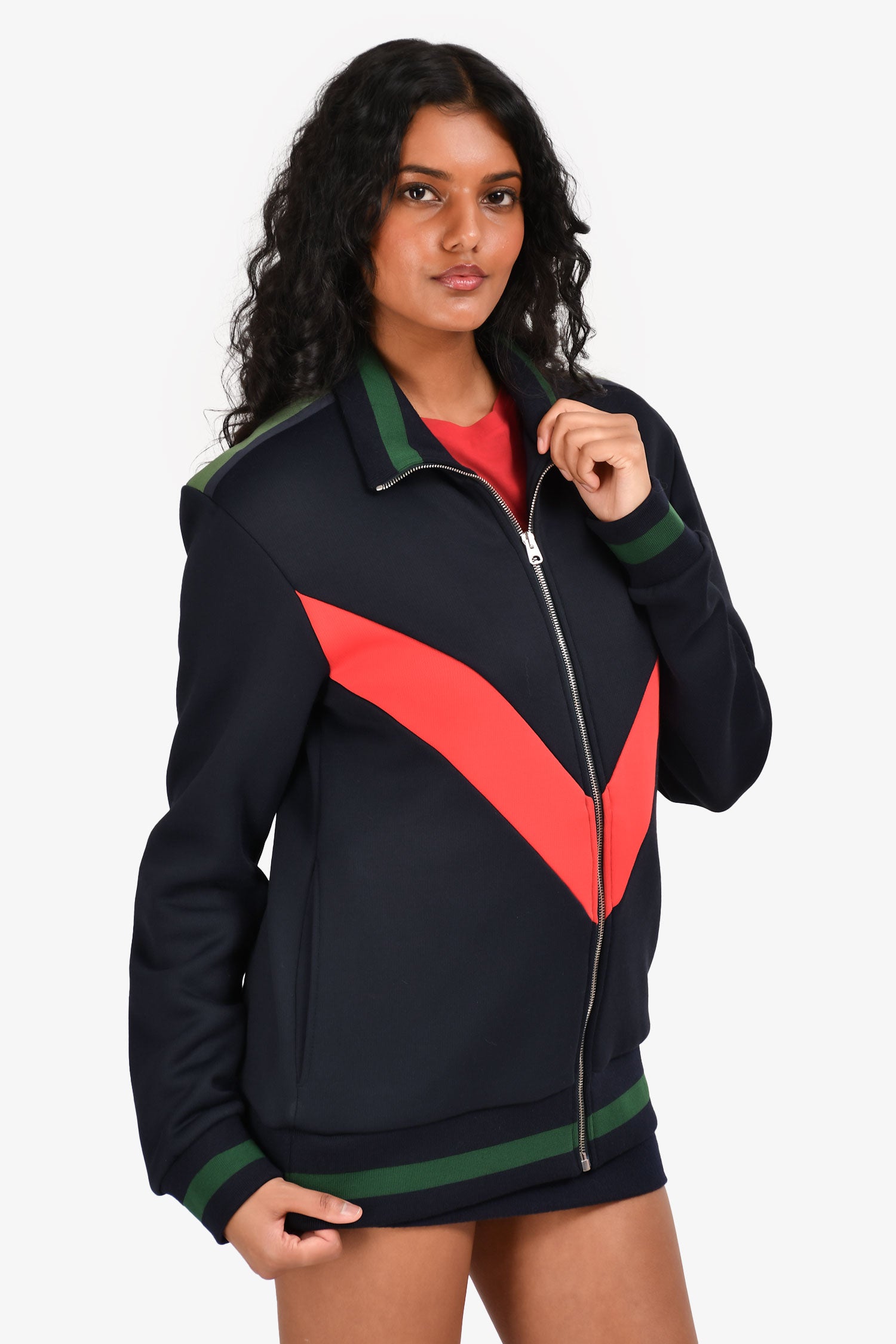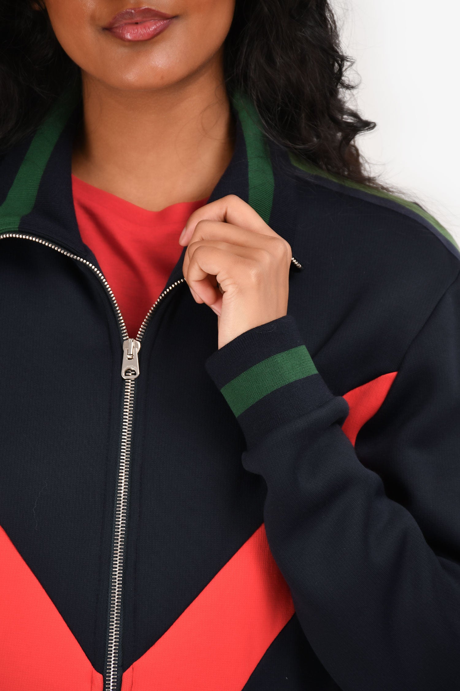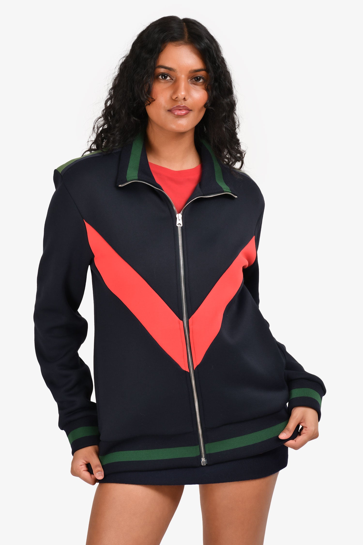 Refresh availabilityStella McCartney Navy Red/Green Stripe Zip Up Jacket. Ribbed collar, hem and cuffs. Zip-up closure. Two slip pockets on the sides. Silver-tone hardware. Tonal stitching.