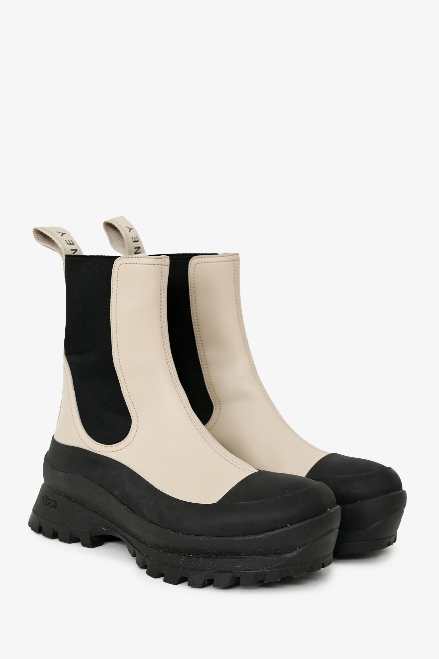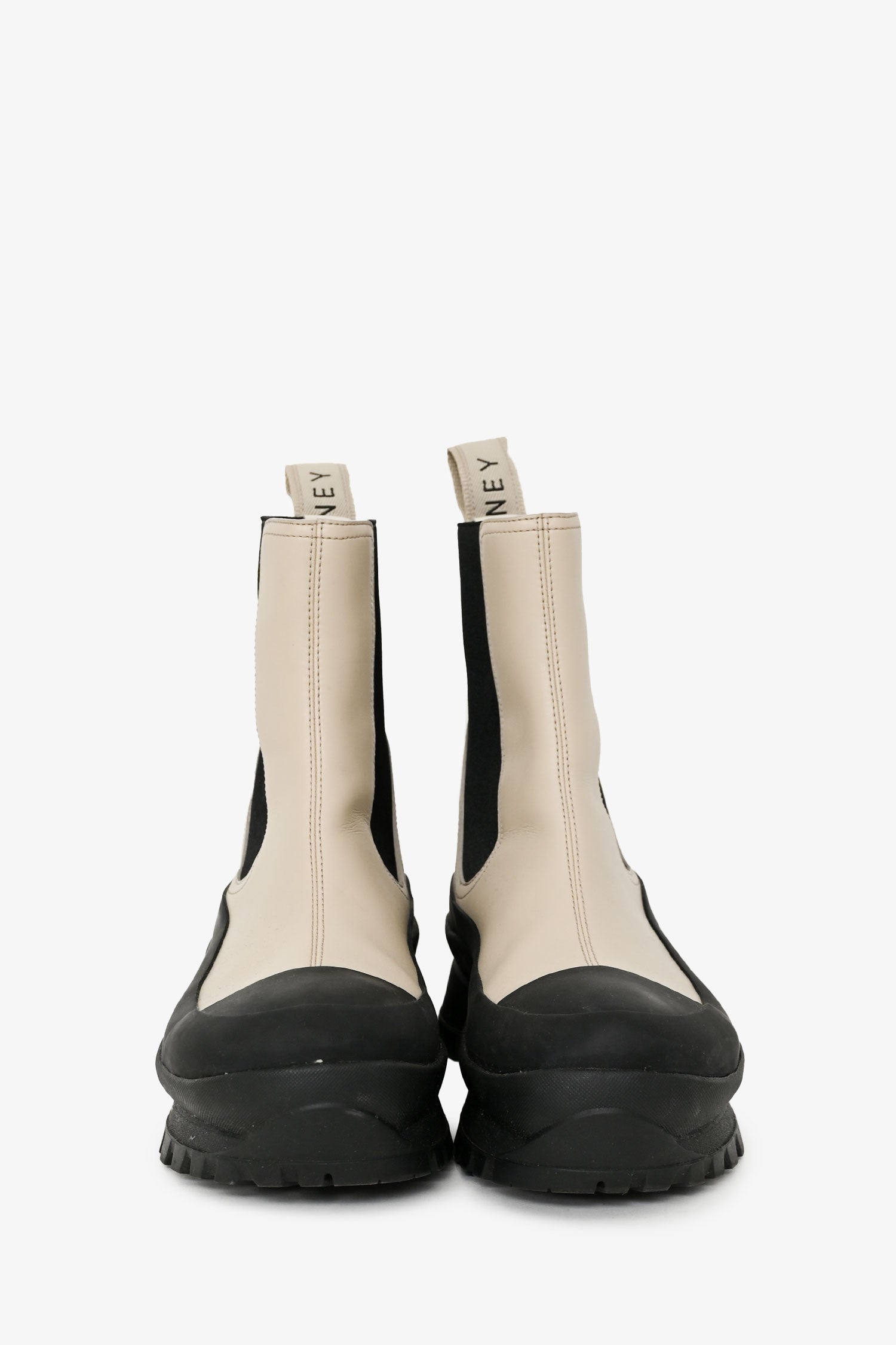 Refresh availabilityStella McCartney Taupe Rubber 'Trace' Chelsea Boots. Pull-on. Round toe. Rear pull tabs. Leather insole. Rubber sole. Tonal stitching.