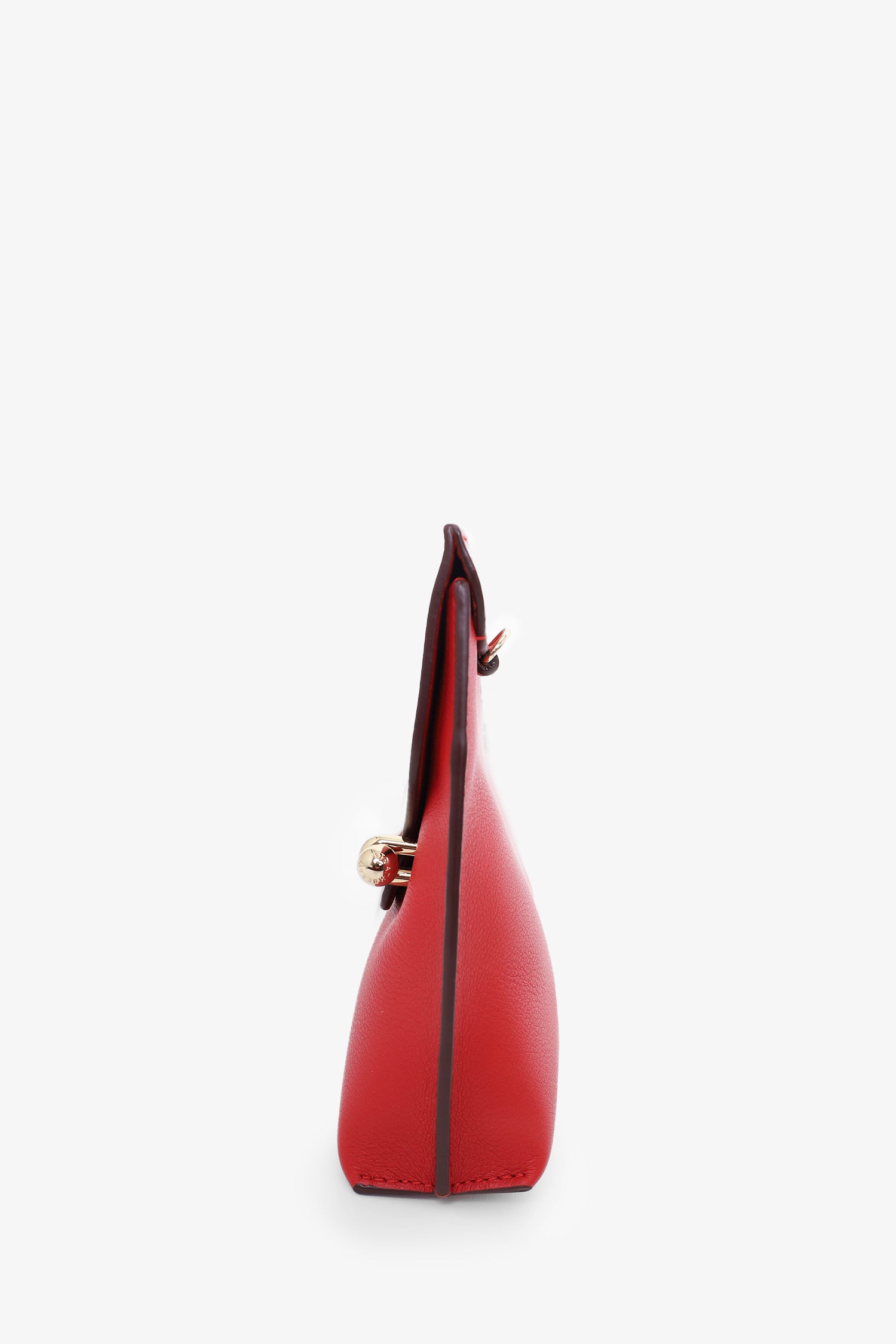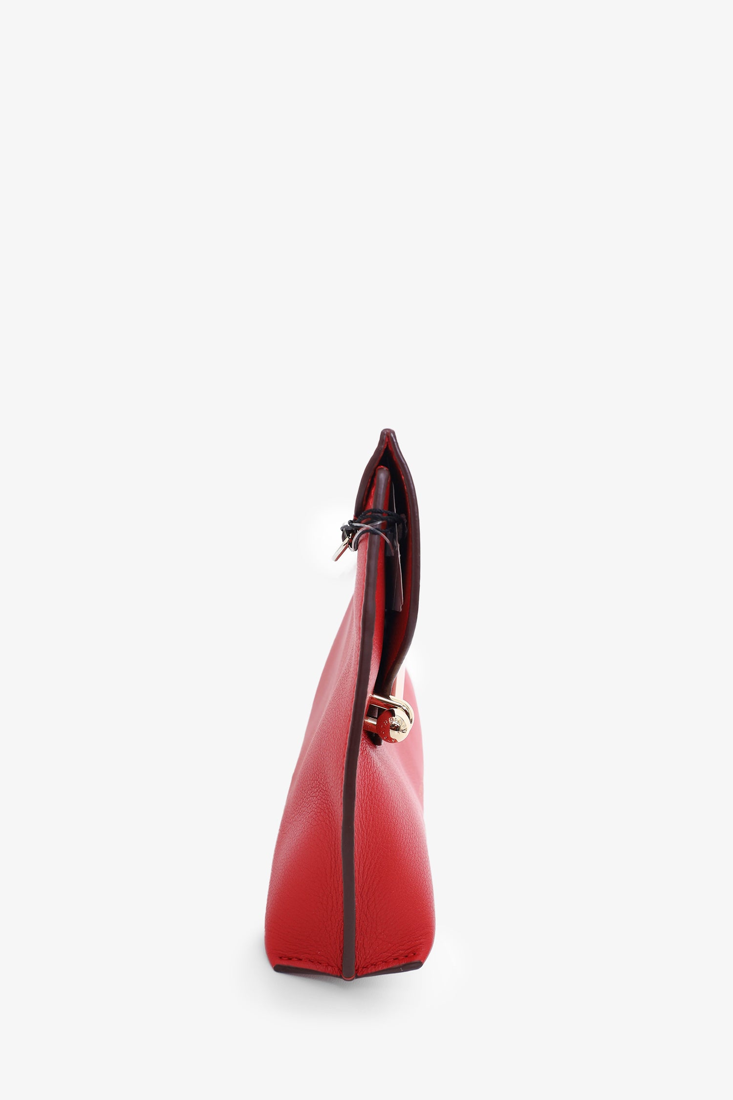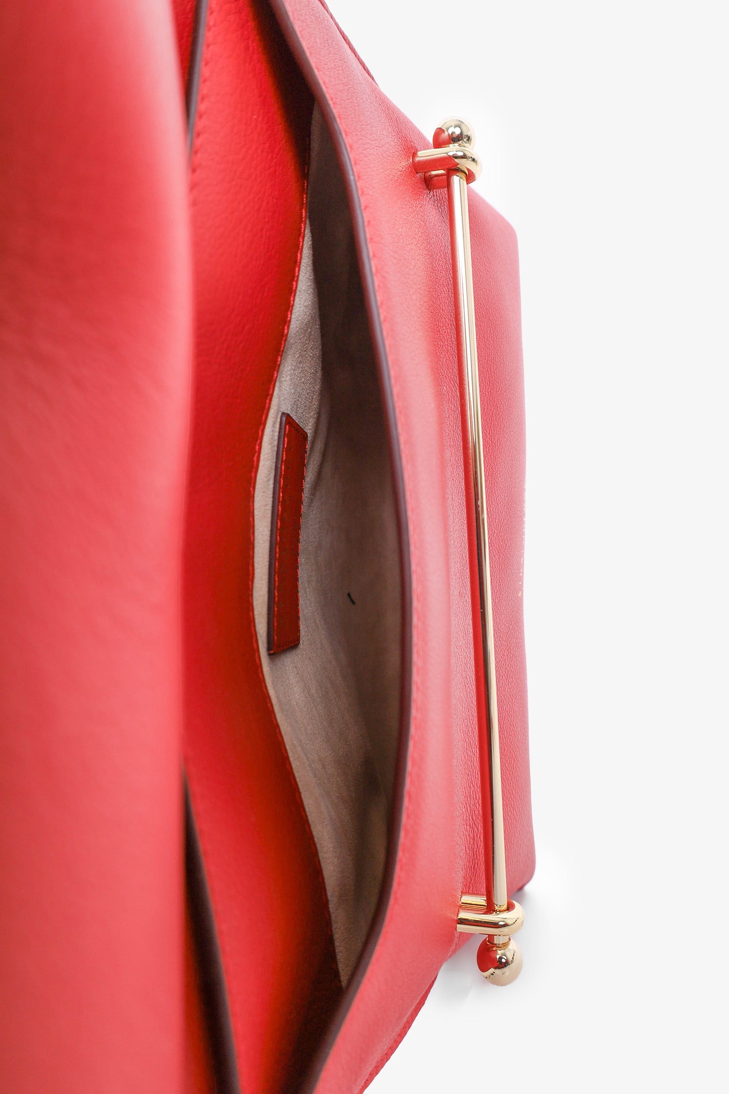 Refresh availabilityStrathberry Red Leather Chain Shoulder Bag. Fold-over flap with pull-through closure. Open suede interior. Detachable crossbody strap. Gold-tone hardware. Tonal stitching.
