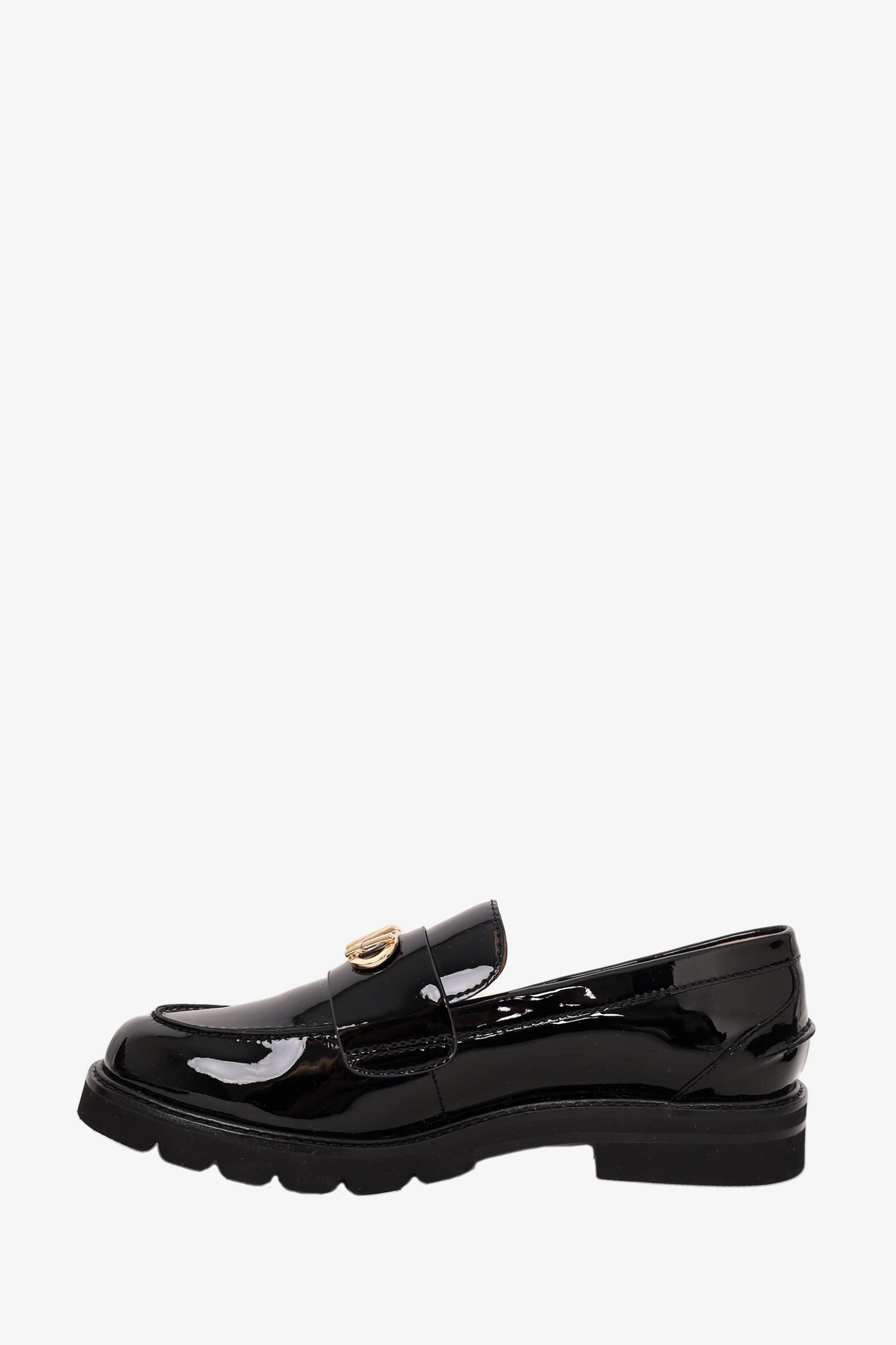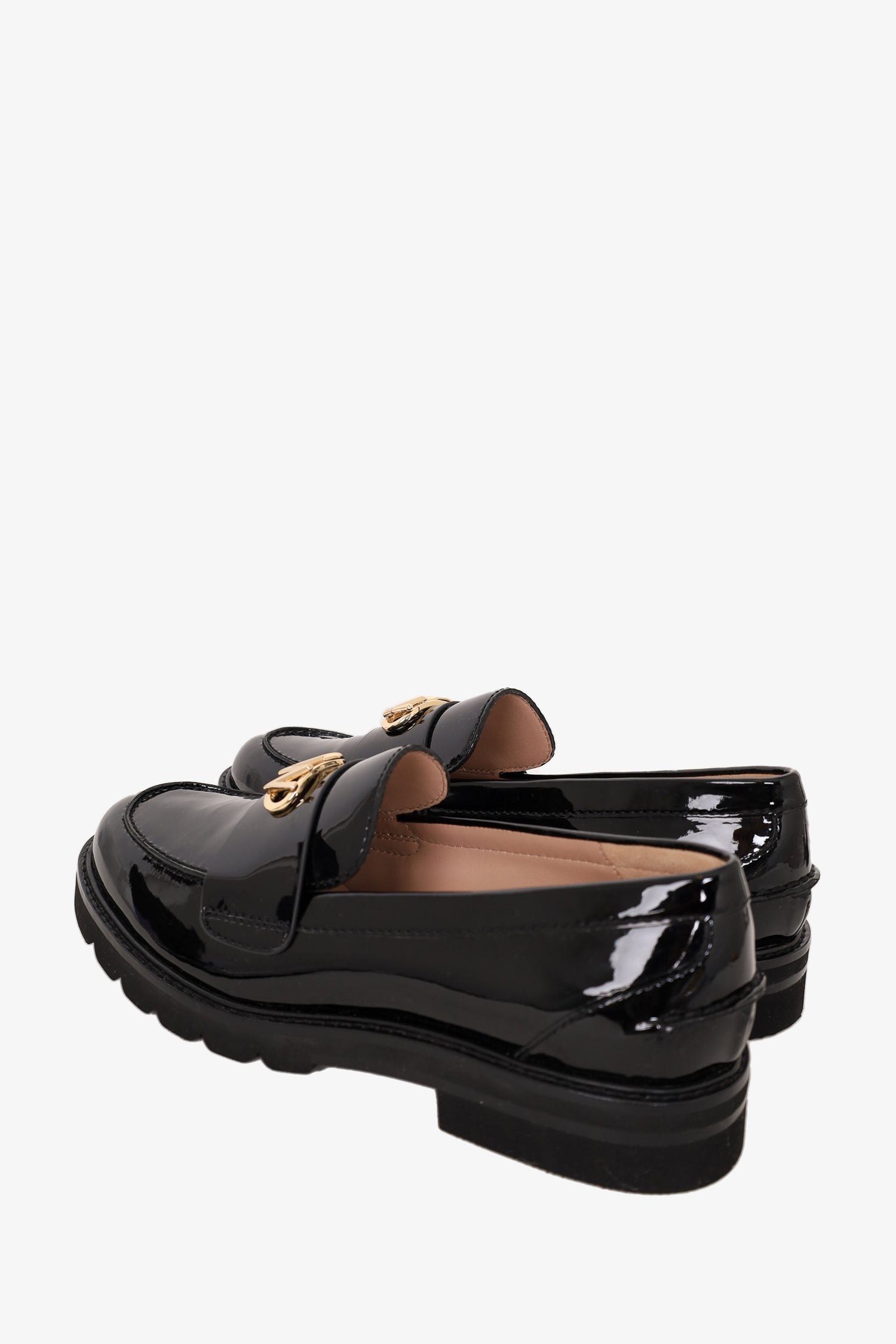 Refresh availabilityStuart Weitzman Black Patent Leather Loafer. Round toe. Slip on. Gold-toned hardware. Tonal stitching.