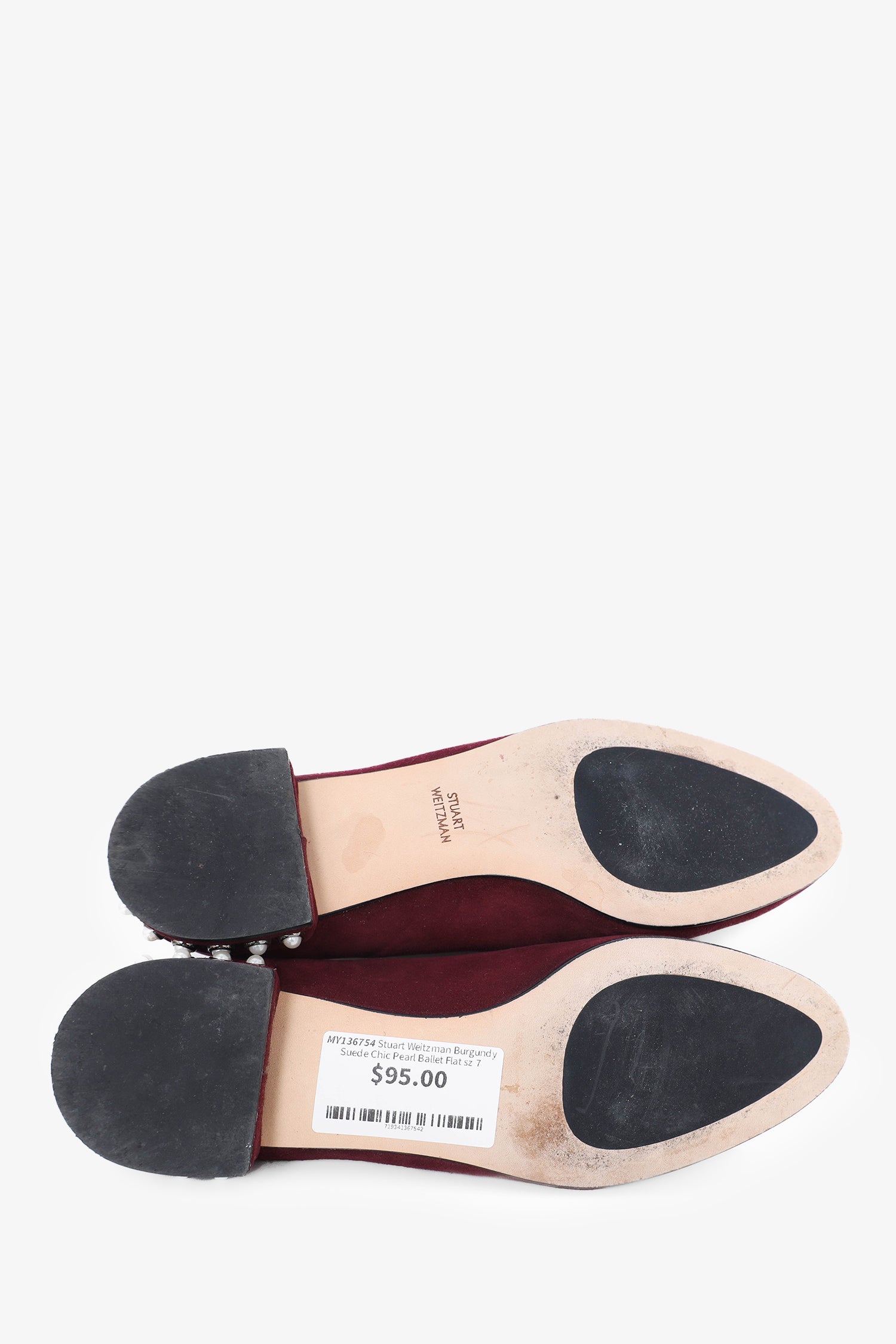 Refresh availabilityStuart Weitzman Burgundy Suede Chic Pearl Ballet Flat. Pearl detailing at along heel. Tonal stitching. Comes with box.