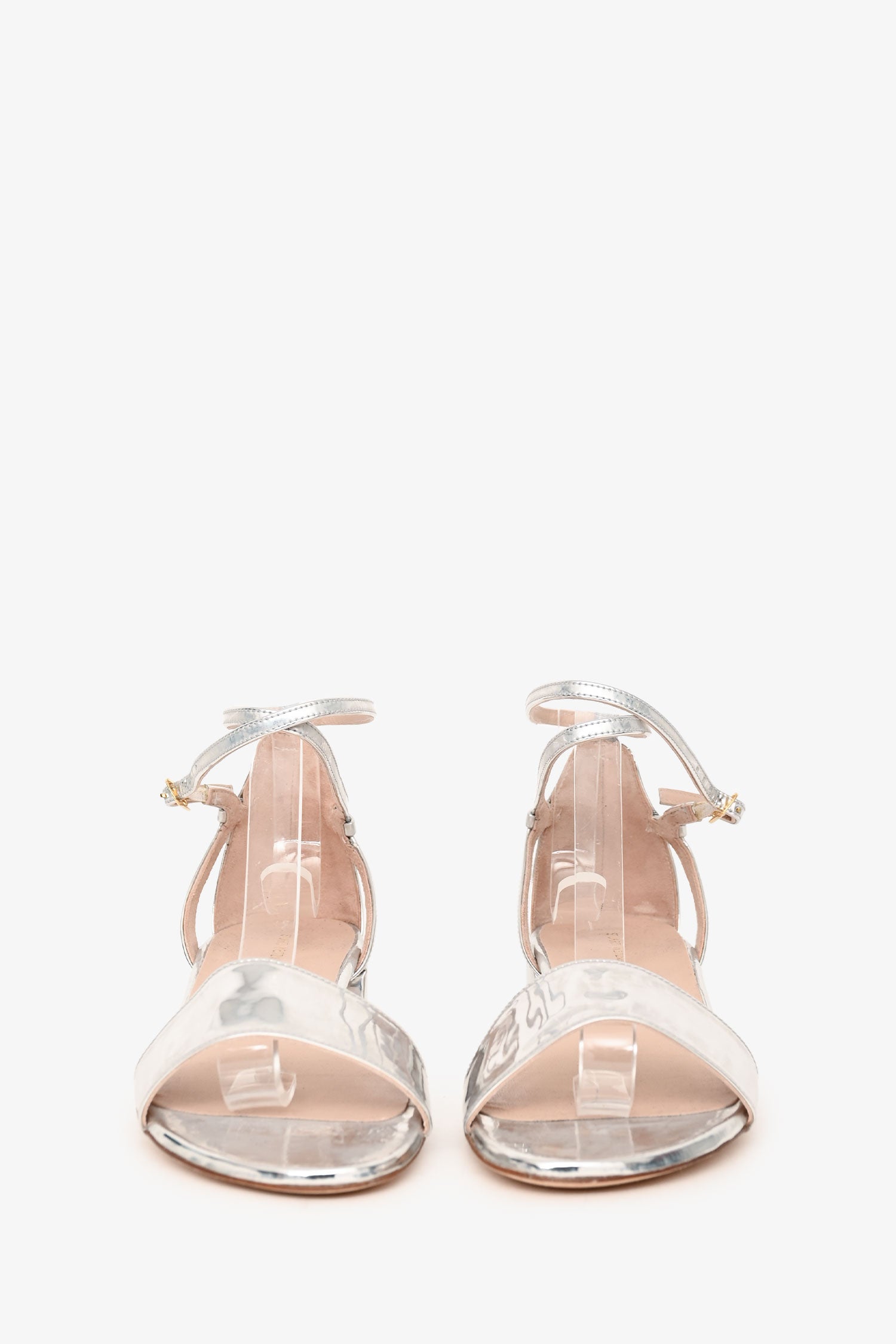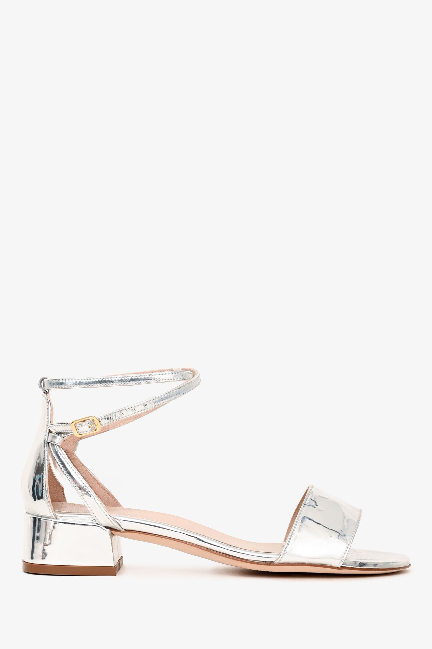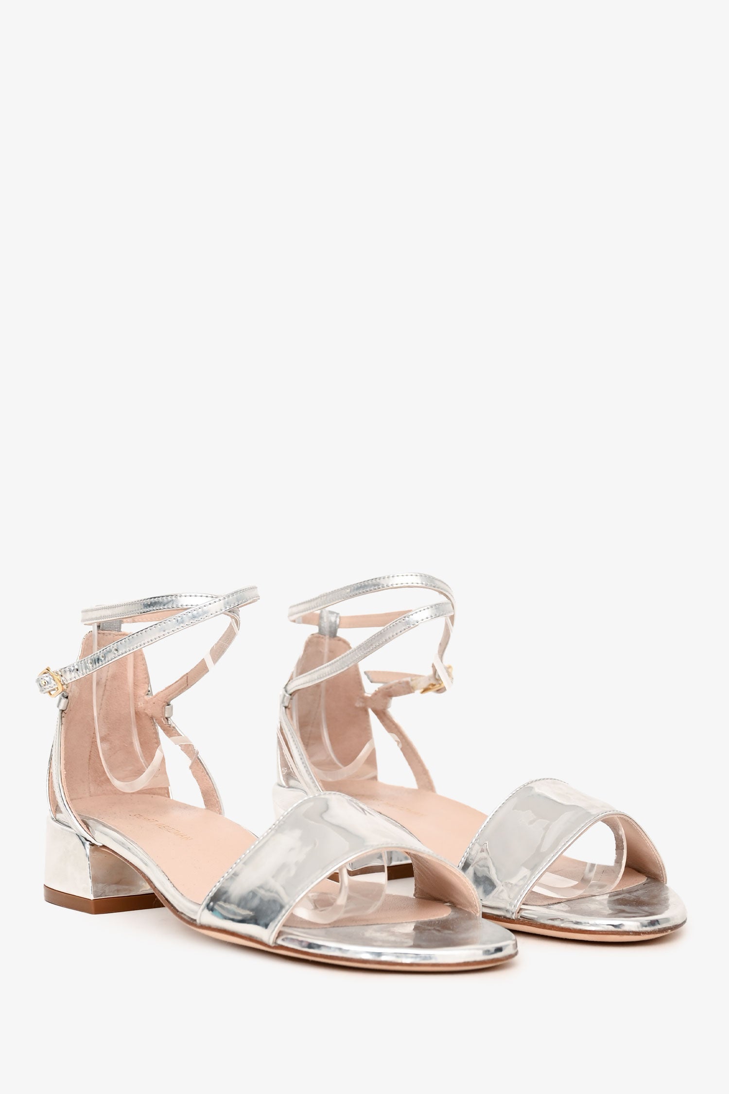 Refresh availabilityStuart Weitzman Silver Metallic Leather Sandals. Open toe. Slim toe and ankle straps. Adjustable buckle closure. Block heel. Tonal stitching.