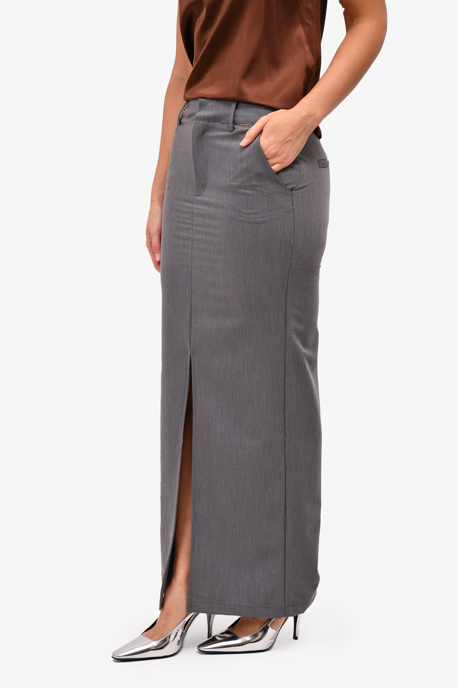 Refresh availabilitySuperdown Grey Business Maxi Skirt. Front hook and loop, button with zipper closure. Front slip pockets. Rear decorative pocket. Belt loops along waistline. Unlined. Tonal stitching.