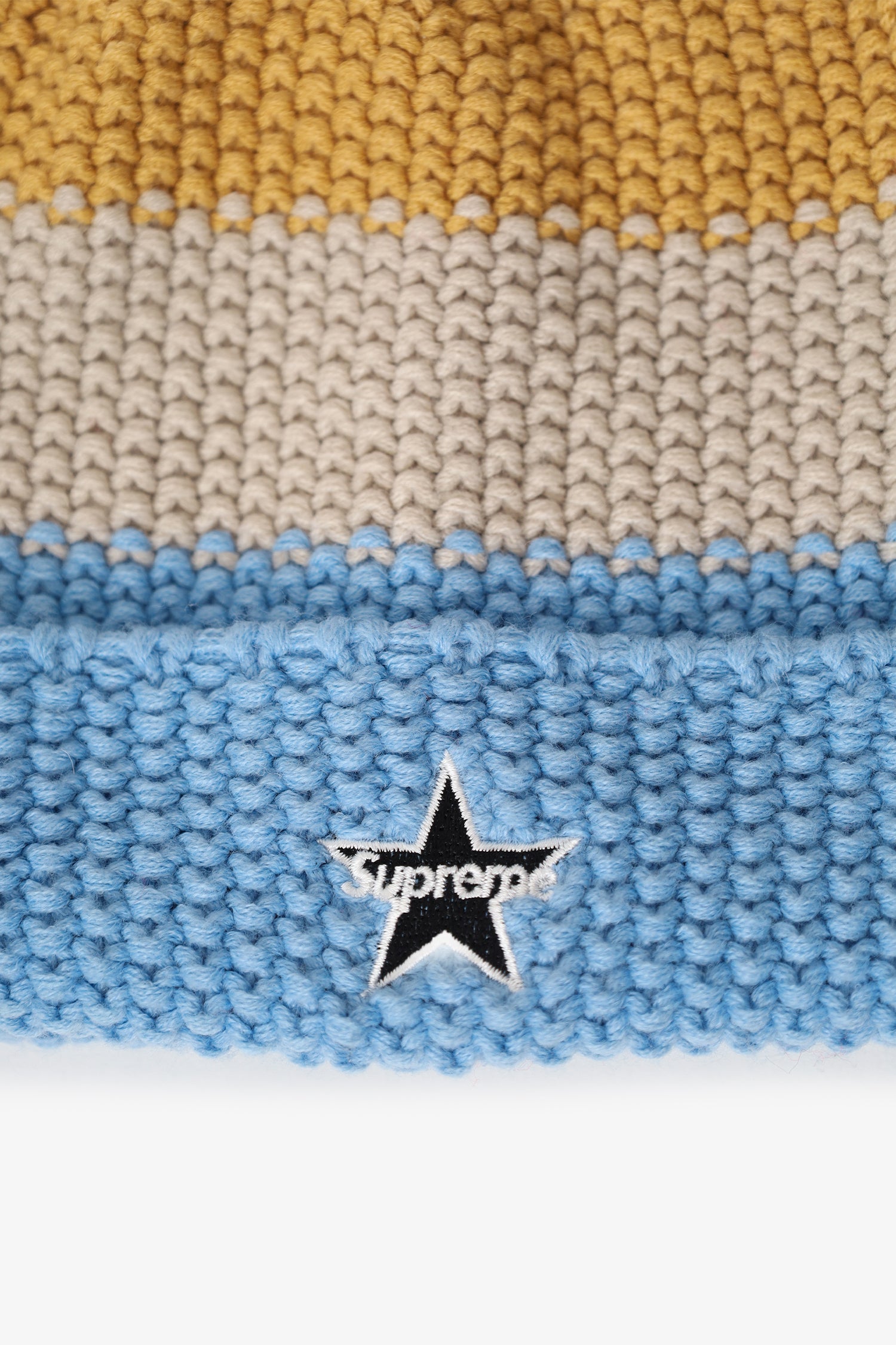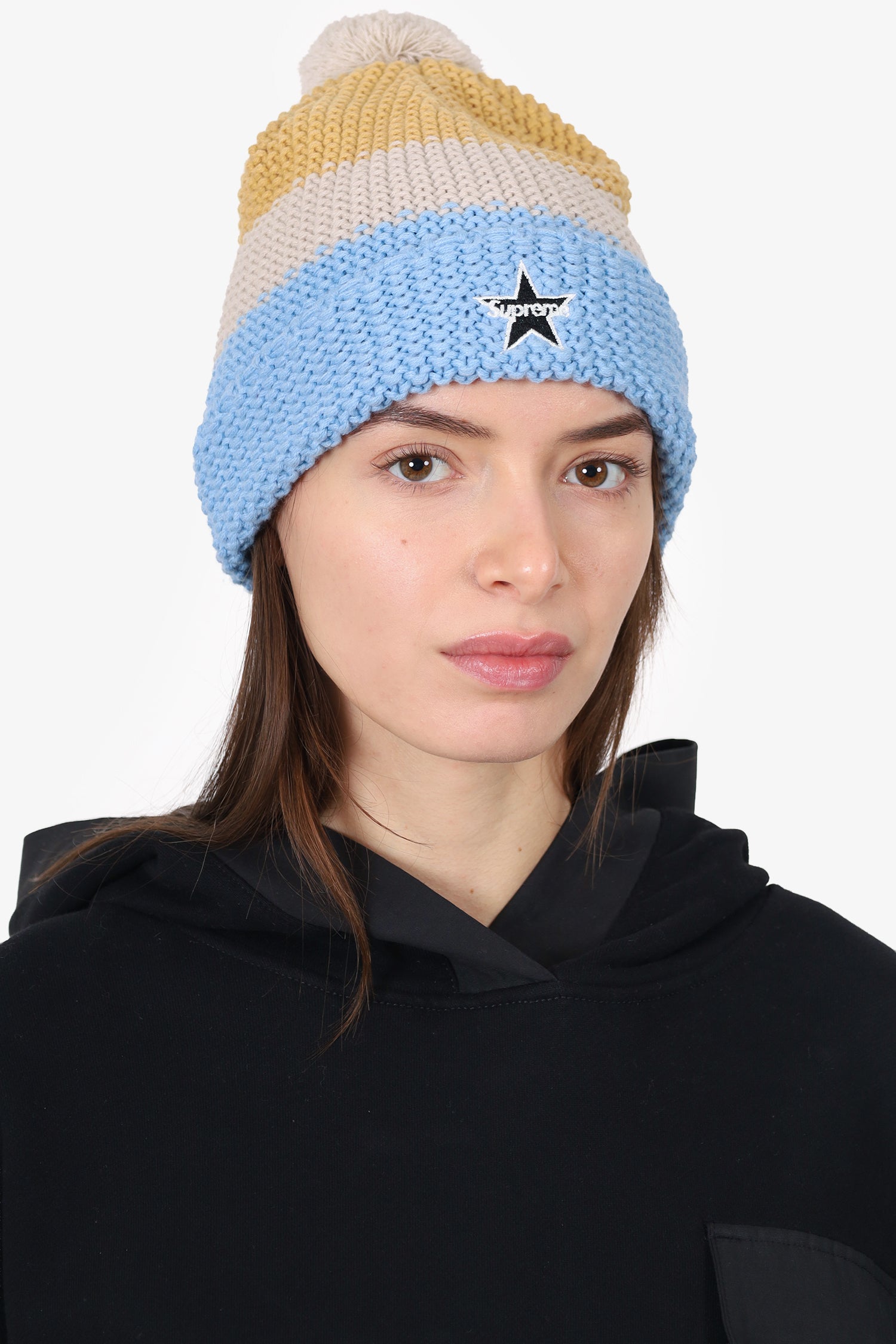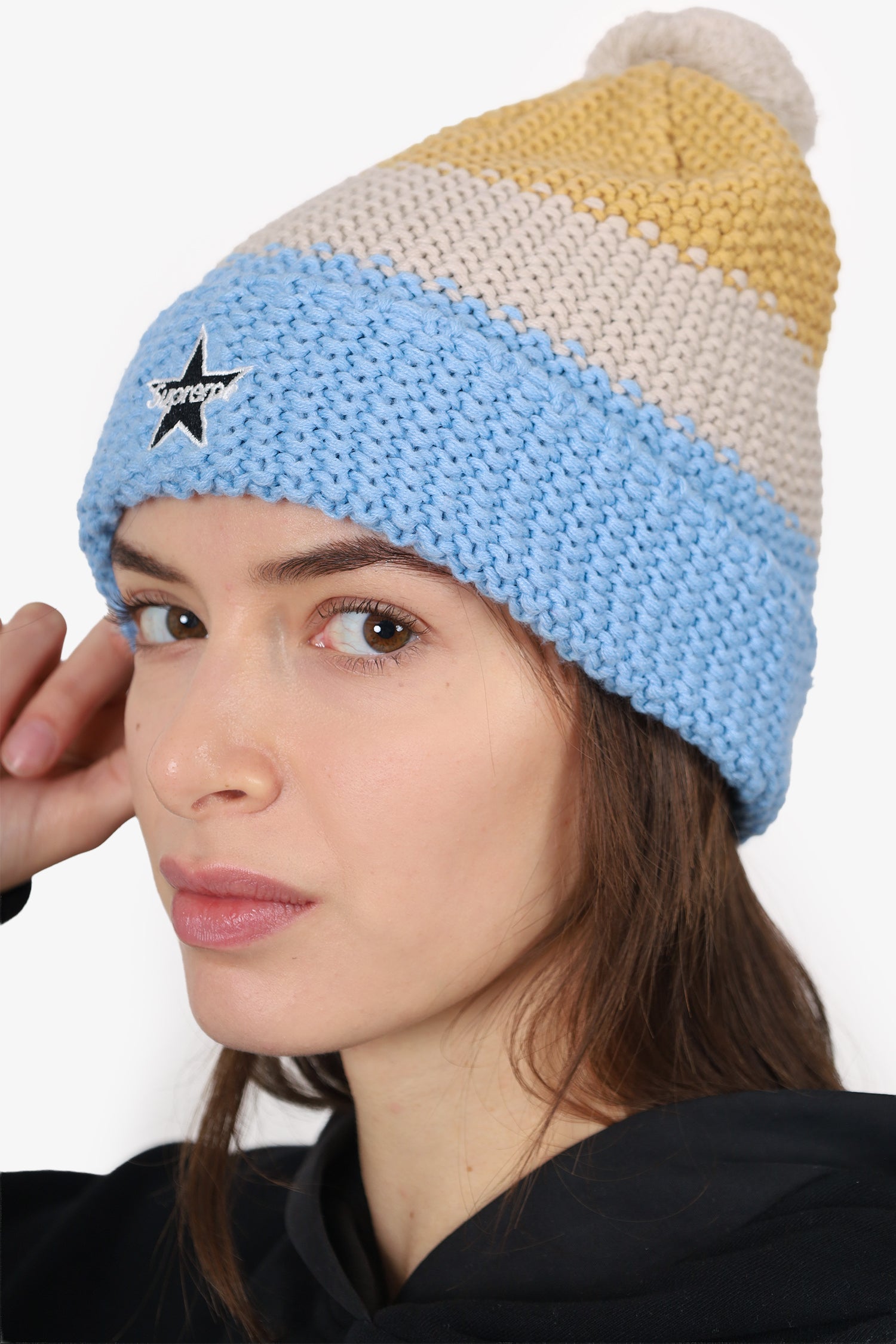 Refresh availabilitySupreme Beige/Blue Knit Bobble Hat. Pull-on. Logo embellishment to front. Contrast and tonal stitching.