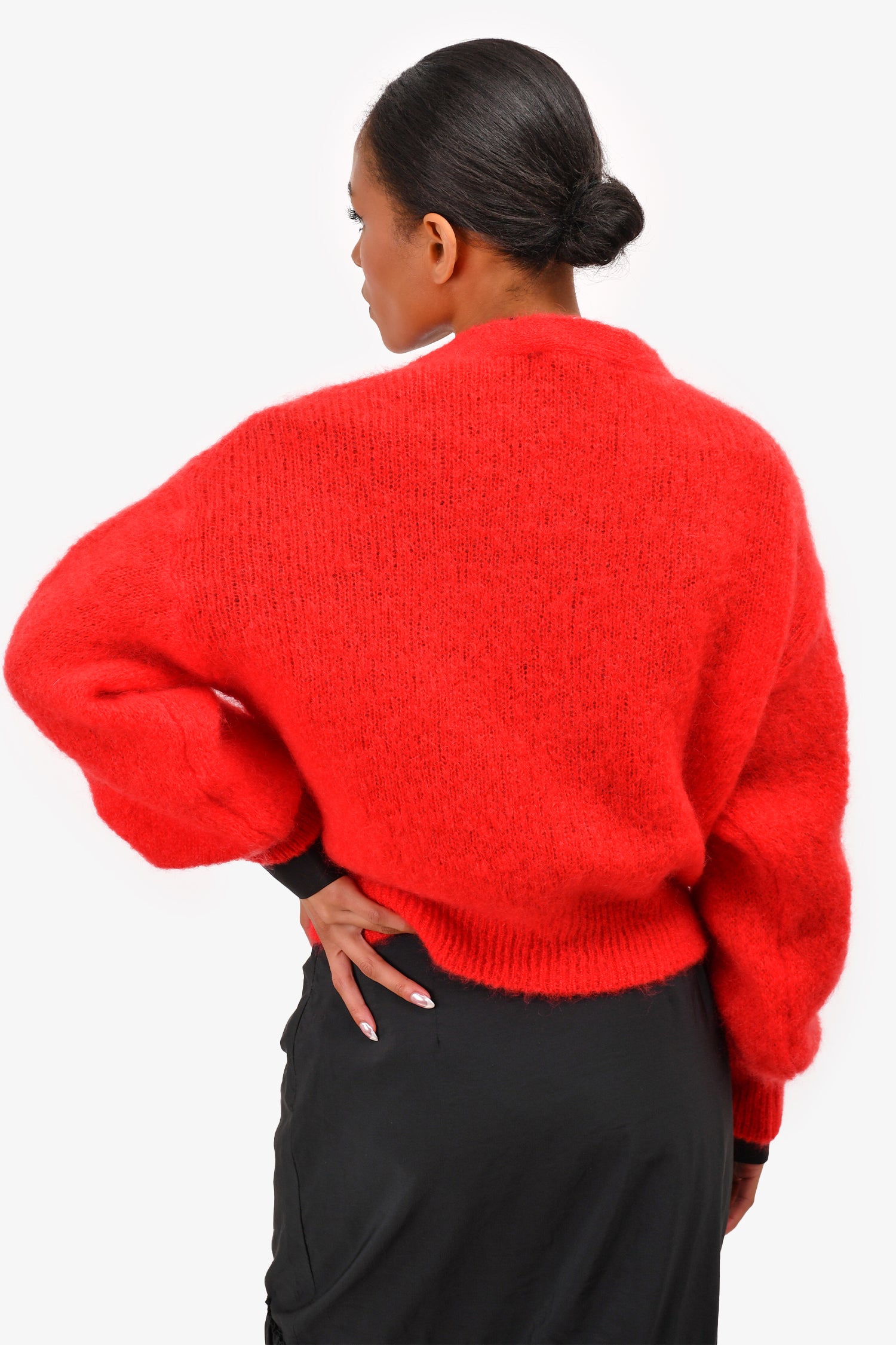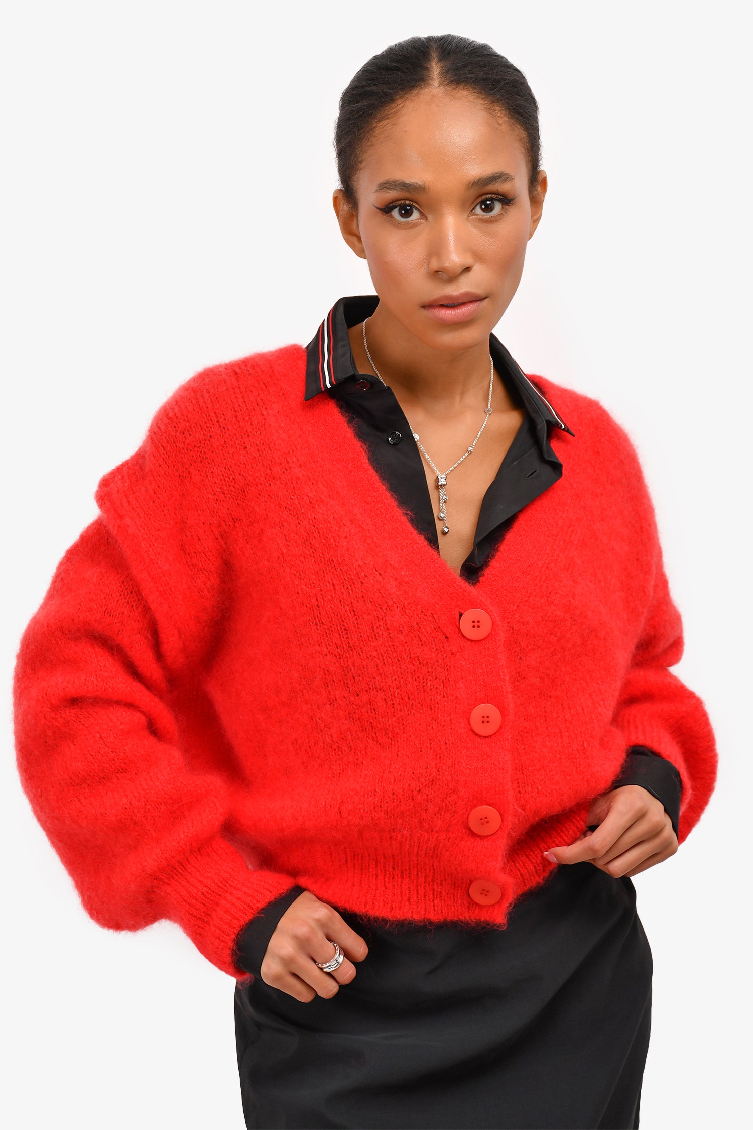 Refresh availabilitySurprise Red 'Monica' Cardigan. Ribbed at the sleeves and hem. Button-up closure. Tonal stitching.