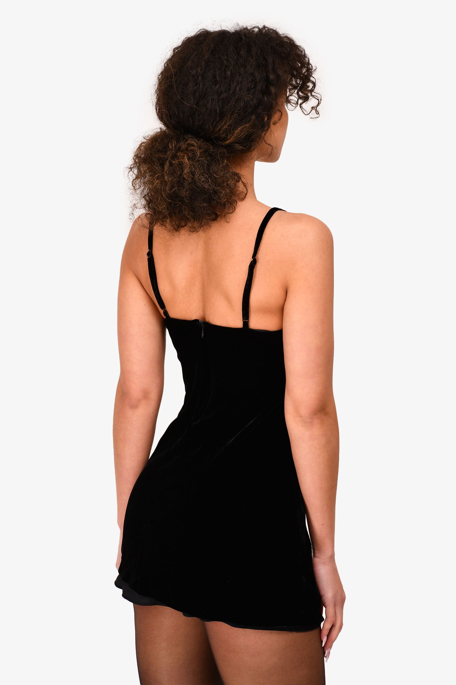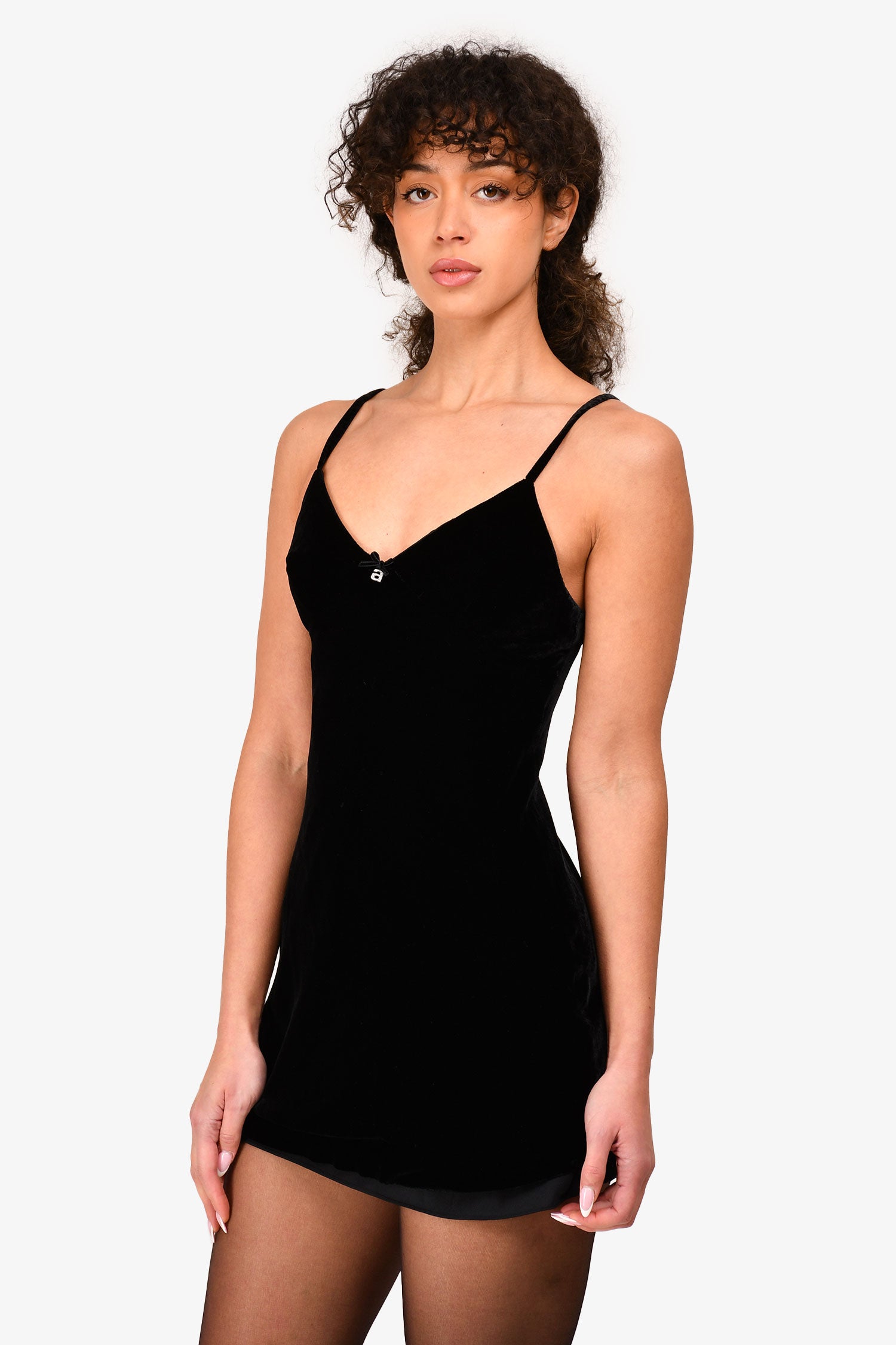 Refresh availabilityT By Alexander Wang Black Velvet Crystal Embellished Logo Dress. Rear zip-up with loop and hook closure. Bow and initial charm details. Silver-tone hardware. Lined. Tonal stitching.