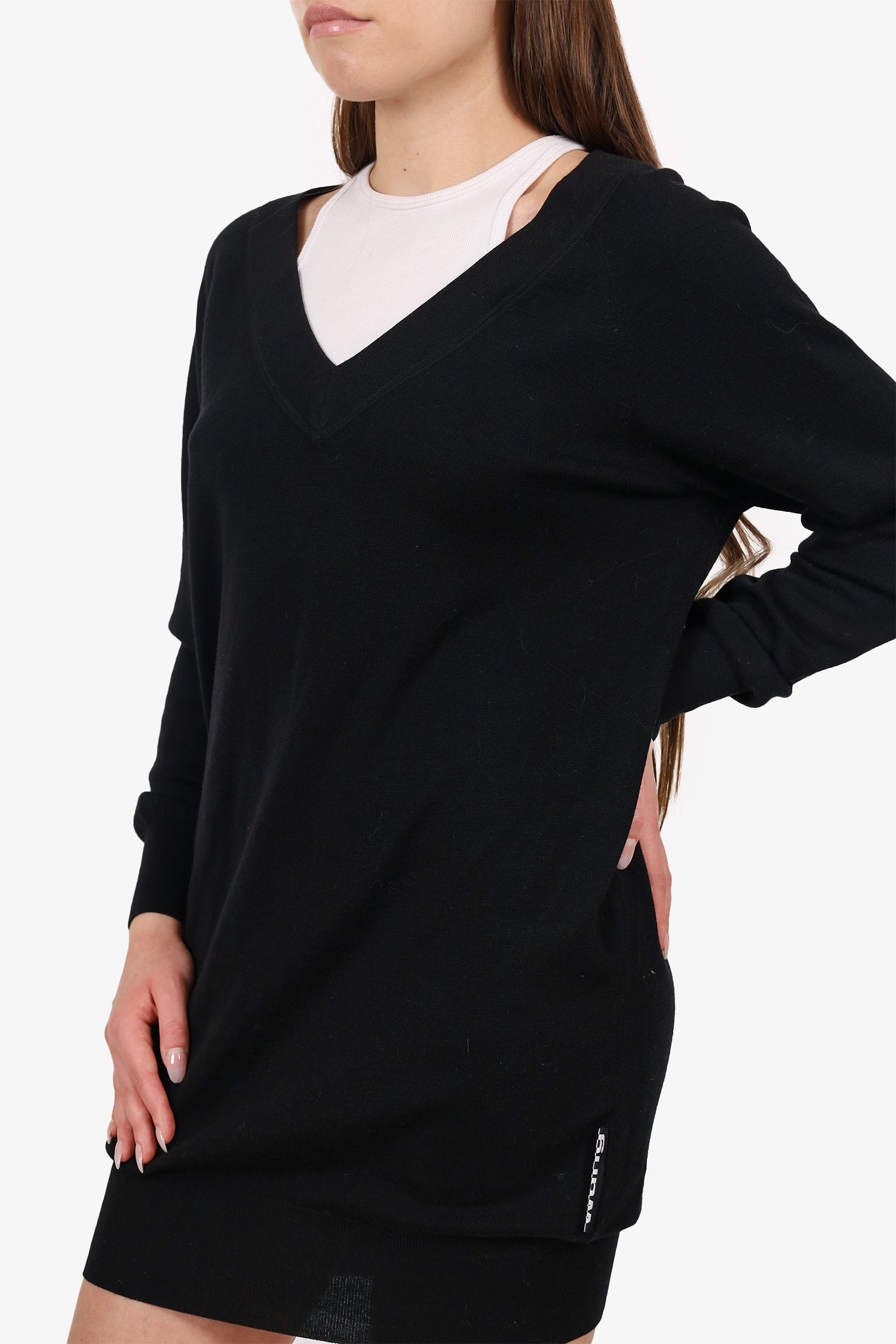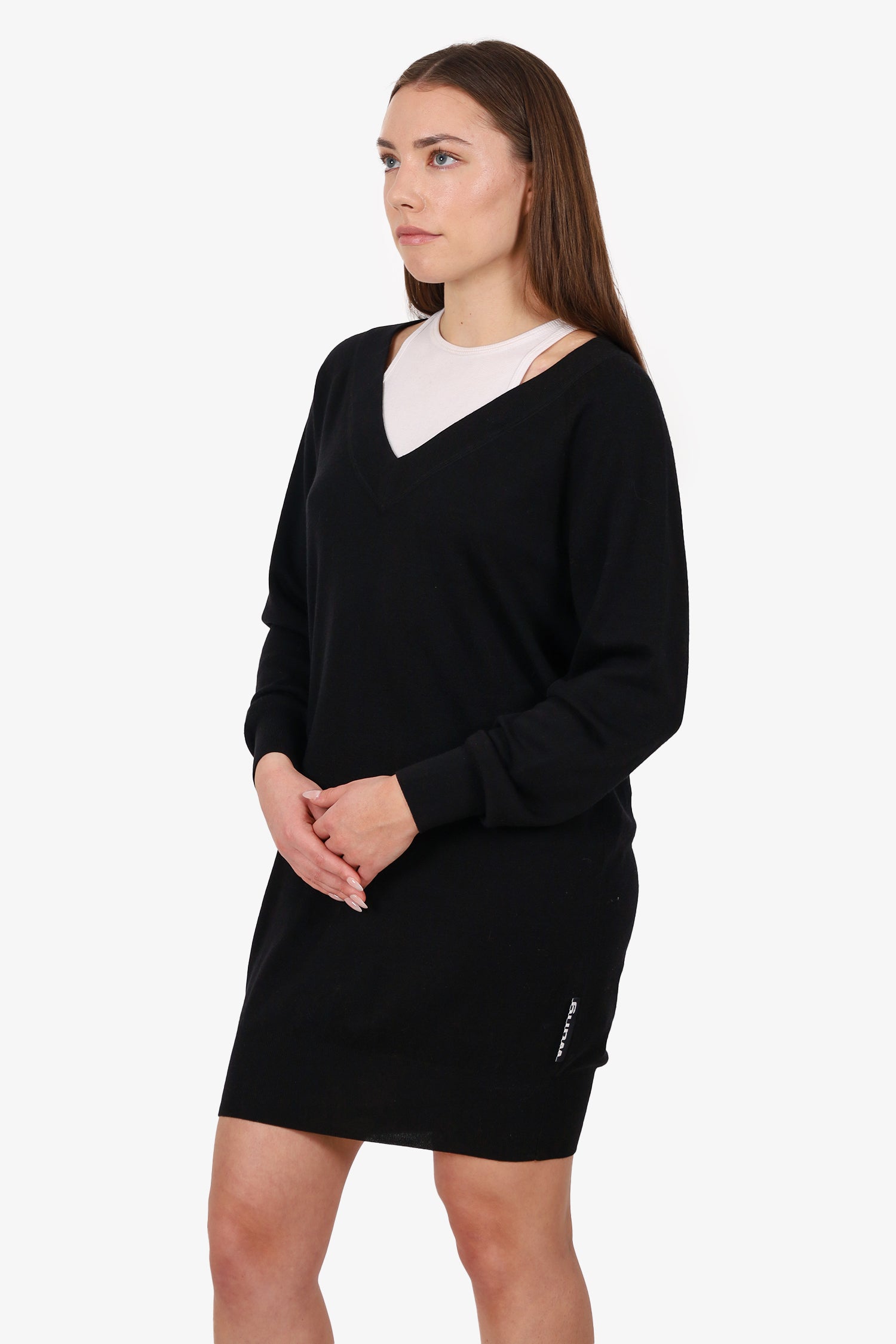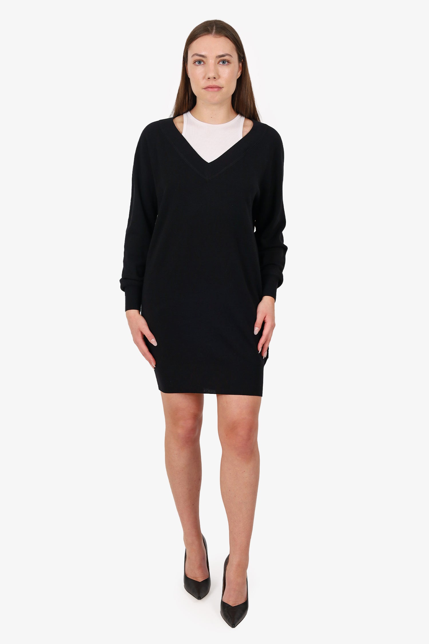 Refresh availabilityT By Alexander Wang Black Wool Sweater Mini Dress With Tank Layer. Pull-on. Round-neckline. Layered tank design. Ribbed sleeve cuffs, neckline and elasticated bottom hem. Logo tab on bottom left exterior. Tonal stitching.