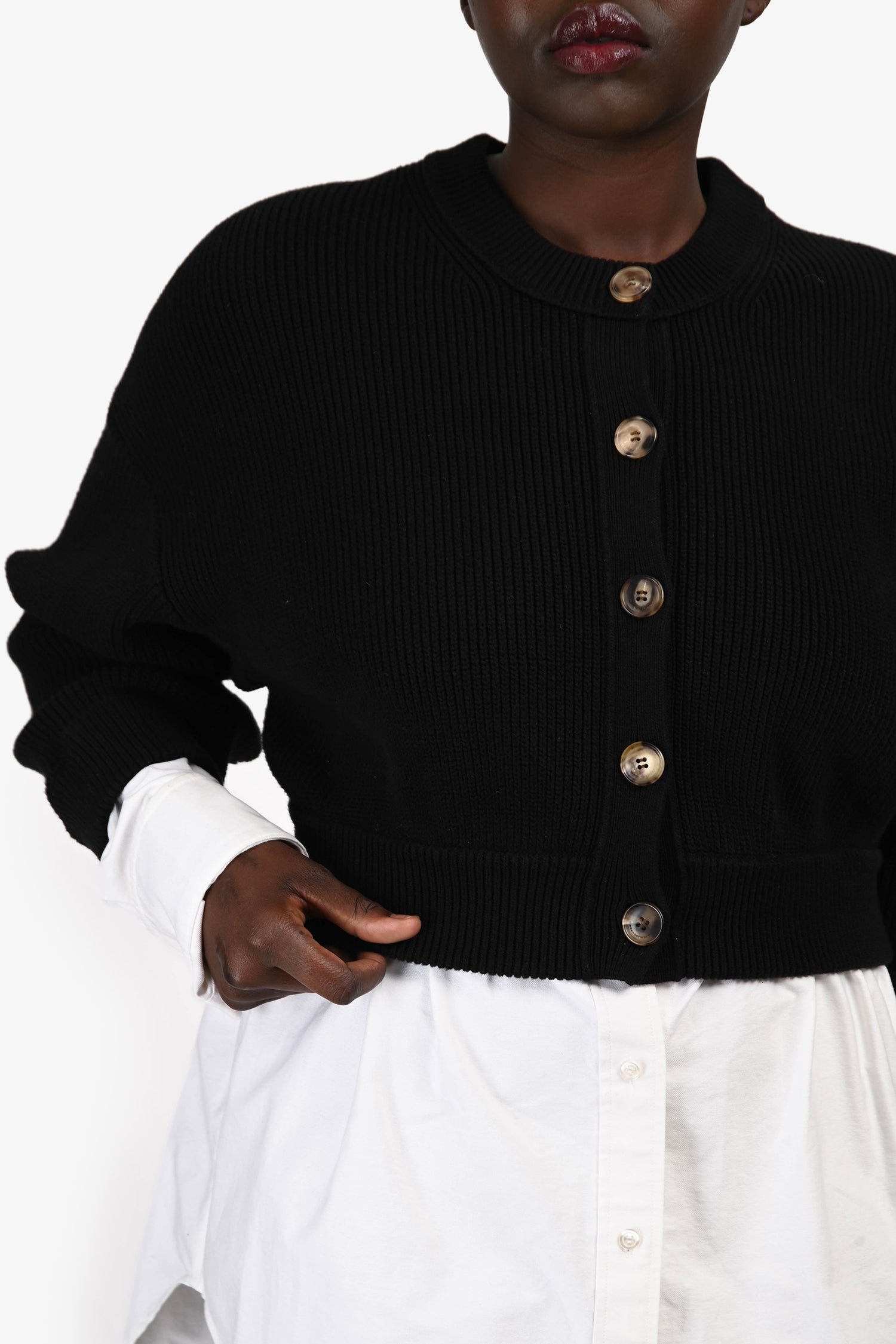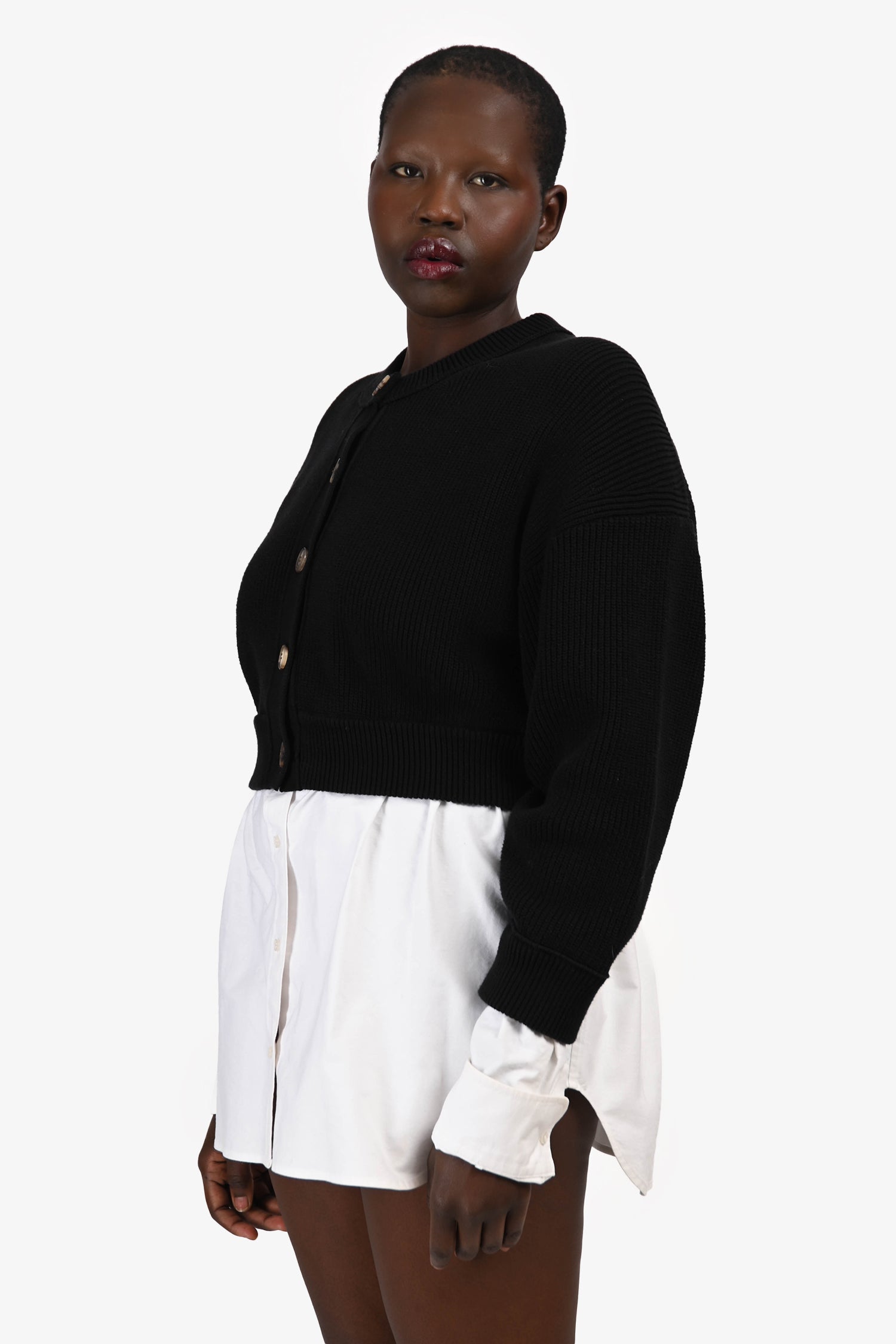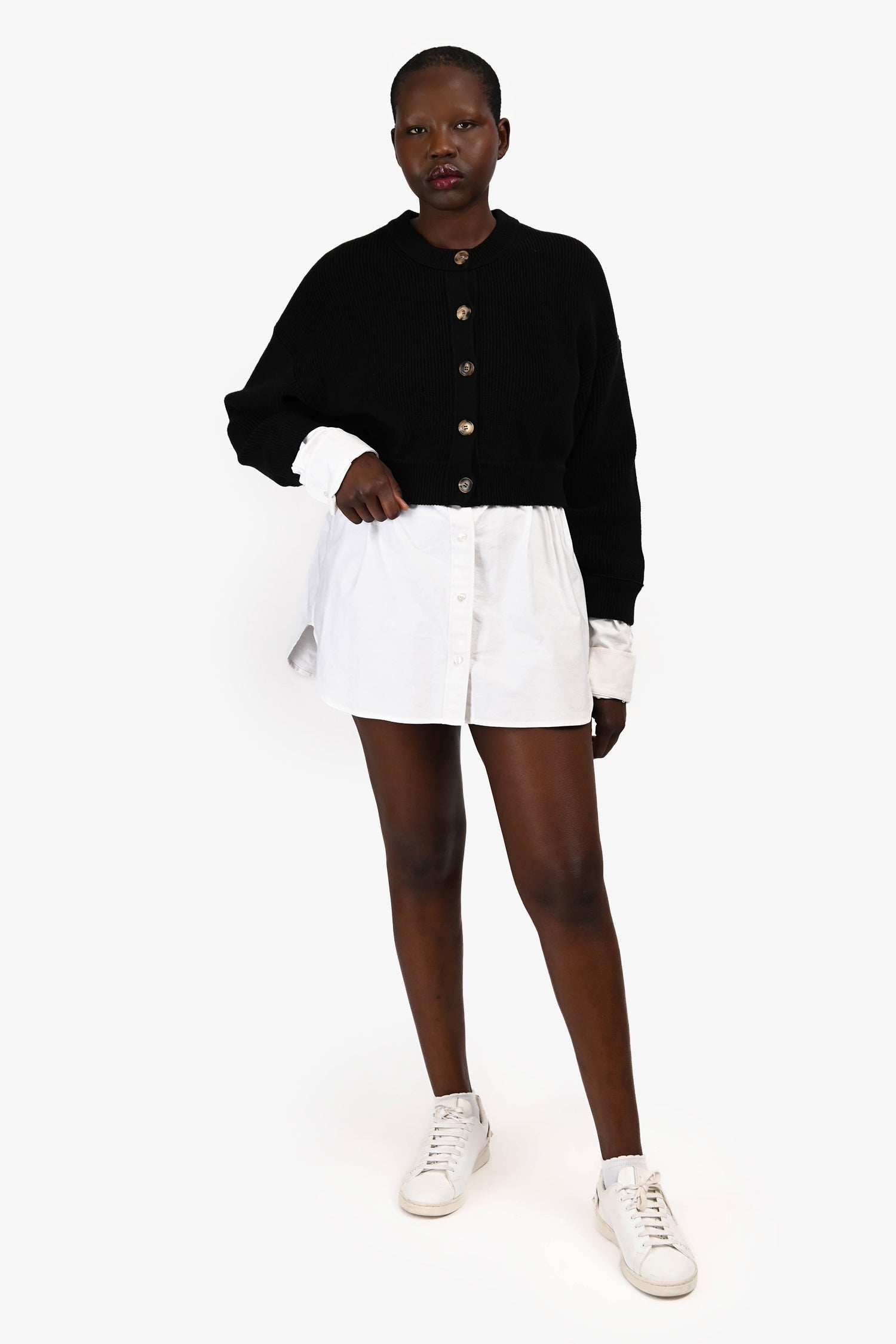 Refresh availabilityT by Alexander Wang Black/White Double Layered Cardigan Shirt Dress. Slip-on. Collarless neckline. Front button-up closure. Cuffs with button-up closure. Layered shirt-and-cardigan construction. Rear cut-out detail in the knit construction. Unlined. Tonal stitching.
