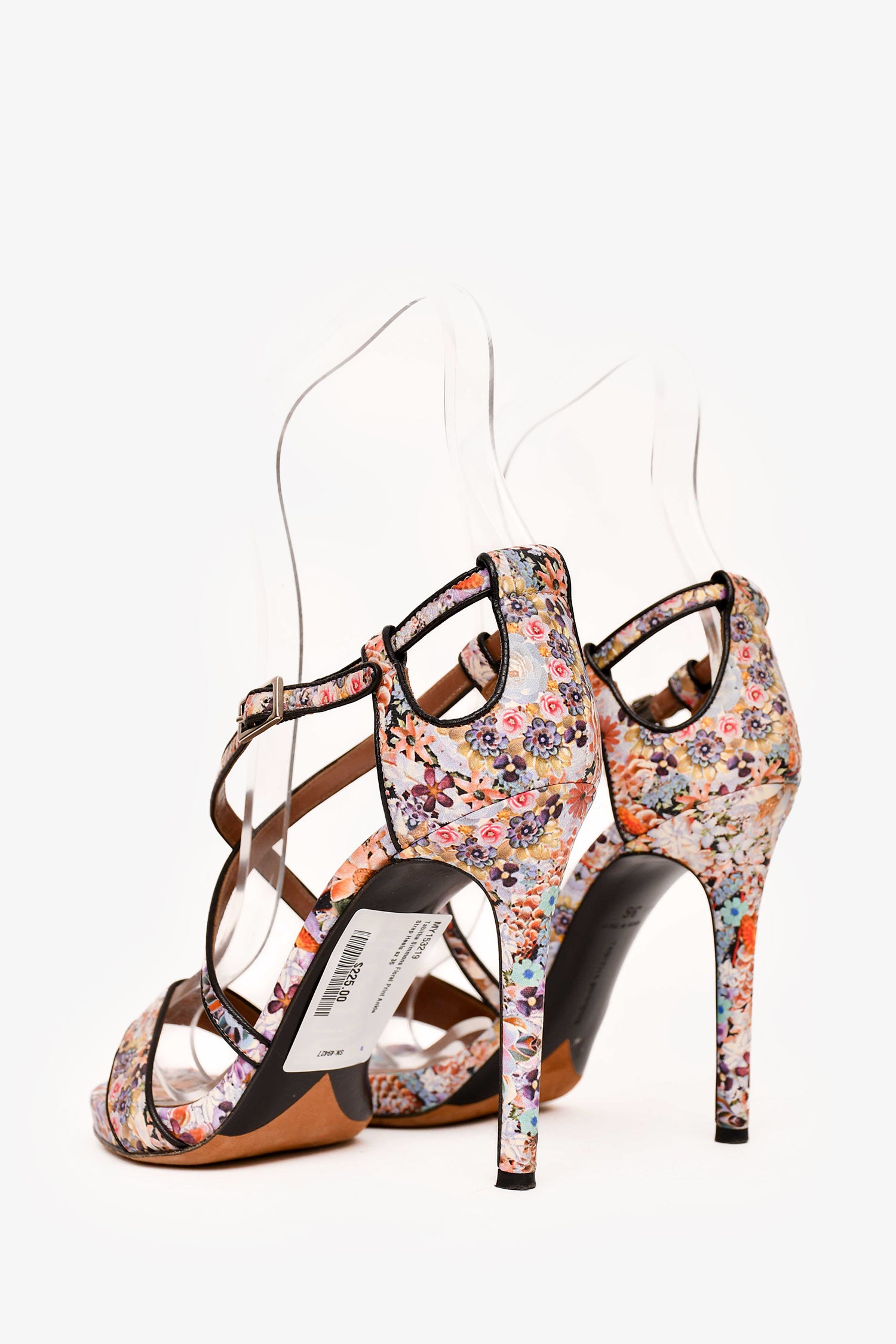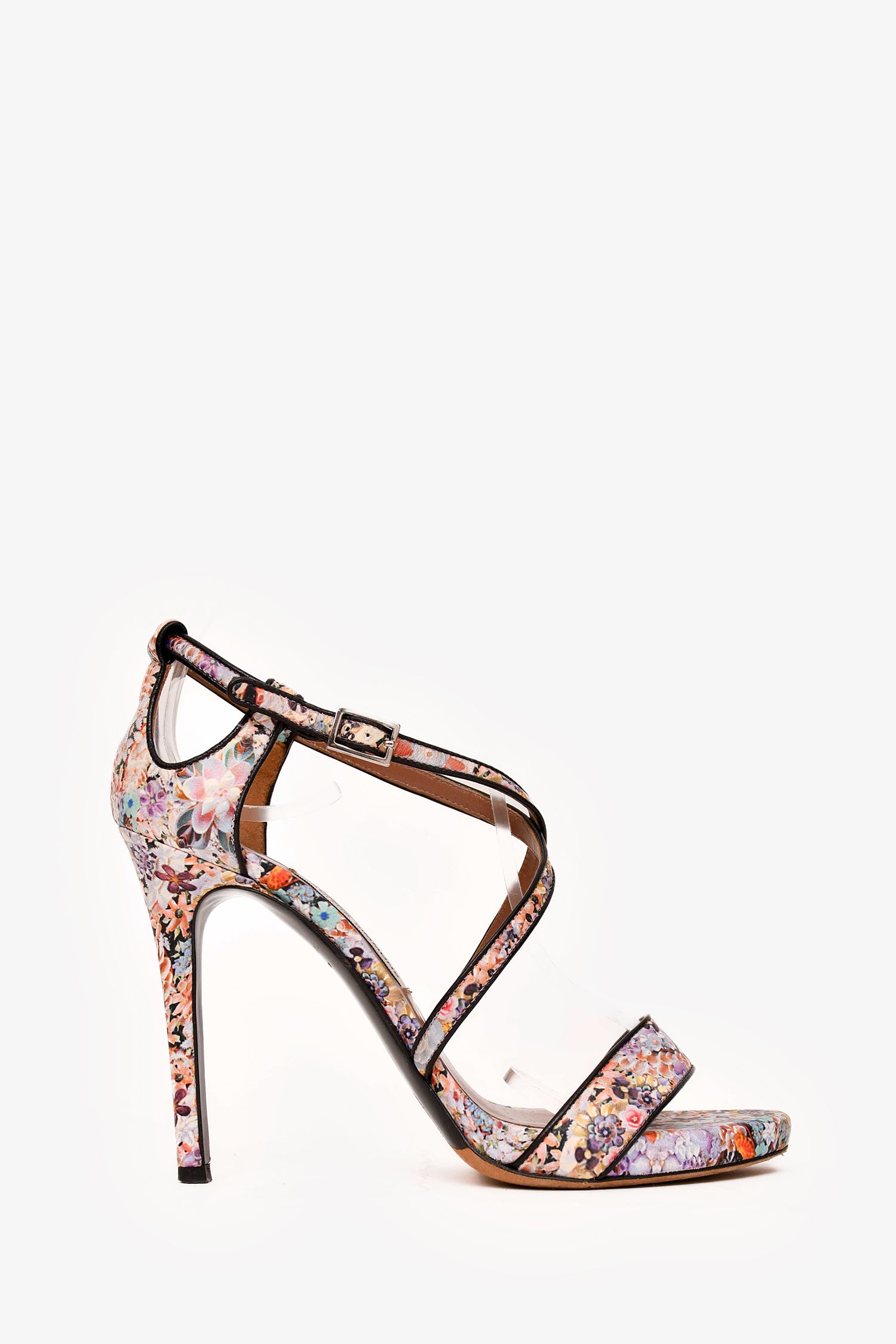 Refresh availabilityTabitha Simmons Floral Print Ankle Strap Heels. Slip-on. Adjustable ankle strap with buckle closure. Contrast leather trim. Tonal stitching.