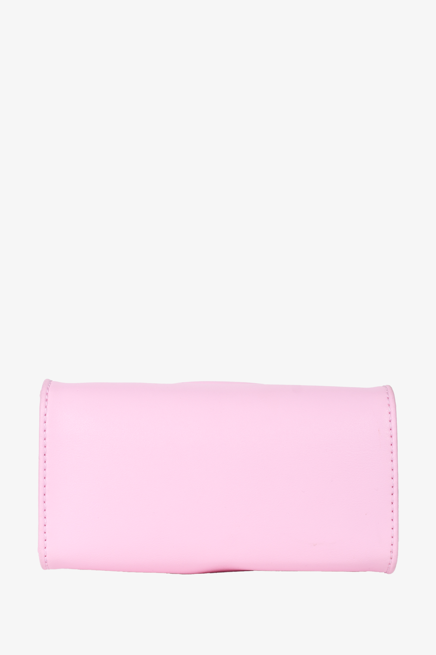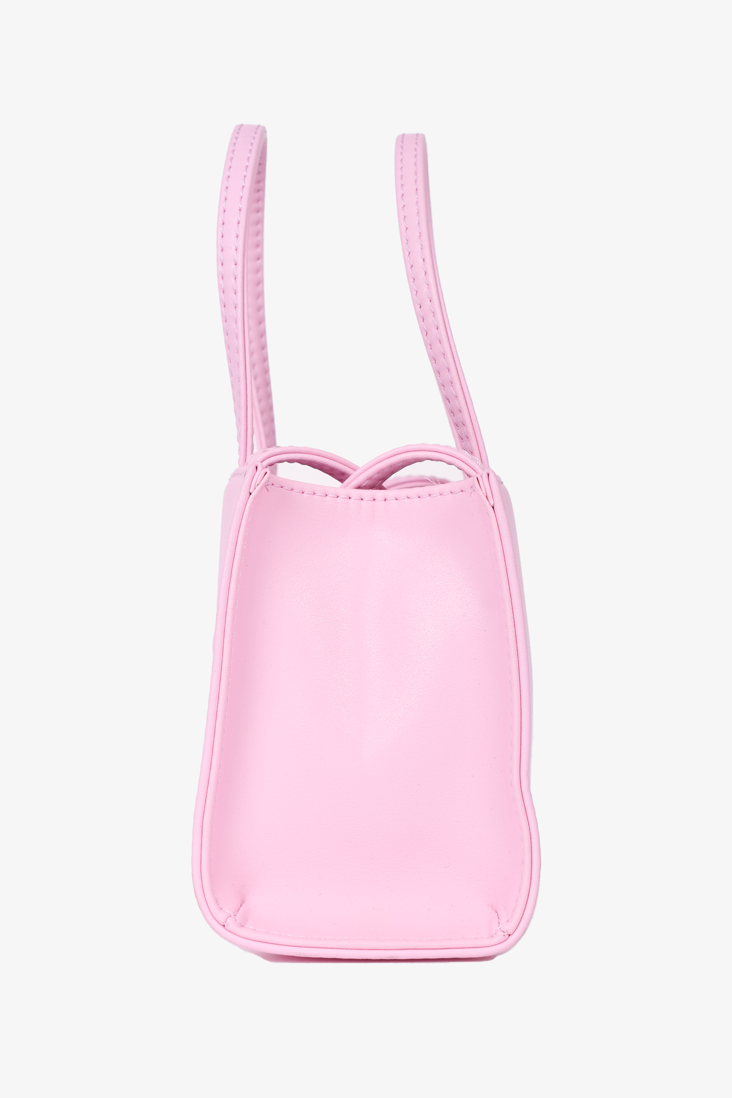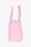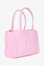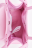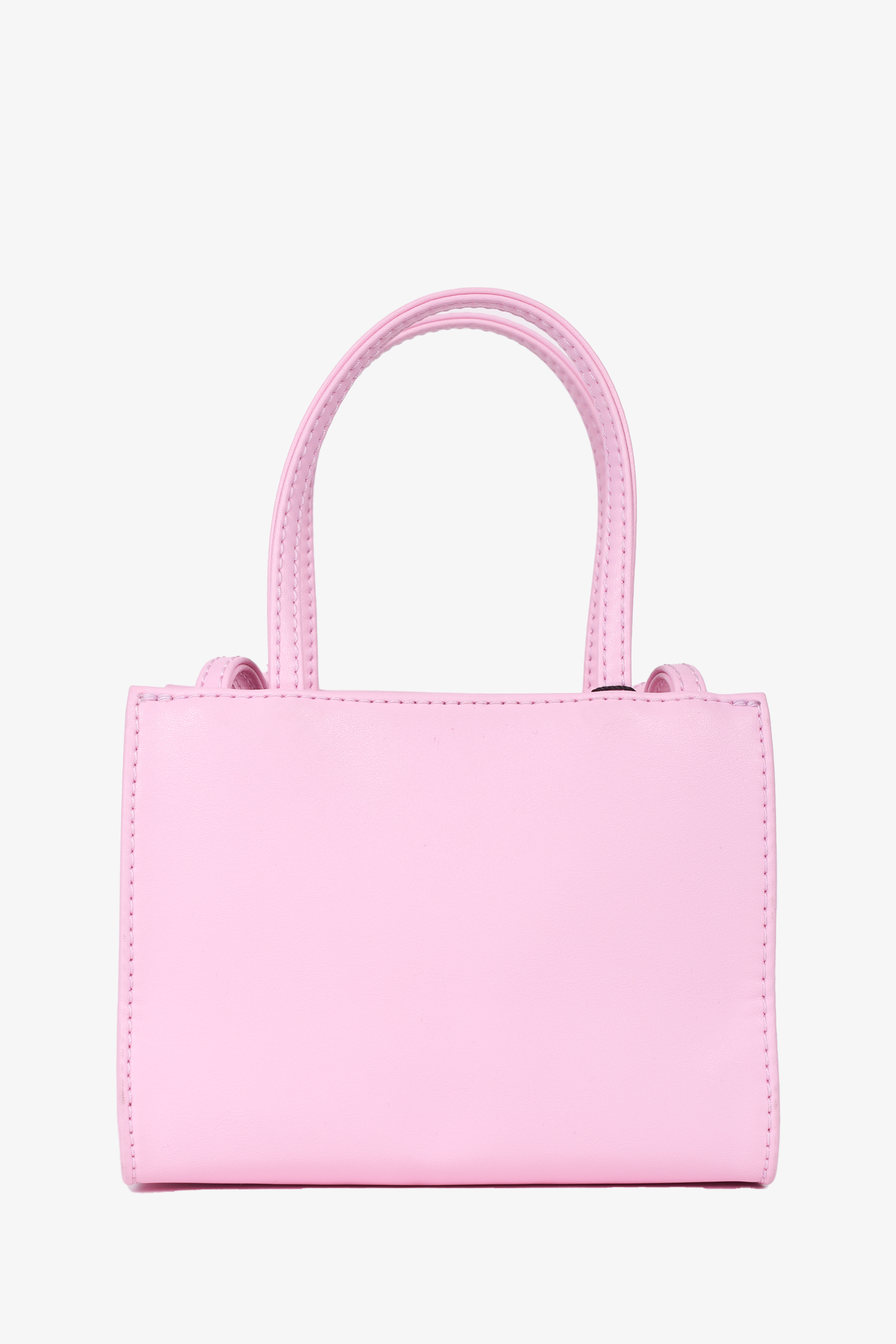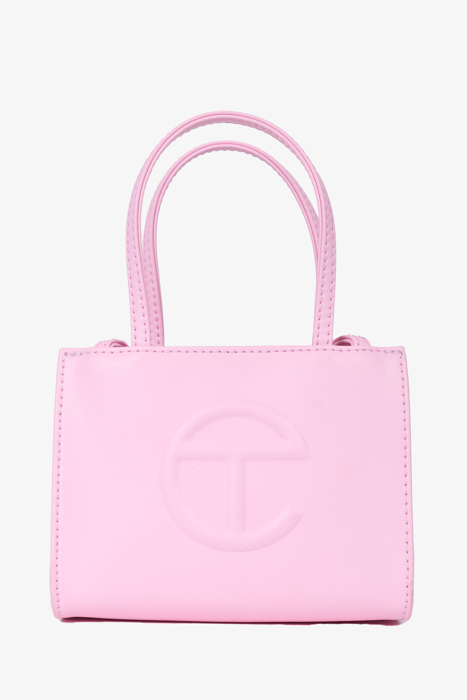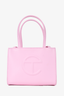 Telfar Pink Faux Leather Small Crossbody Bag. Dual handles. Interior magnetic button closure. Tonal textile interior lining. Open interior. Silver-tone hardware. Tonal stitching.