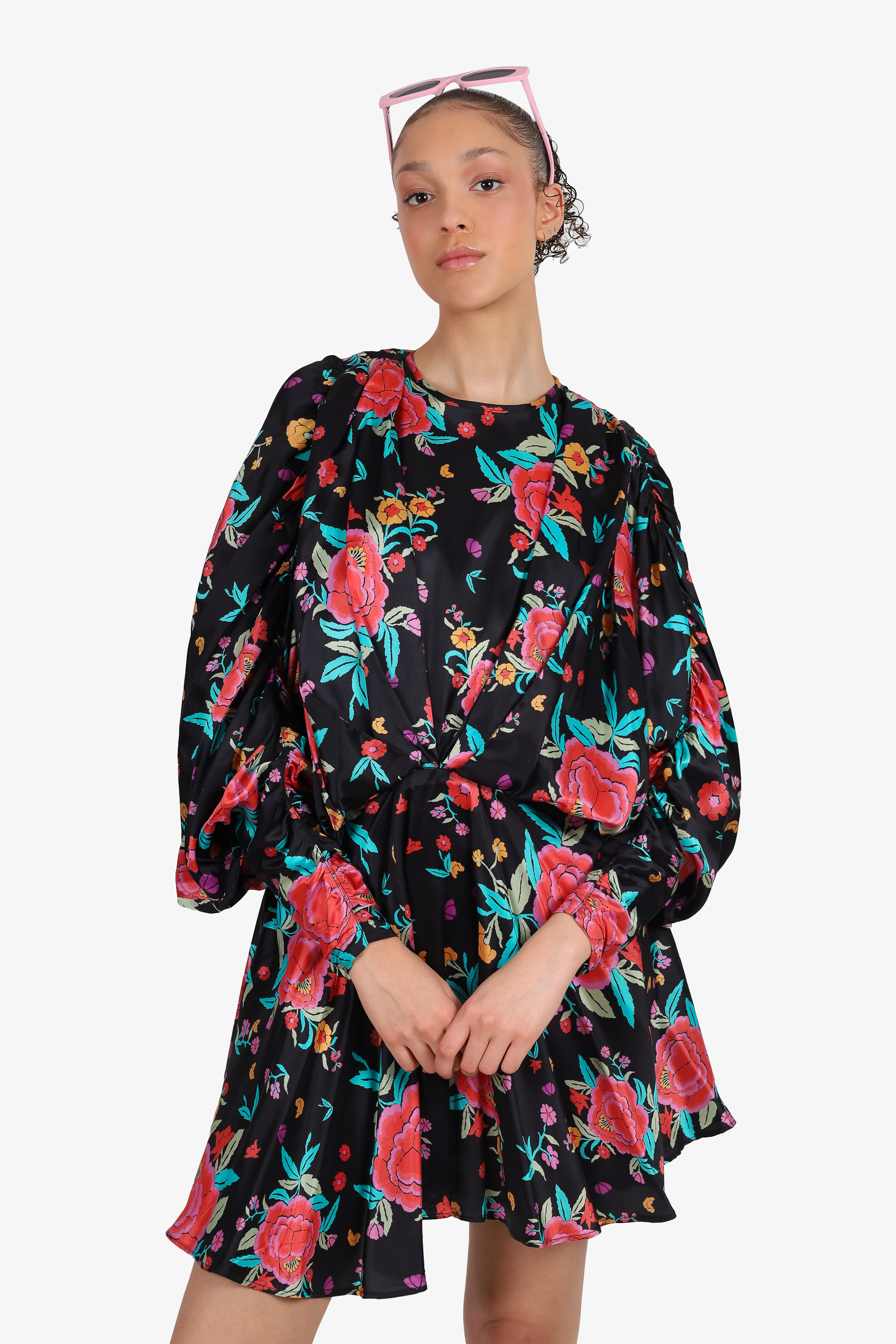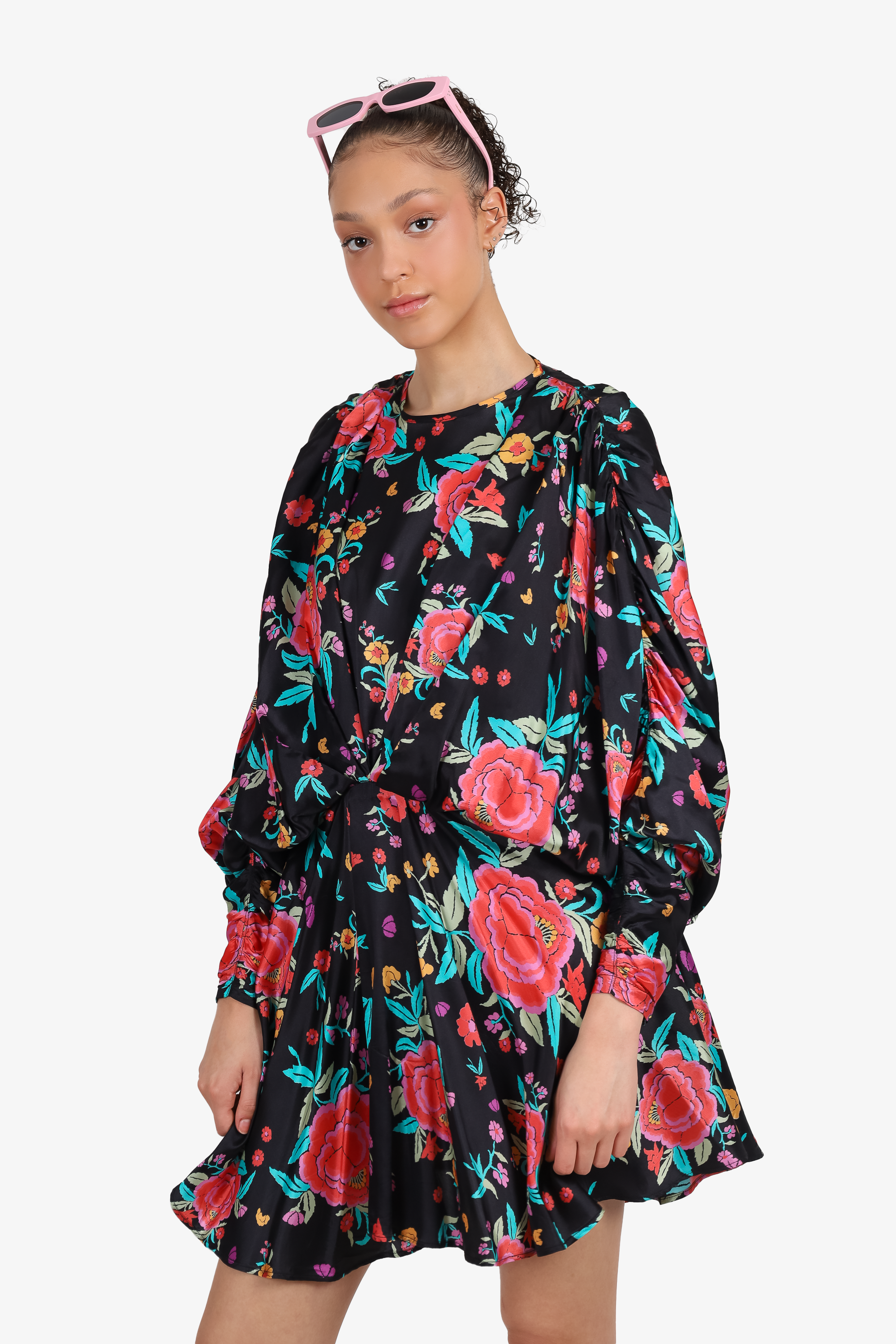 Refresh availabilityThe Attico Black Floral Satin Mini Dress. Rear tie and side zip closure. Puff sleeve. Cinched detail in front centre. Unlined. Tonal stitching.